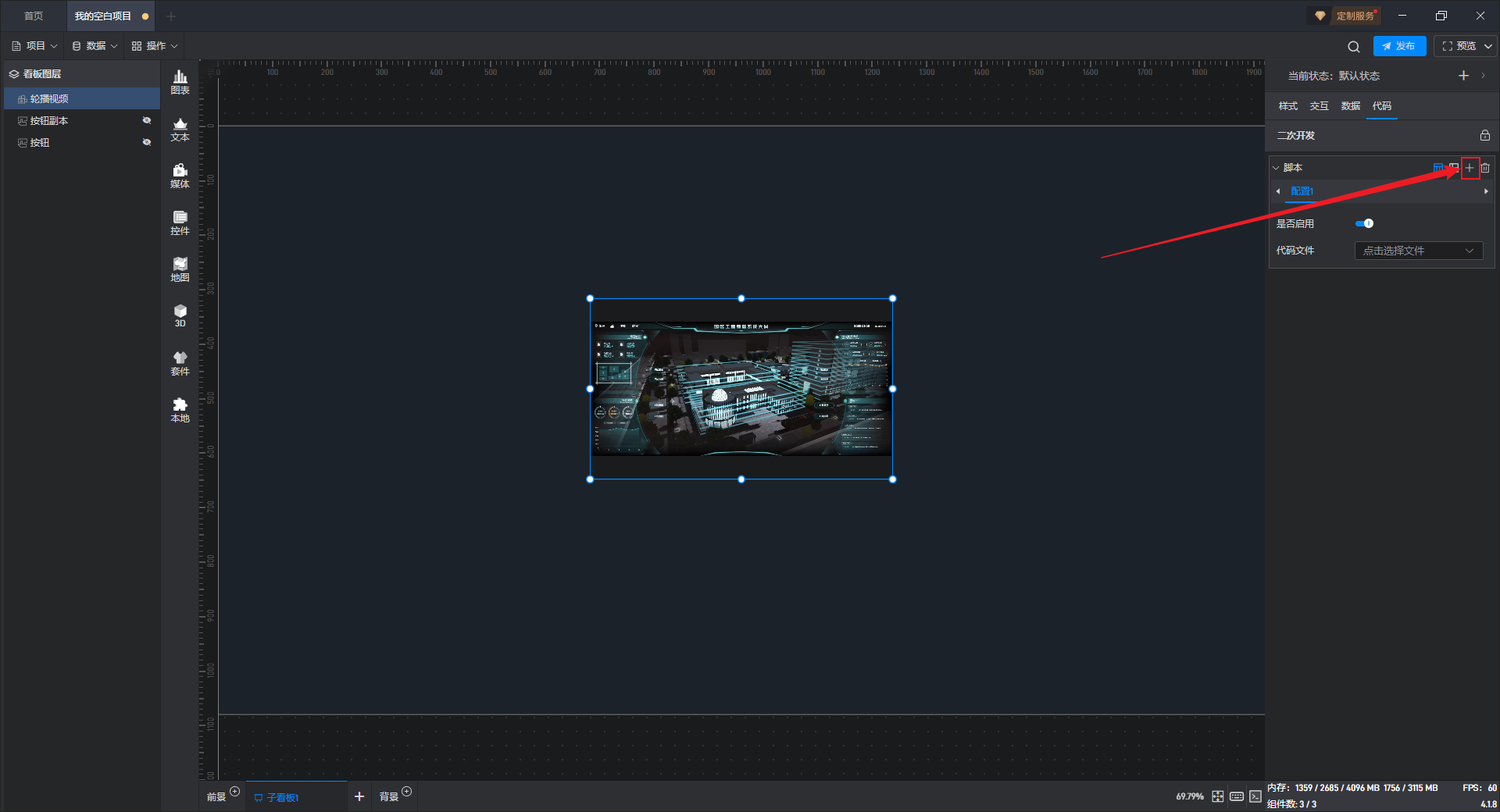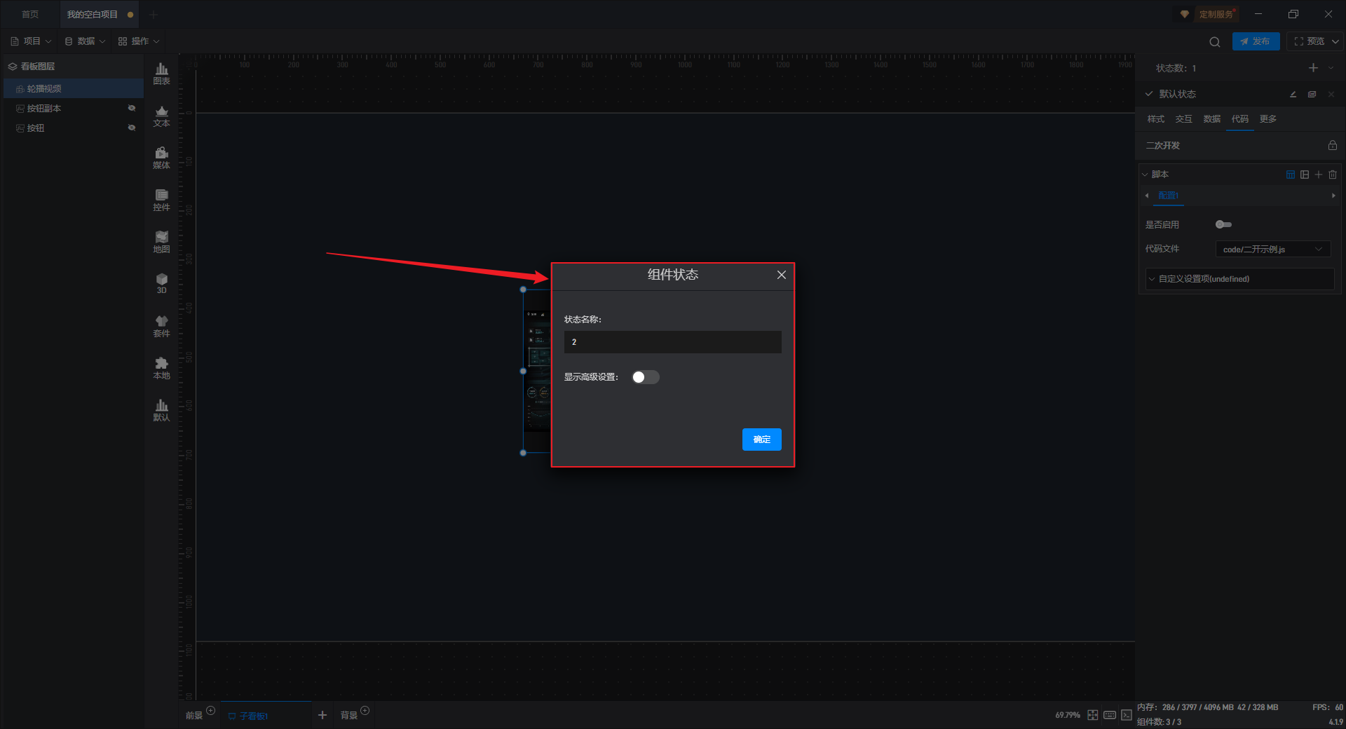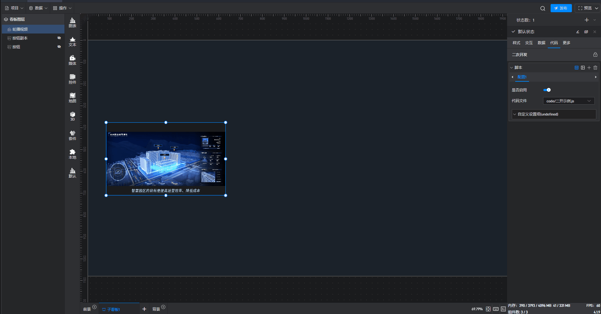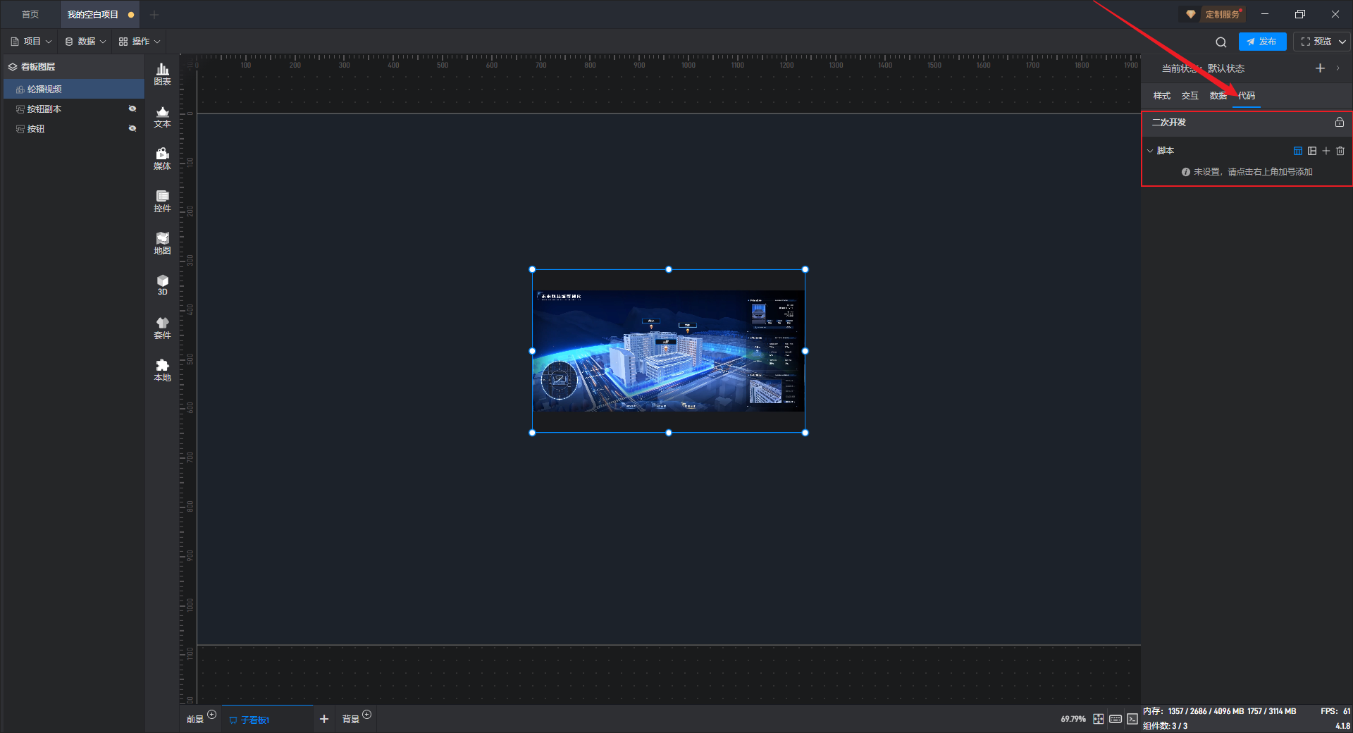 点击选中组件,在右侧“代码”设置窗口中可以对组件进行二次开发设置。