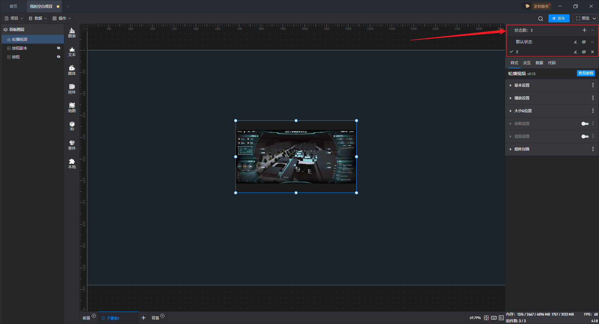 多状态主要用于通过数据条件或是点击交互(通常是点击其他组件来触发本组件的状态切换)来切换组件设置项的场景,这里的设置项包括组件的样式、交互、数据和代码。