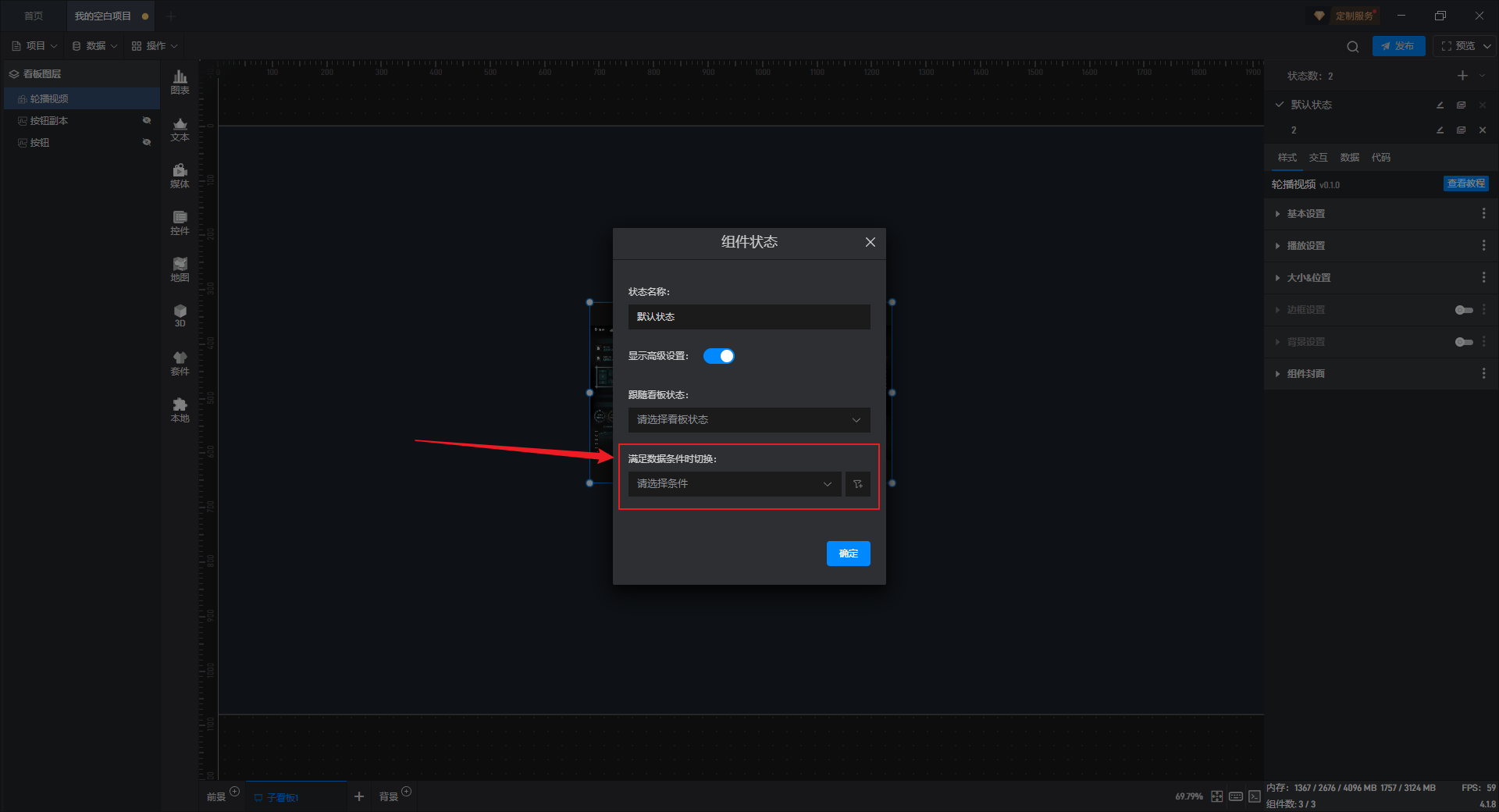 在这里我们可以选择已设置的数据条件,从而在数据条件满足时,组件的状态就会发生变化。