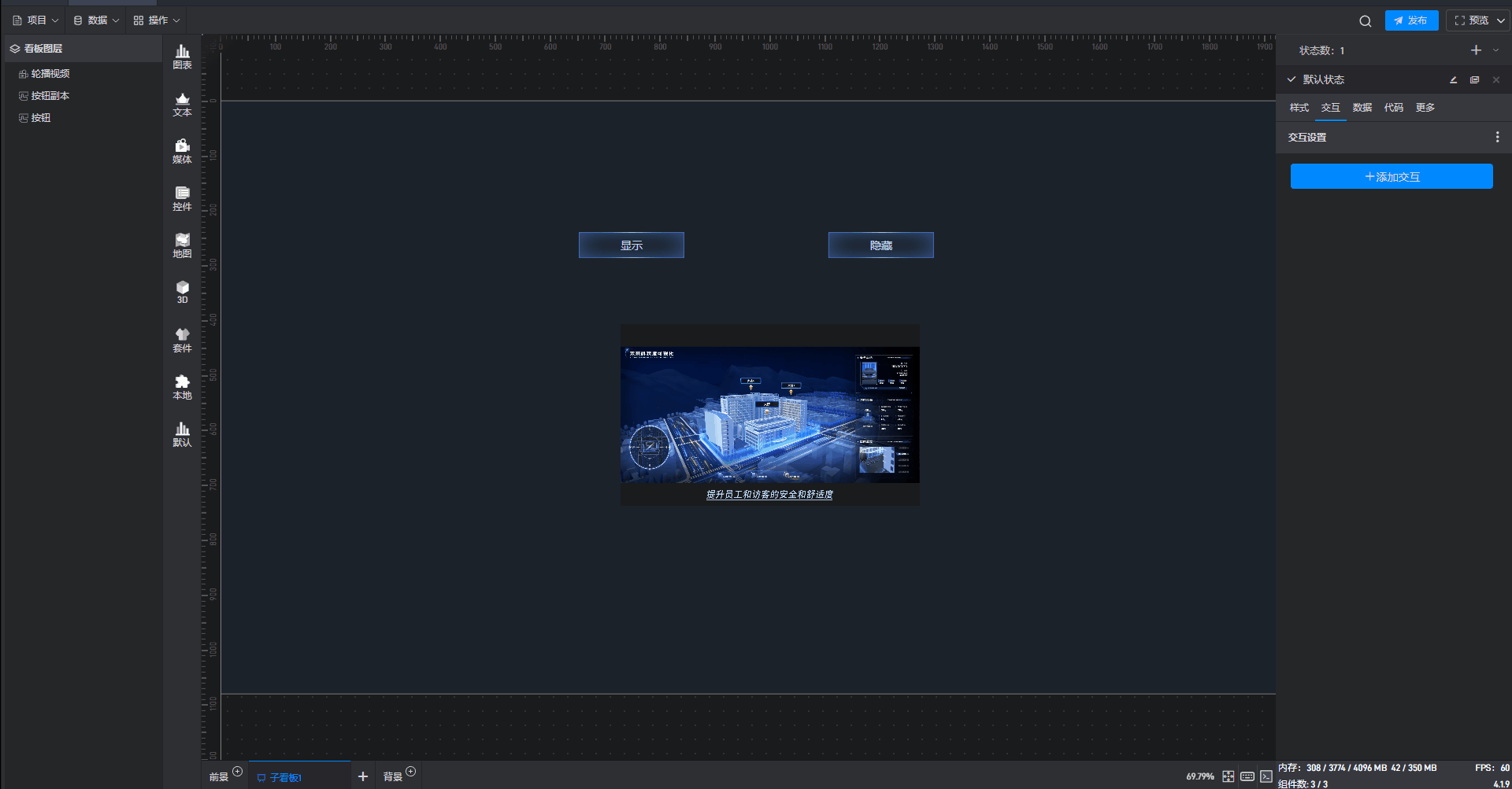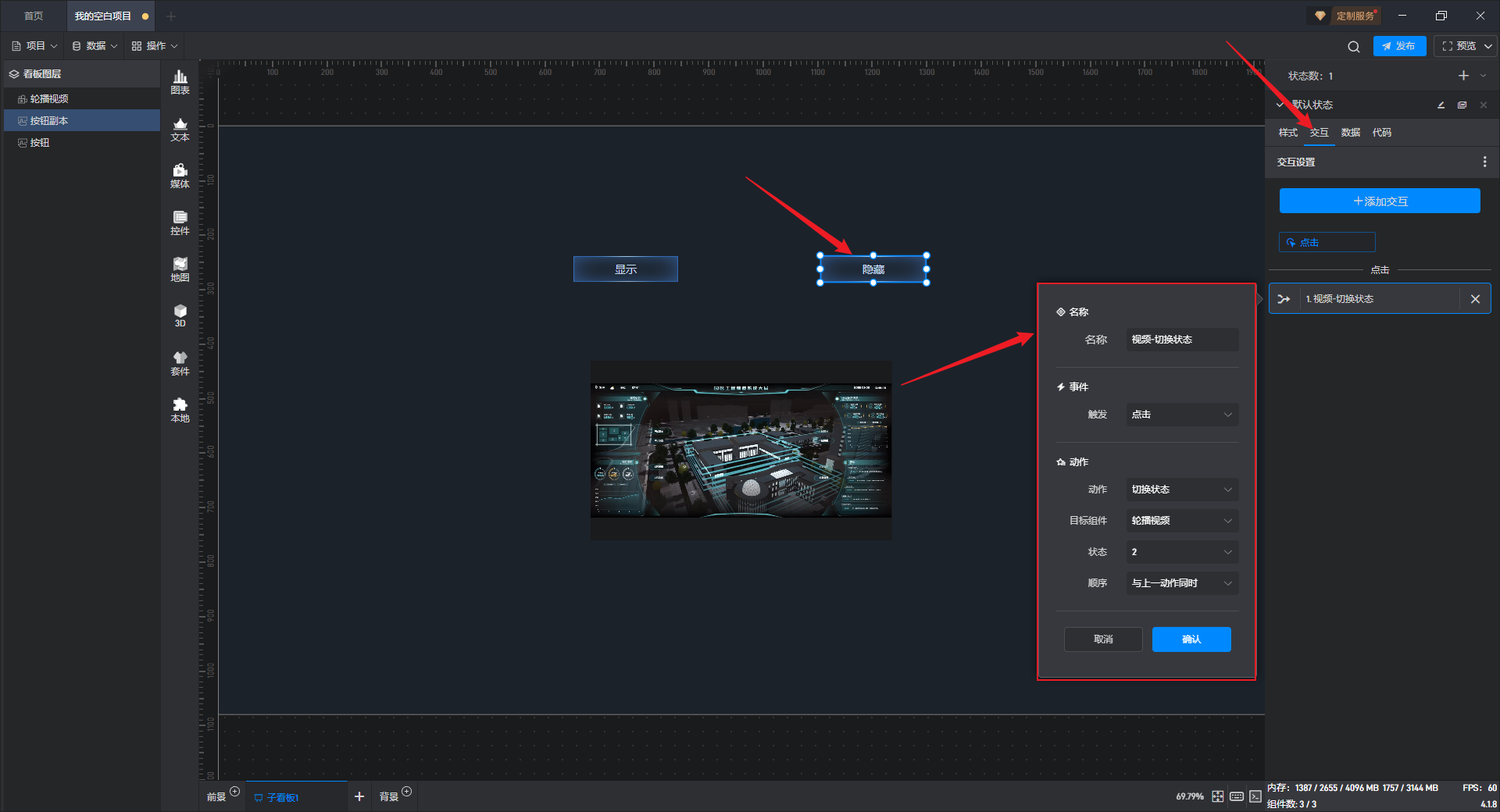 给隐藏按钮组件添加一个交互,点击后切换数据变化组件到隐藏状态。