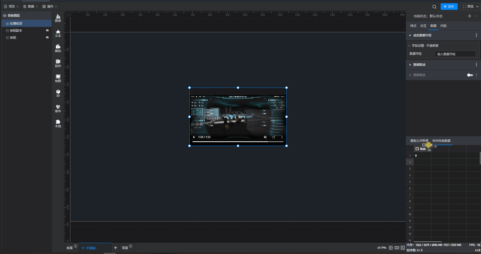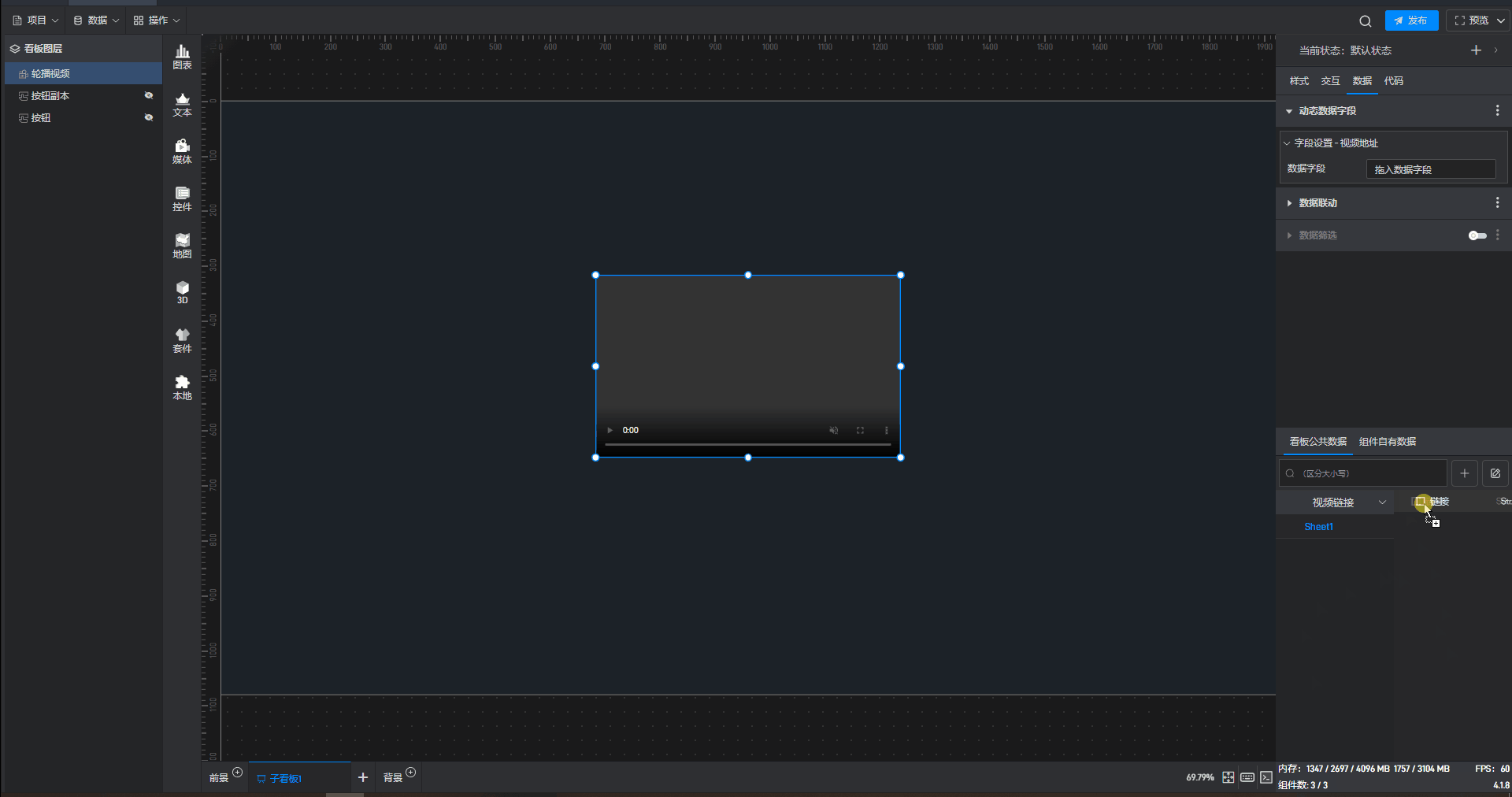 轮播视频组件可直接添加视频地址,也可以通过数据字段设置。