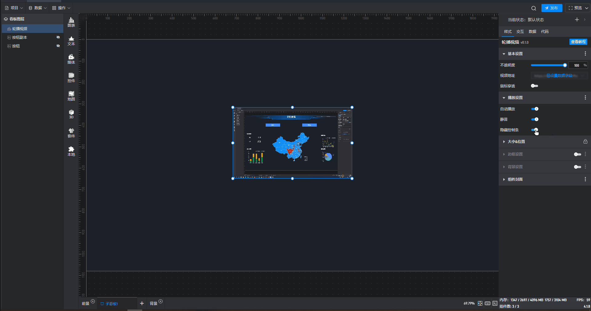 | 自动播放 | 开启后视频在项目发布或部署时将自动开始播放。 |