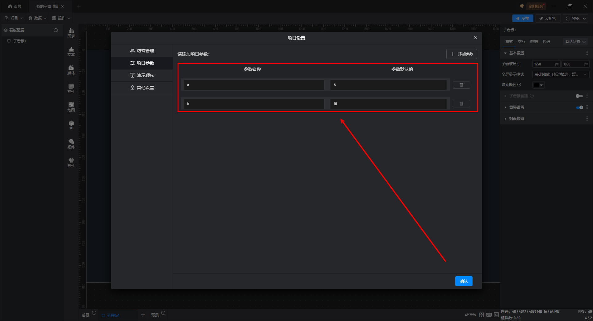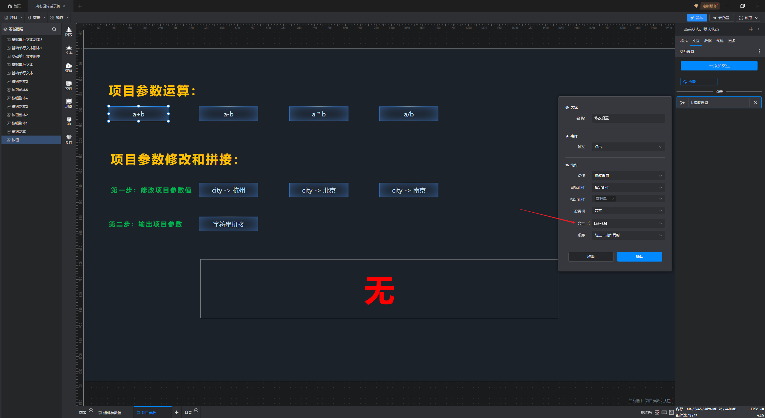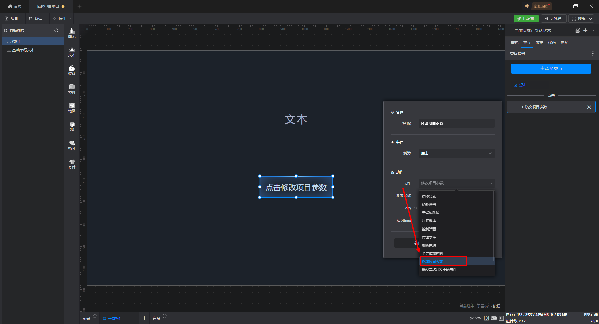 然后在看板中添加一个按钮组件,给这个按钮组件添加一个点击事件触发的交互,用来修改项目参数: