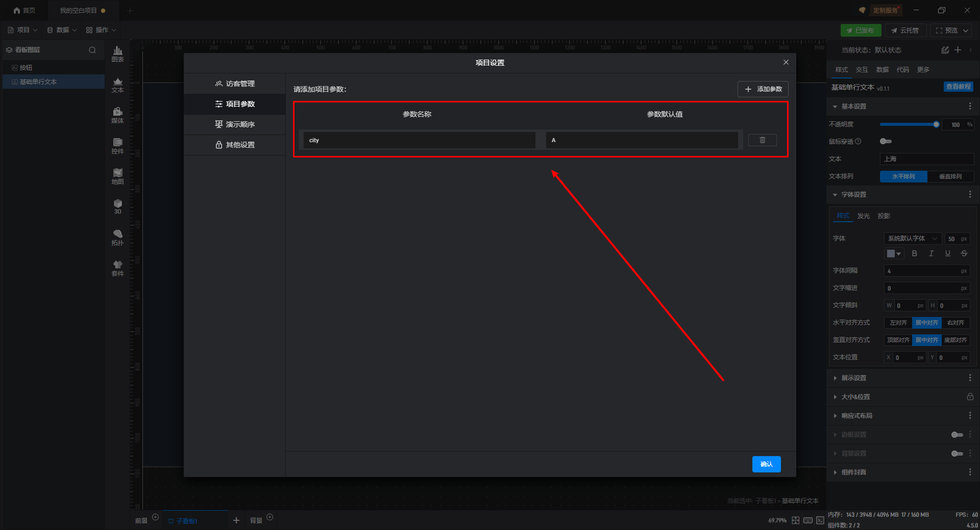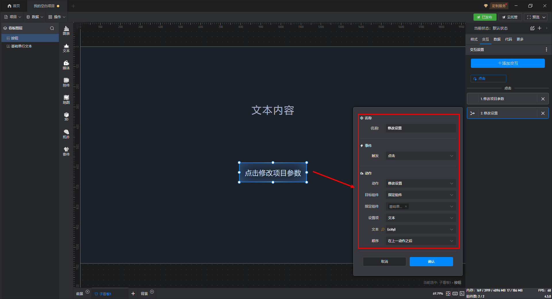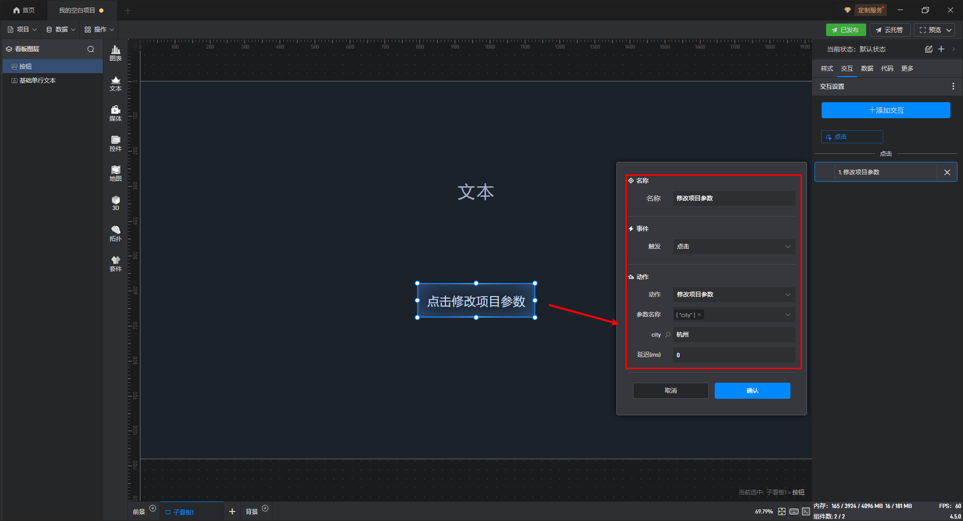 项目参数还可以通过交互进行设置,我们这里为按钮组件添加交互来进行演示,实现点击按钮修改项目参数 city为“杭州”,并且将项目参数的值设置为单行文本组件的文本。