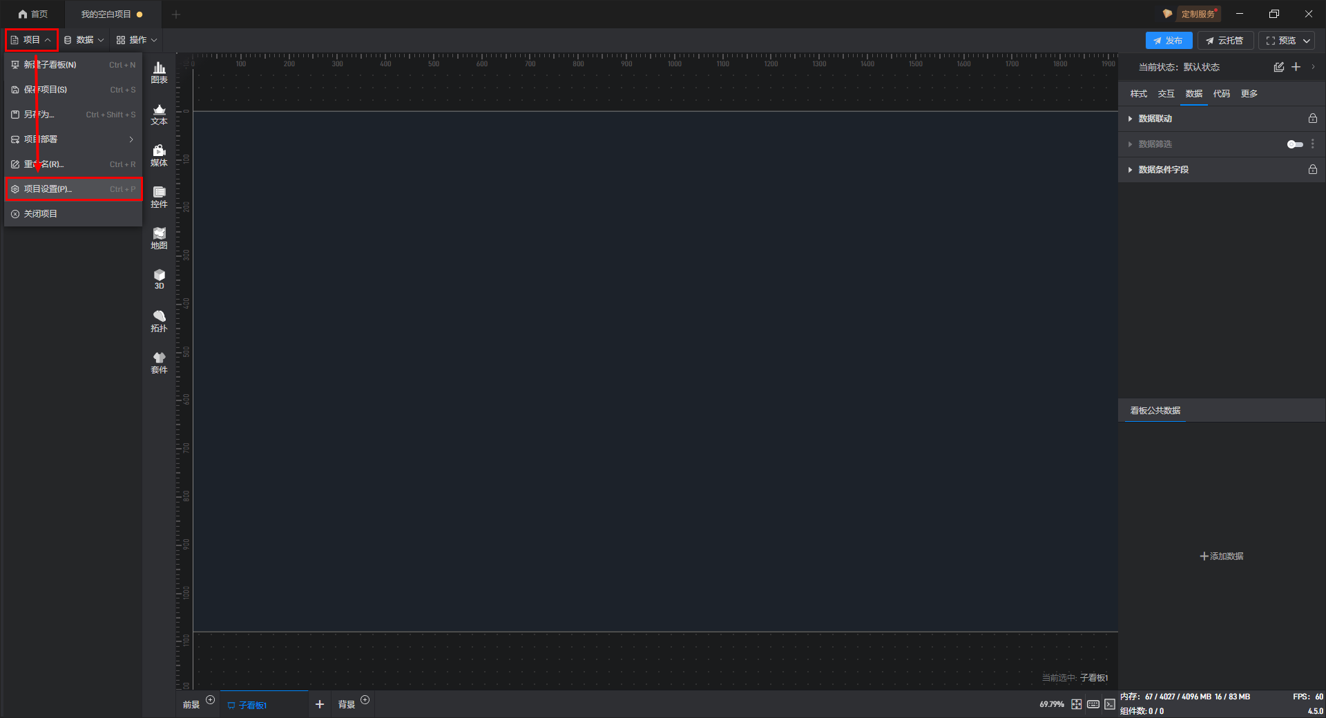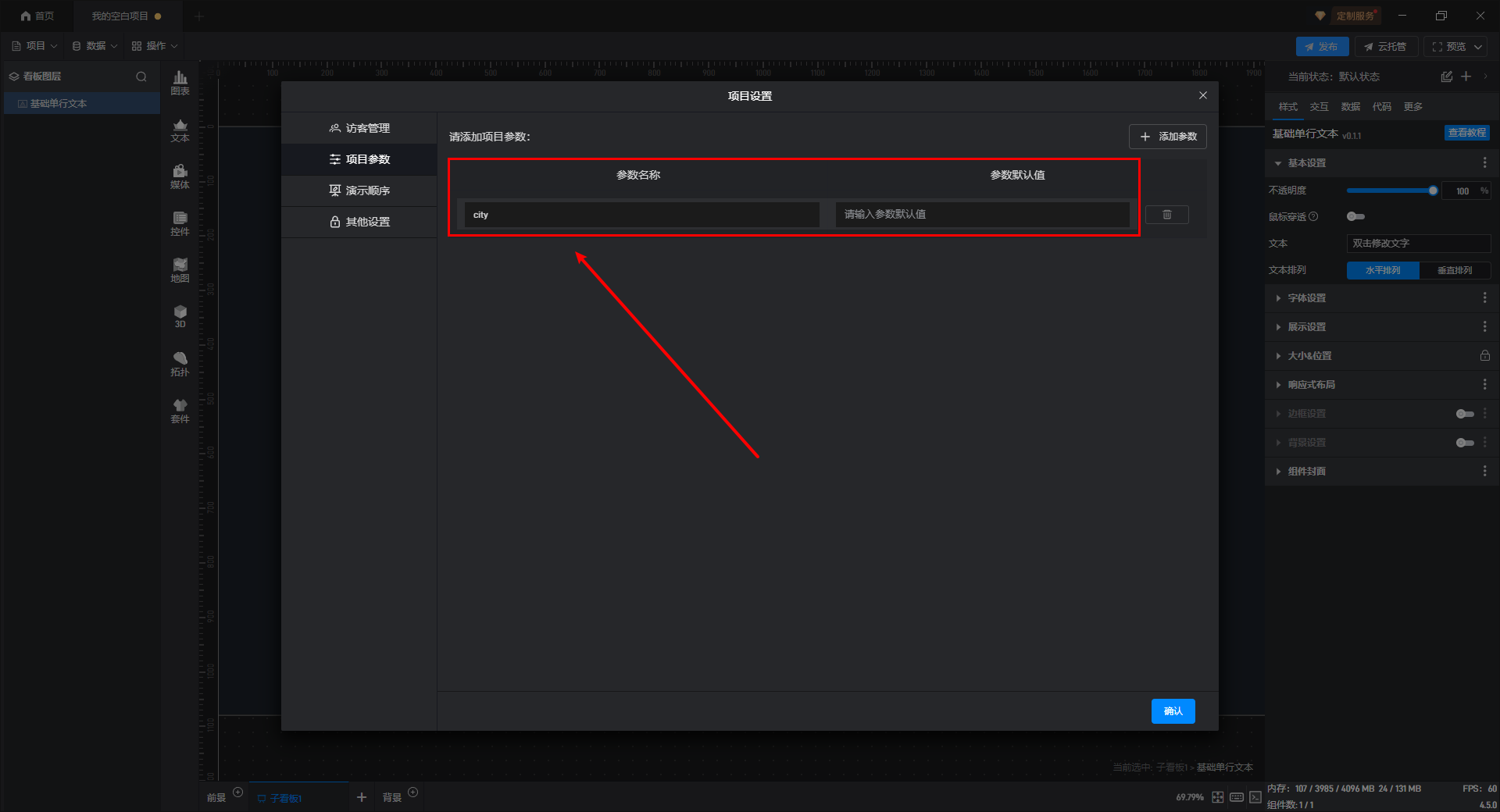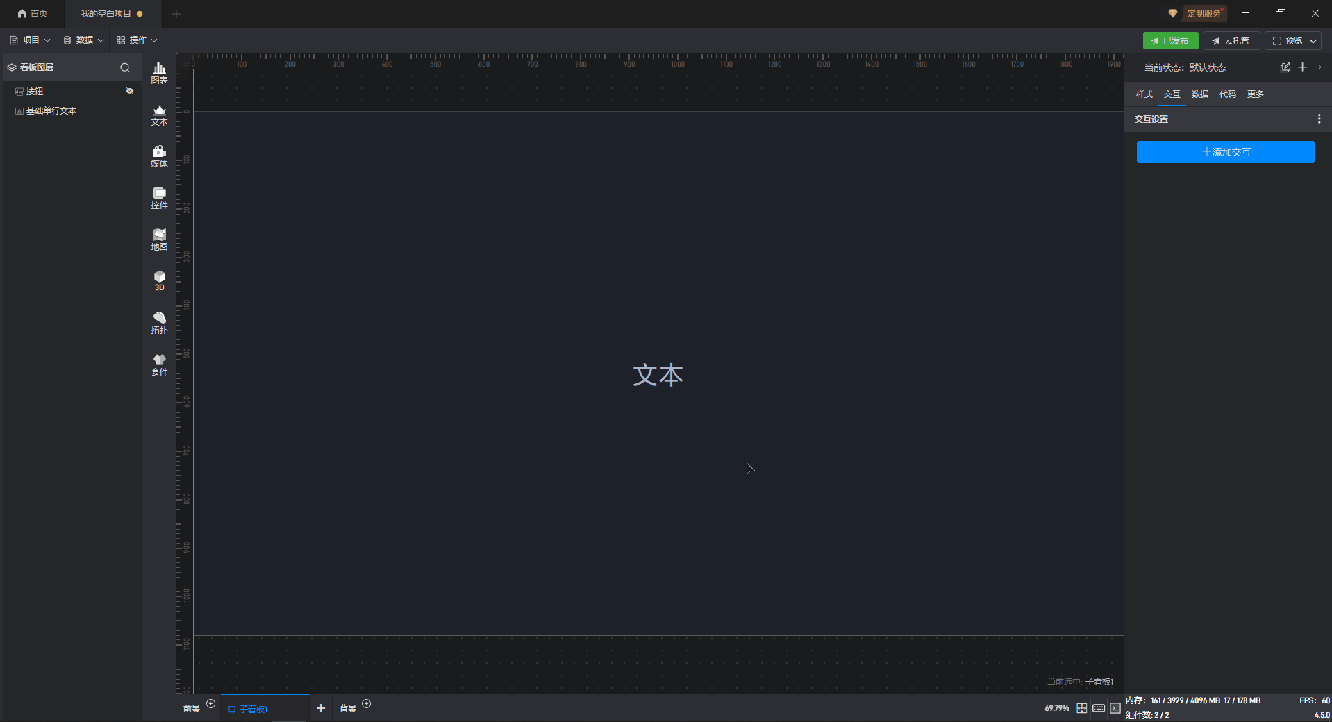 项目参数还可以通过交互进行设置,我们这里为按钮组件添加交互来进行演示,实现点击按钮修改项目参数 city为“杭州”,并且将项目参数的值设置为单行文本组件的文本。