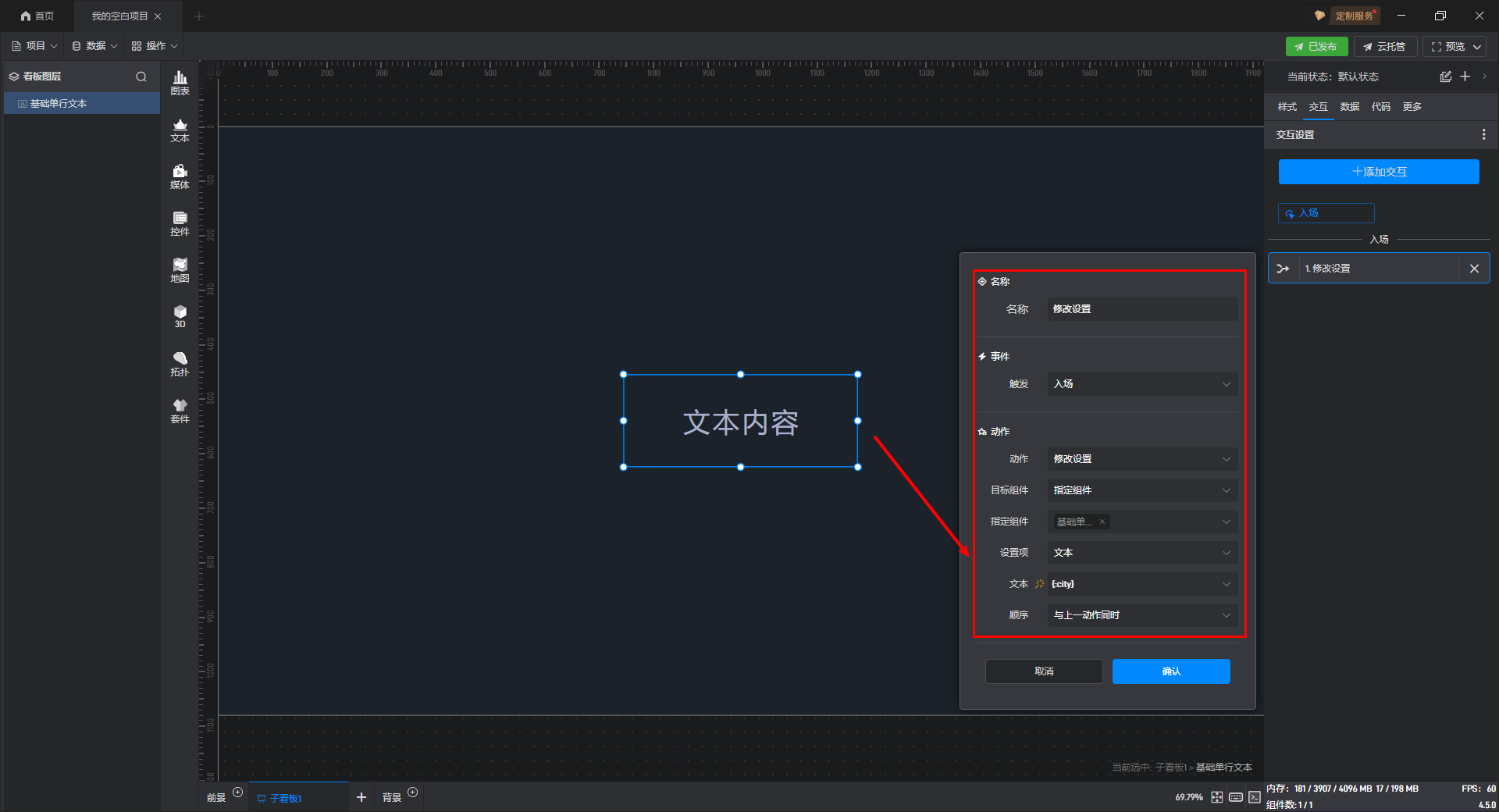 这样项目内得到的项目参数 city 的值就将是“上海”,我们通过交互将一个文本组件在入场时文本内容设置成项目参数的值(需要使用动态值,点击链接可查看动态值的详细教程),如下图所示: