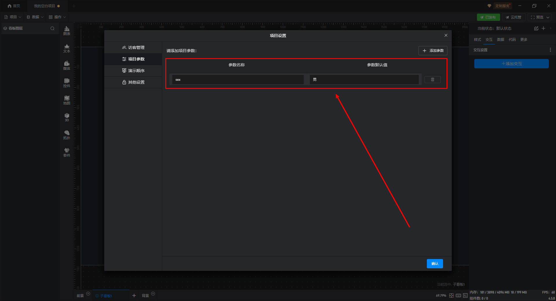首先,先在项目设置中添加一个项目参数“sex”,默认值填入“男”: