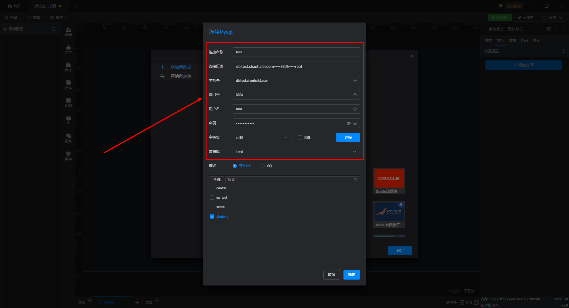 我们点击添加数据,这里使用 MySQL 数据库进行演示,在连接界面填入相关的参数,点击连接按钮后看到所有数据库和表(点击查看连接 MySQL 数据库具体教程),如下图所示: