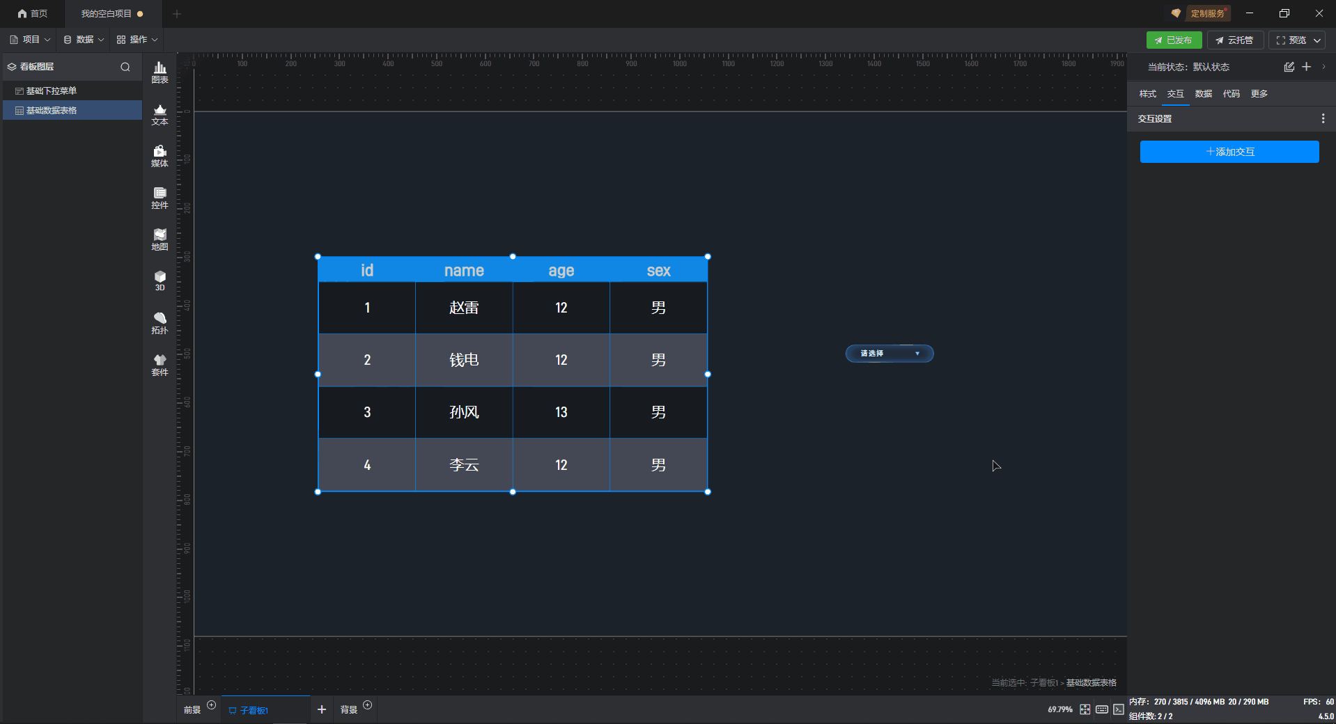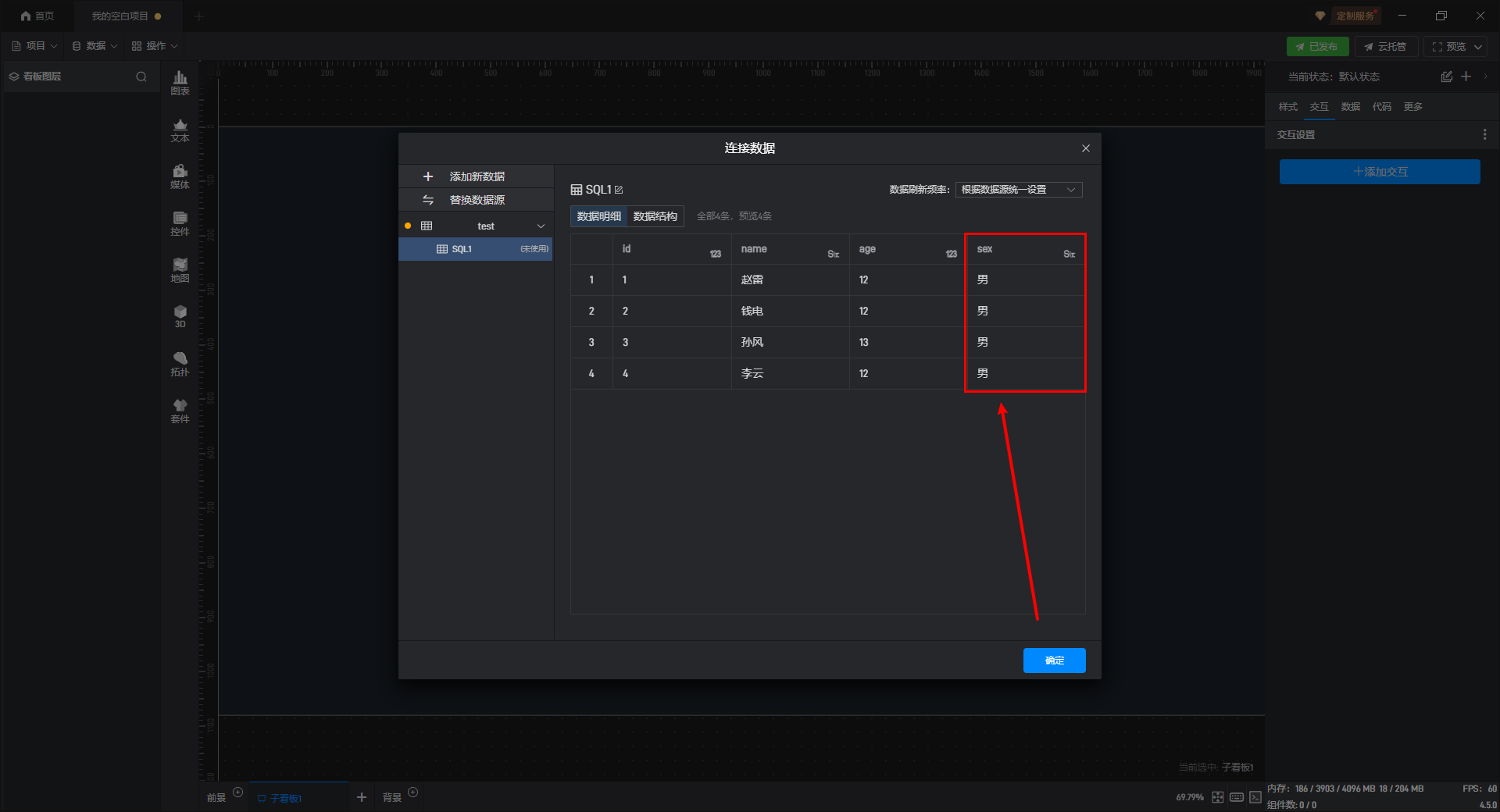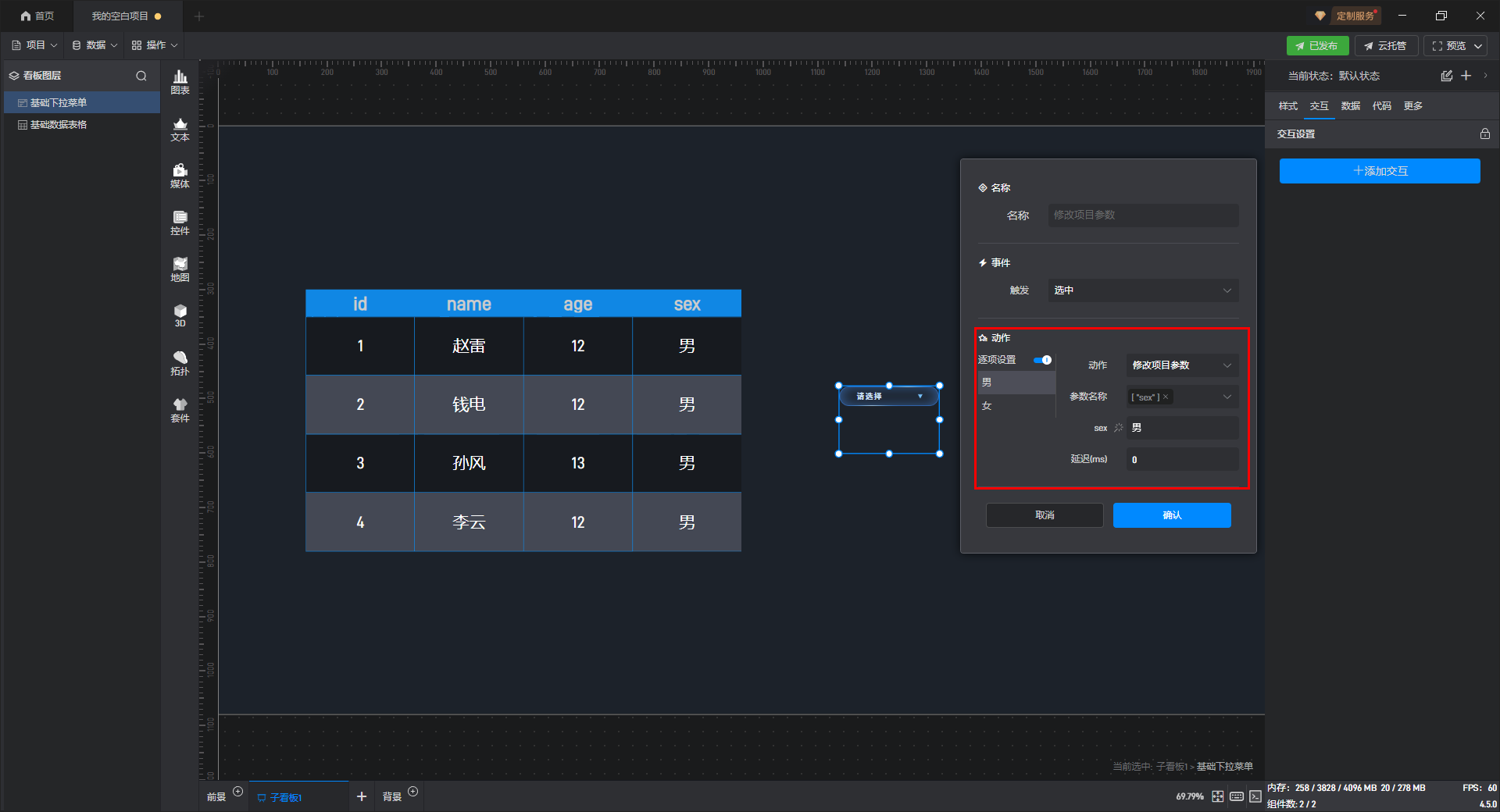 为下拉菜单组件添加一个交互,选中选项“男”时修改项目参数sex为男: