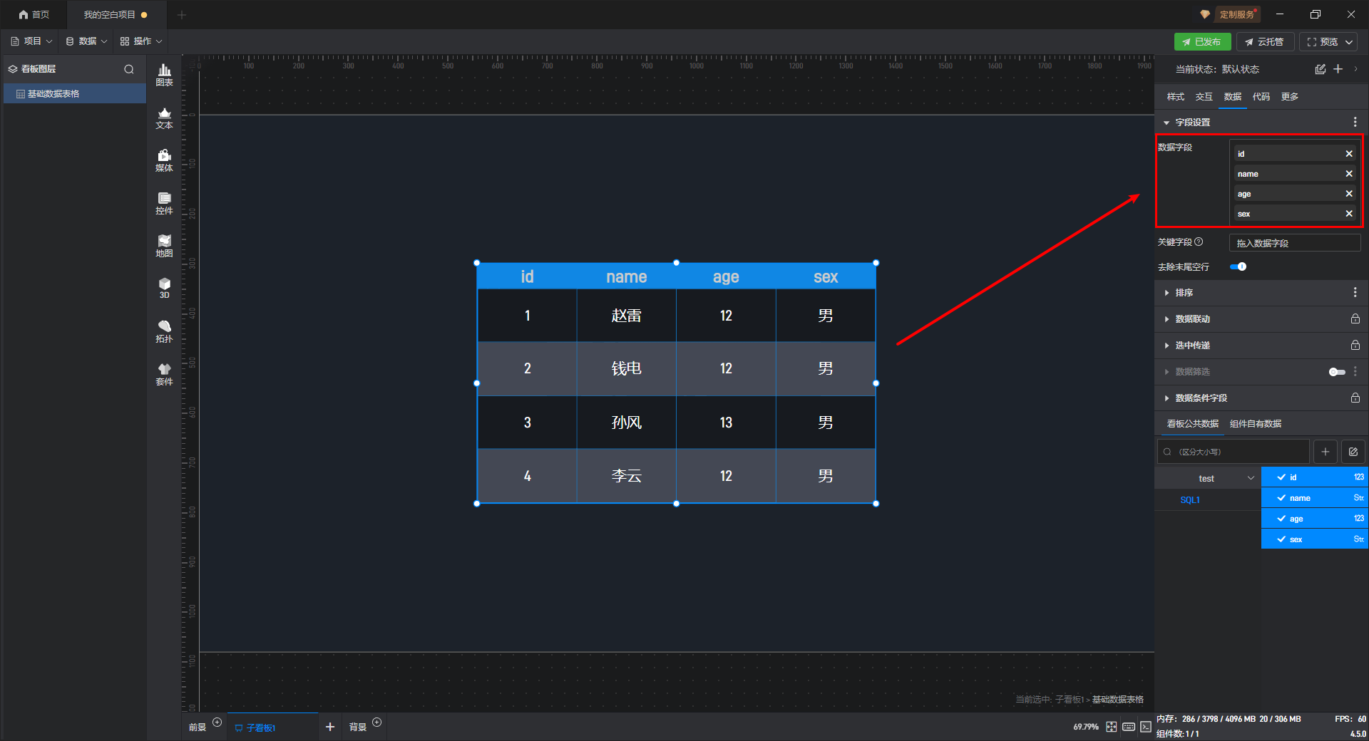 我们添加一个基础数据表格组件,并绑定导入的数据: