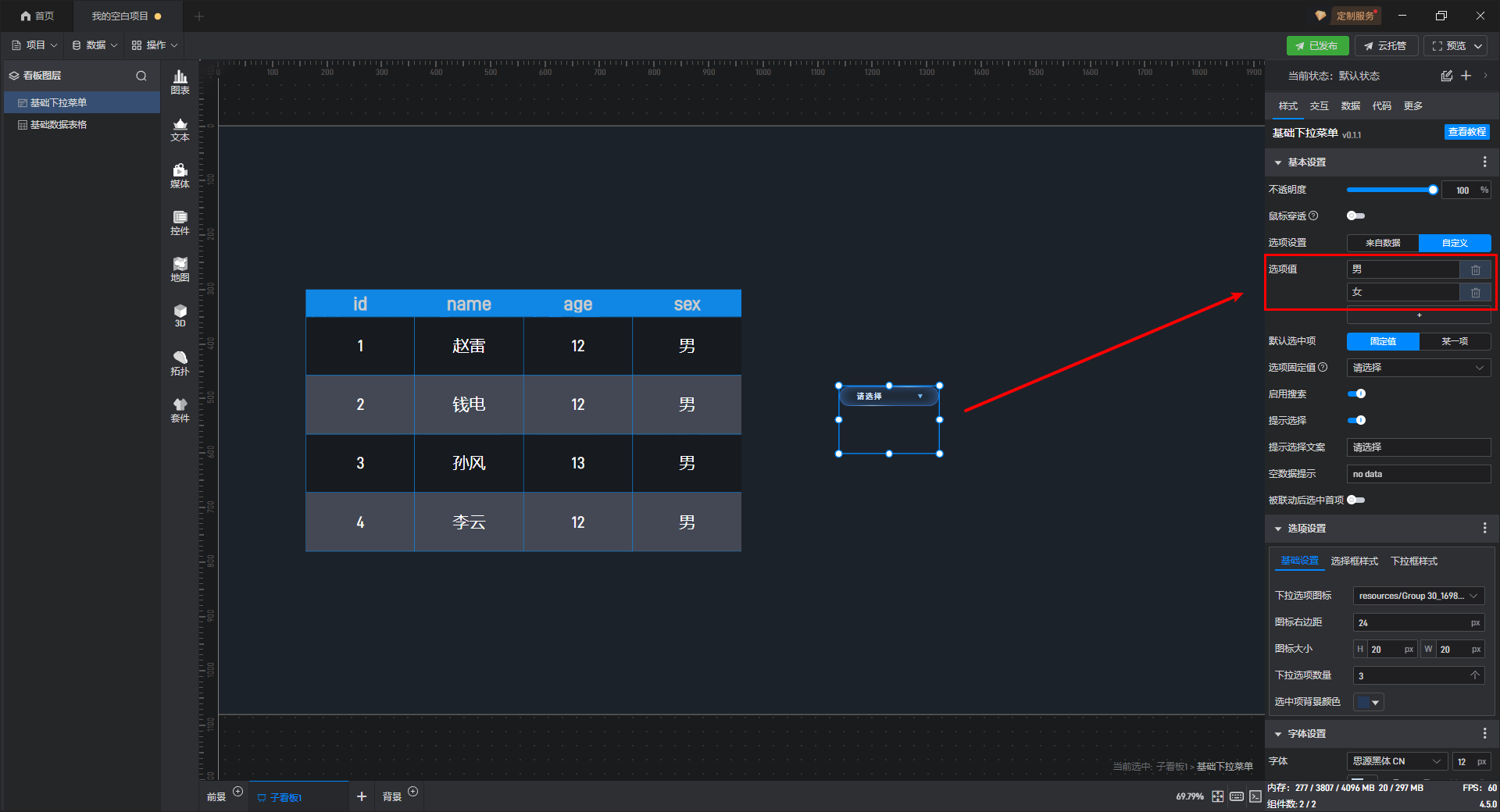 我们添加一个下拉菜单组件,将下拉选项改为“男”和“女”,如下图所示: