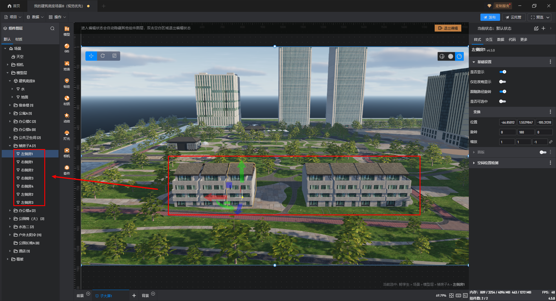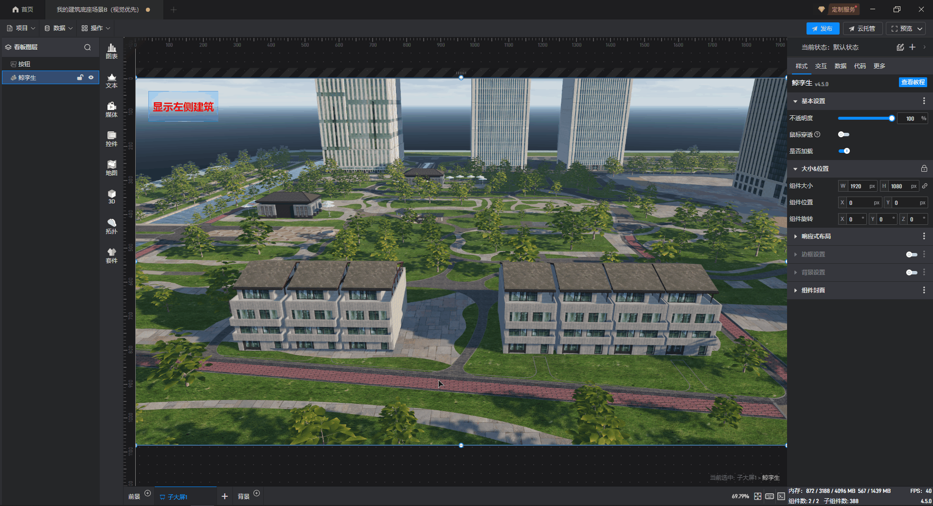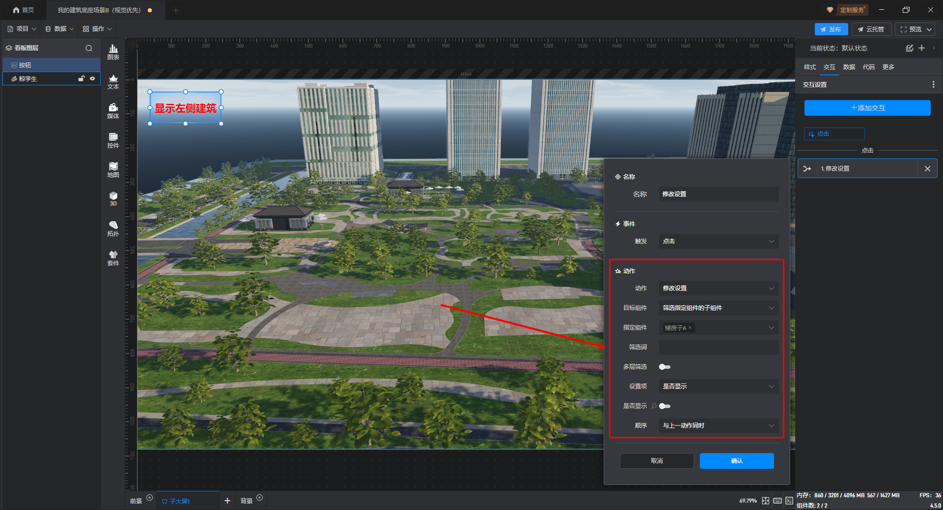 在我们设置交互时,有的时候需要对交互作用到的对象进行筛选,特别是在 3D 场景中,我们经常希望只显示某一个楼层下的人员或者桌椅,或者只显示某几幢建筑,此时我们就可以借助项目参数结合组件筛选来动态选择交互所作用的对象组件。