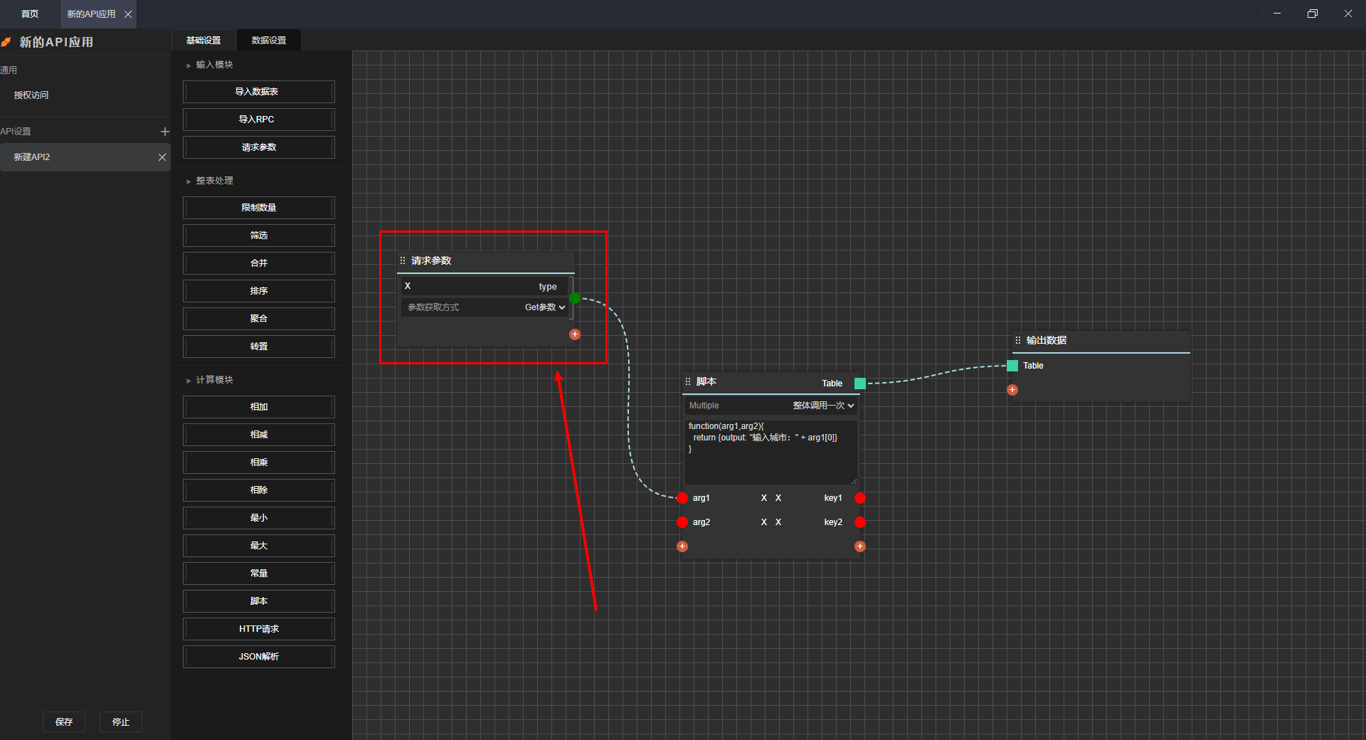 首先,我们需要右一个 API 的地址,这里我们用我们的山海鲸数据管家生成一个最简单的 API,读取一个 type 参数,输出的output是“输入城市:type”的形式: