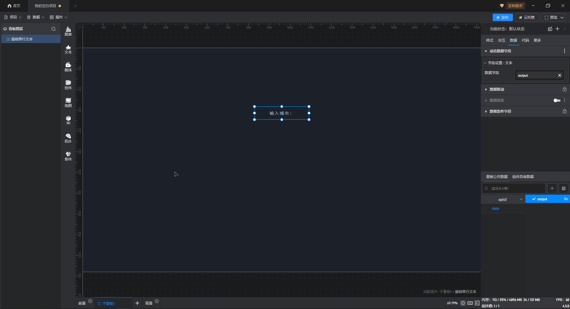 这里使用GET 请求导入 API 数据进行演示,先做一些设置让数据显示出来,我们添加一个单行文本组件,然后修改文本组件的文本选项生成数据字段: