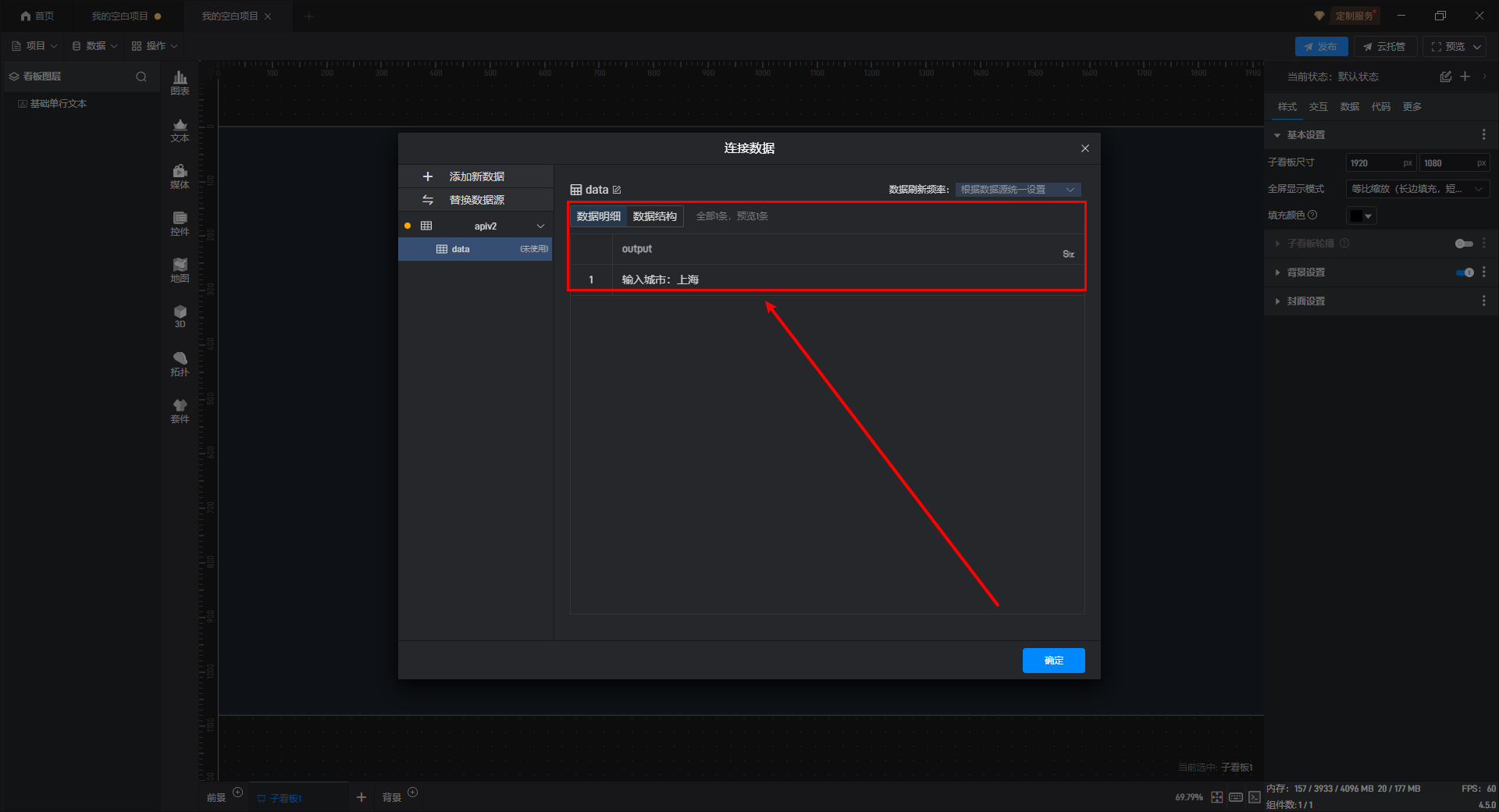 在连接 API 数据时,我们可以将项目参数替换 API 的URL、BODY、HEADER中的部分内容,此处我们以 URL 为例来看一下 API 连接中如何使用项目参数。