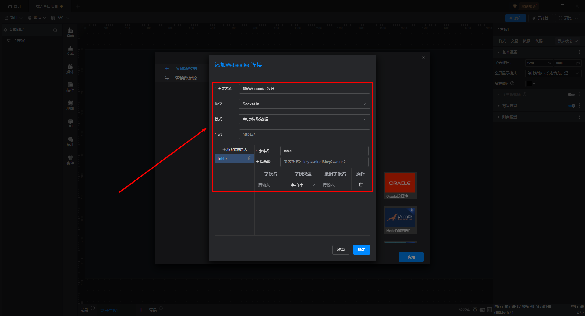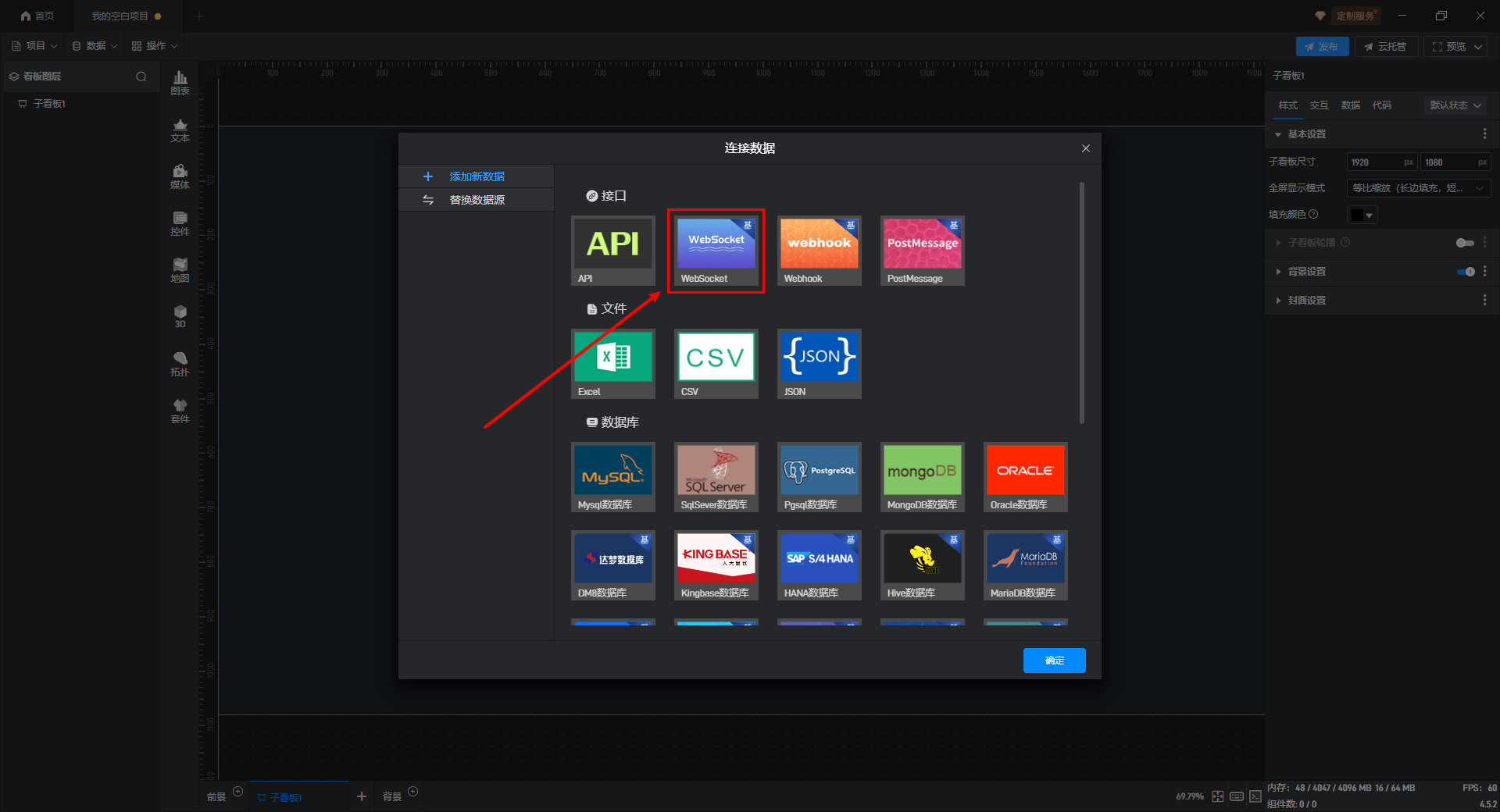 在数据源编辑窗口中,在左侧选择“添加数据”选项卡,然后在右侧点击接口分类中的“WebSocket”按钮:
