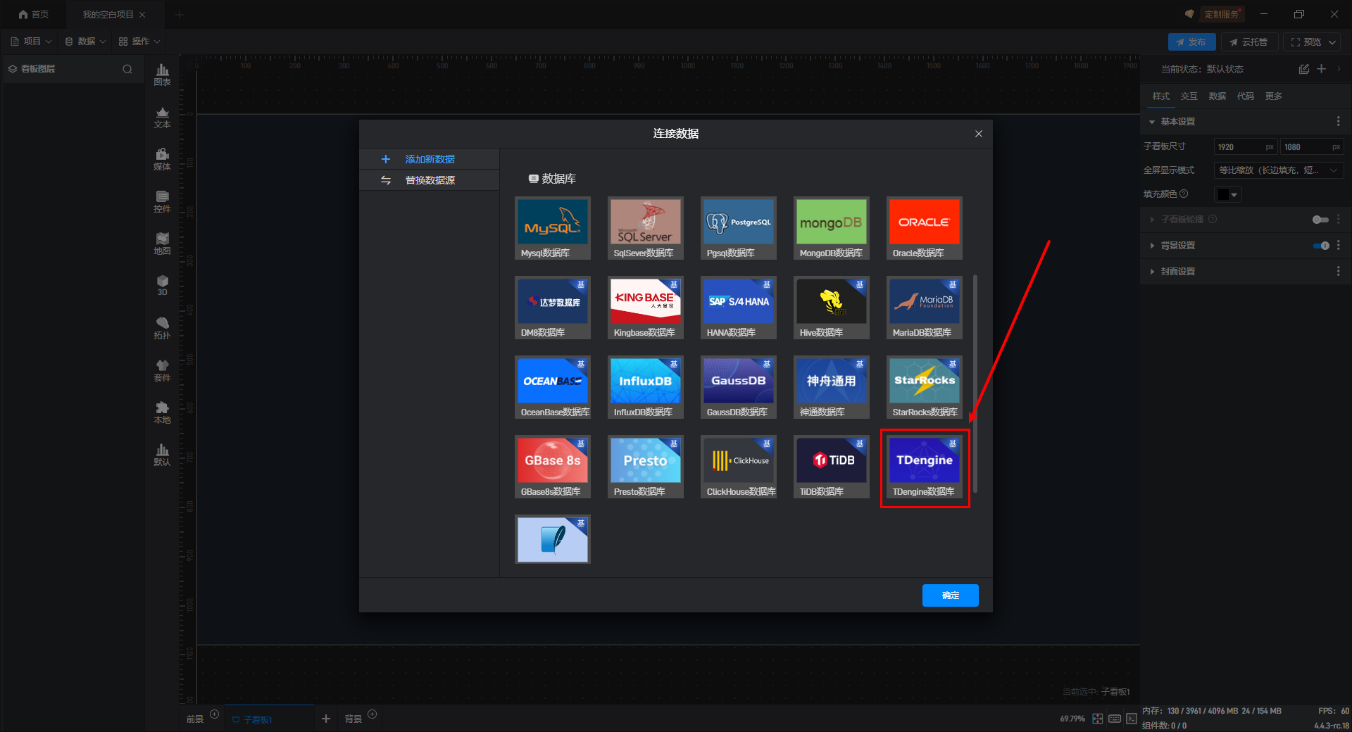 在数据源编辑窗口中,在左侧选择“添加新数据”选项卡,然后在弹窗右侧点击数据库分类中的“TDengine 数据库”选项框。