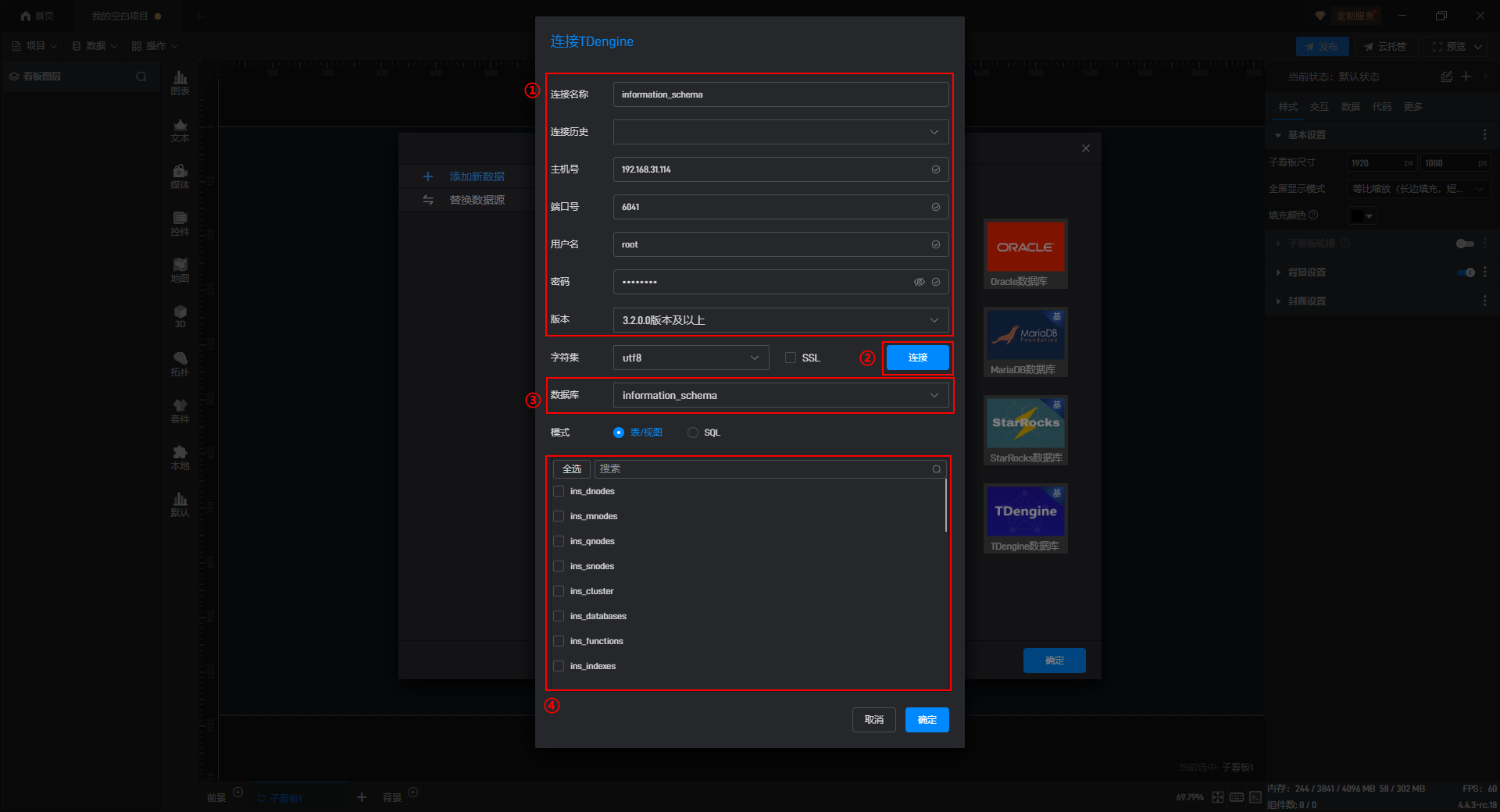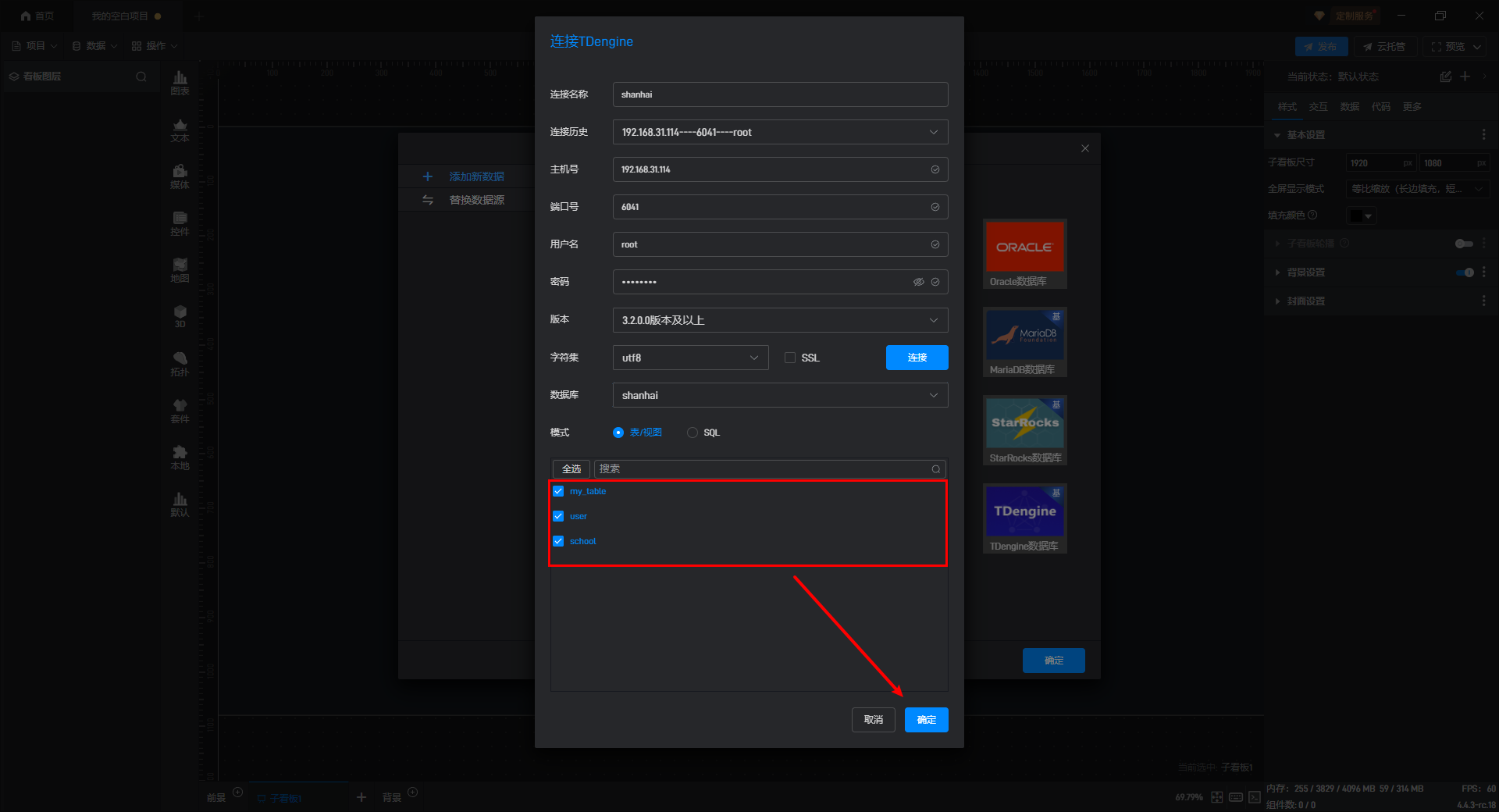 软件会弹出“连接 TDengine”的设置框,填入需要连接的数据库基本参数,并点击“连接”按钮。软件会自动尝试连接数据库并获取数据库中所有的表/视图。