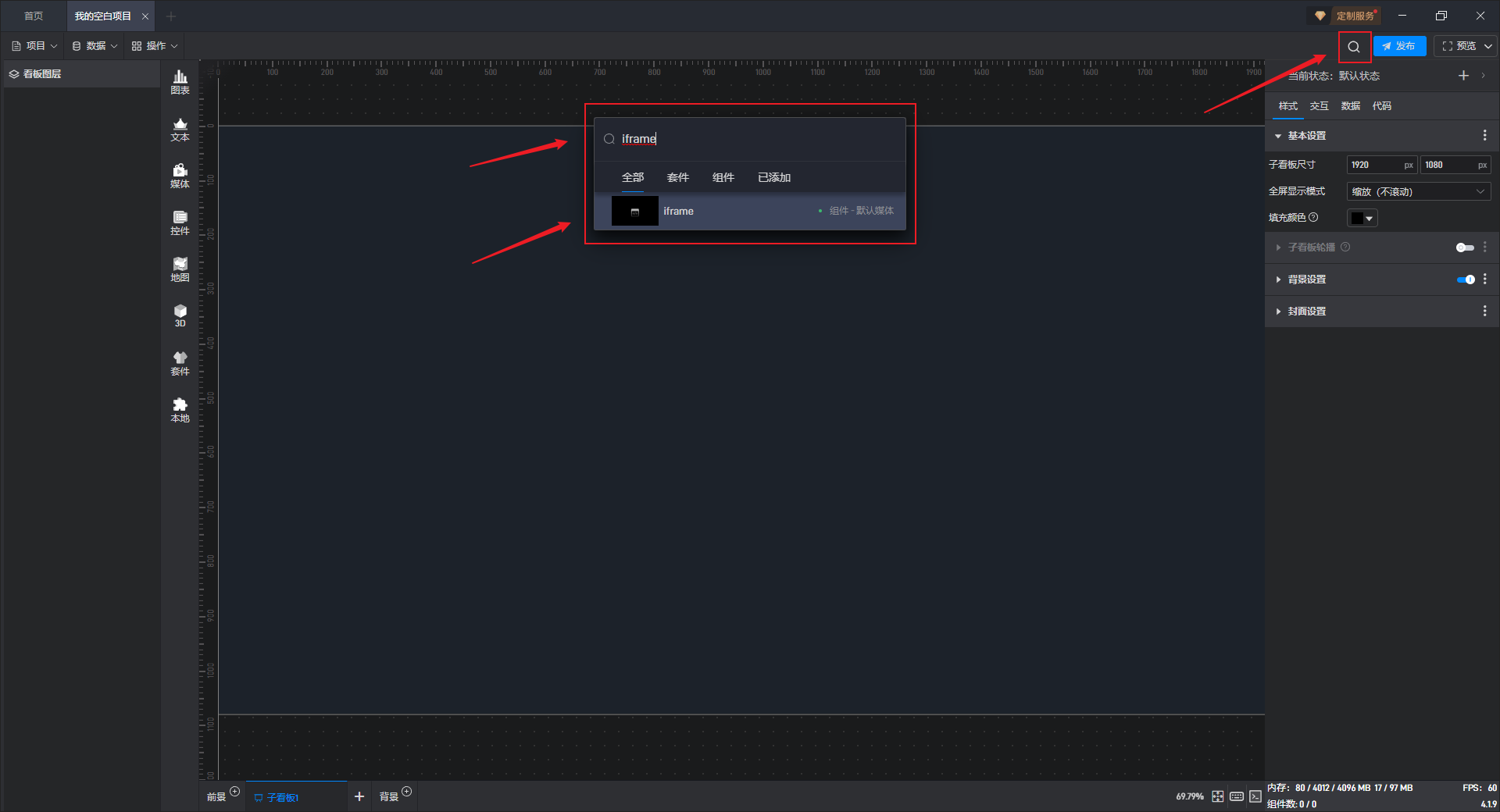 点击搜索按钮或按键盘“Ctrl+F”键打开搜索框,输入组件名称进行搜索,然后点击对应的组件进行添加。