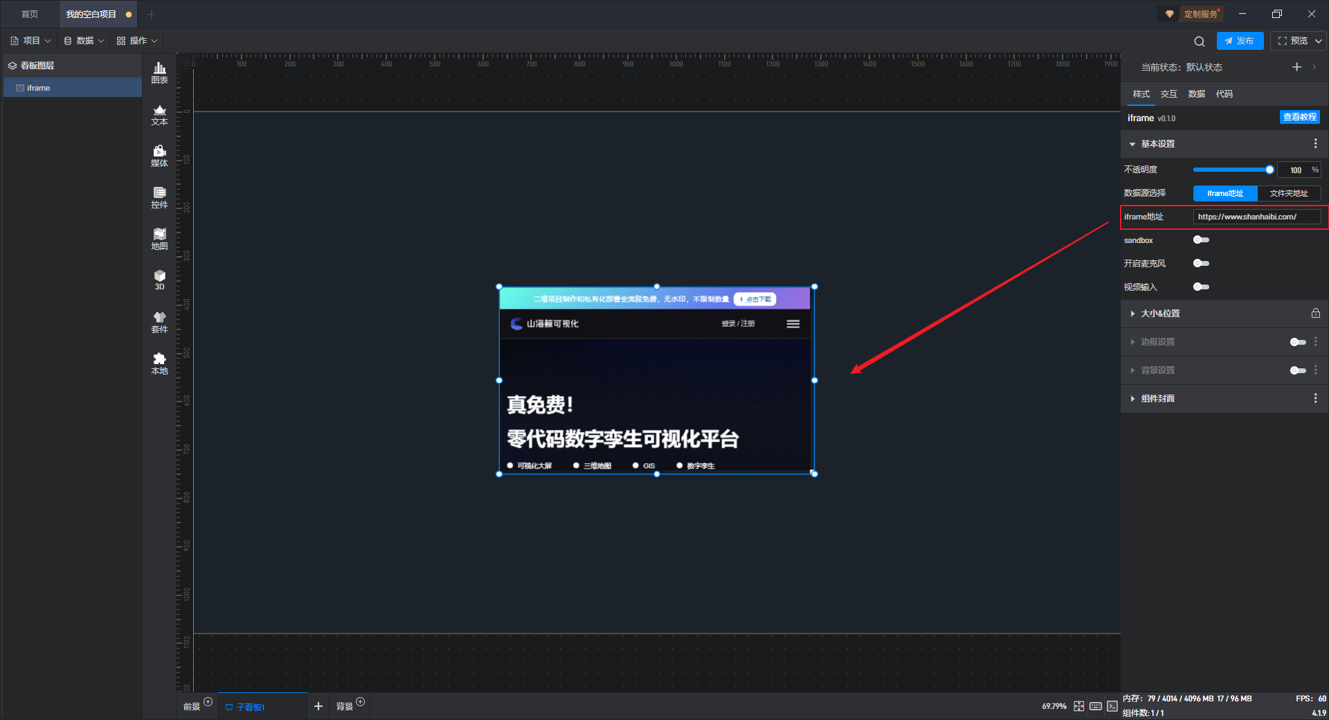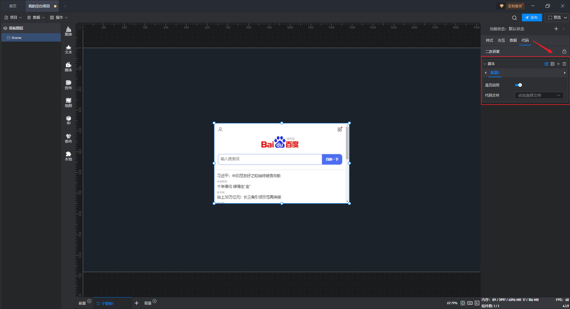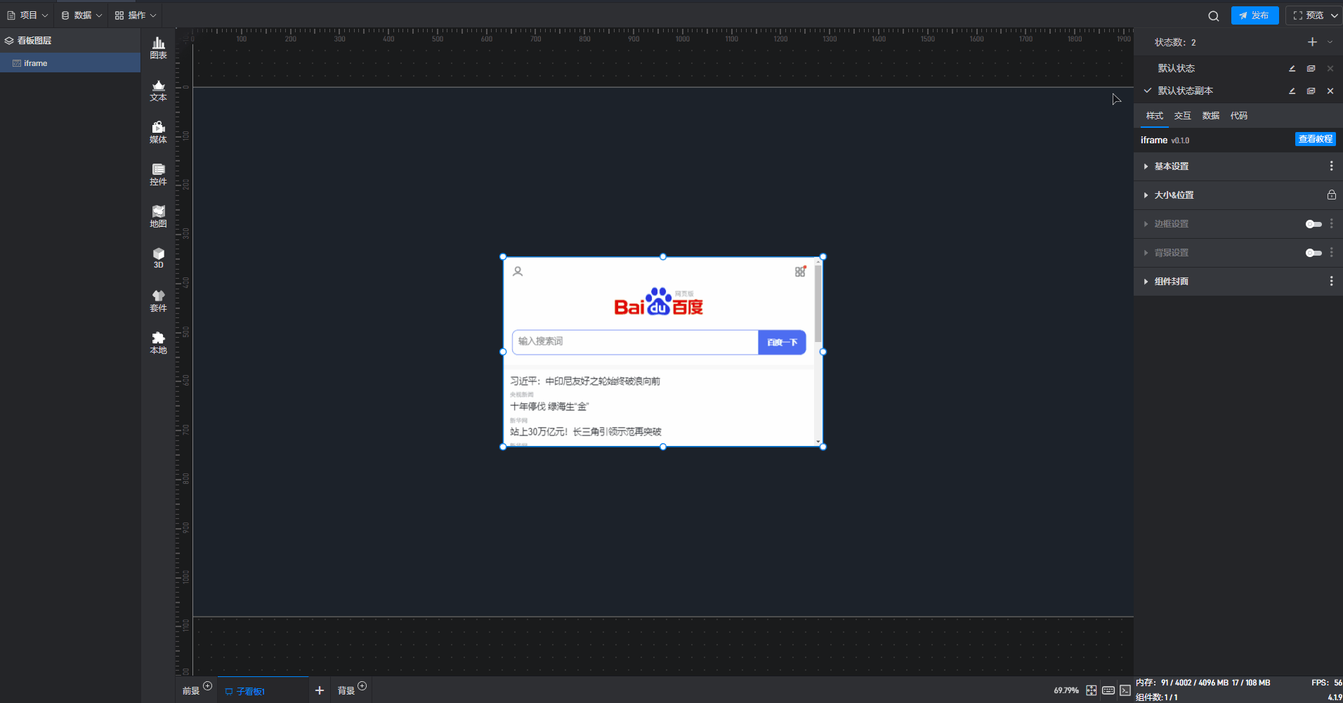 iframe 组件可直接添加 iframe 地址或上传文件夹,也可以通过数据字段设置。