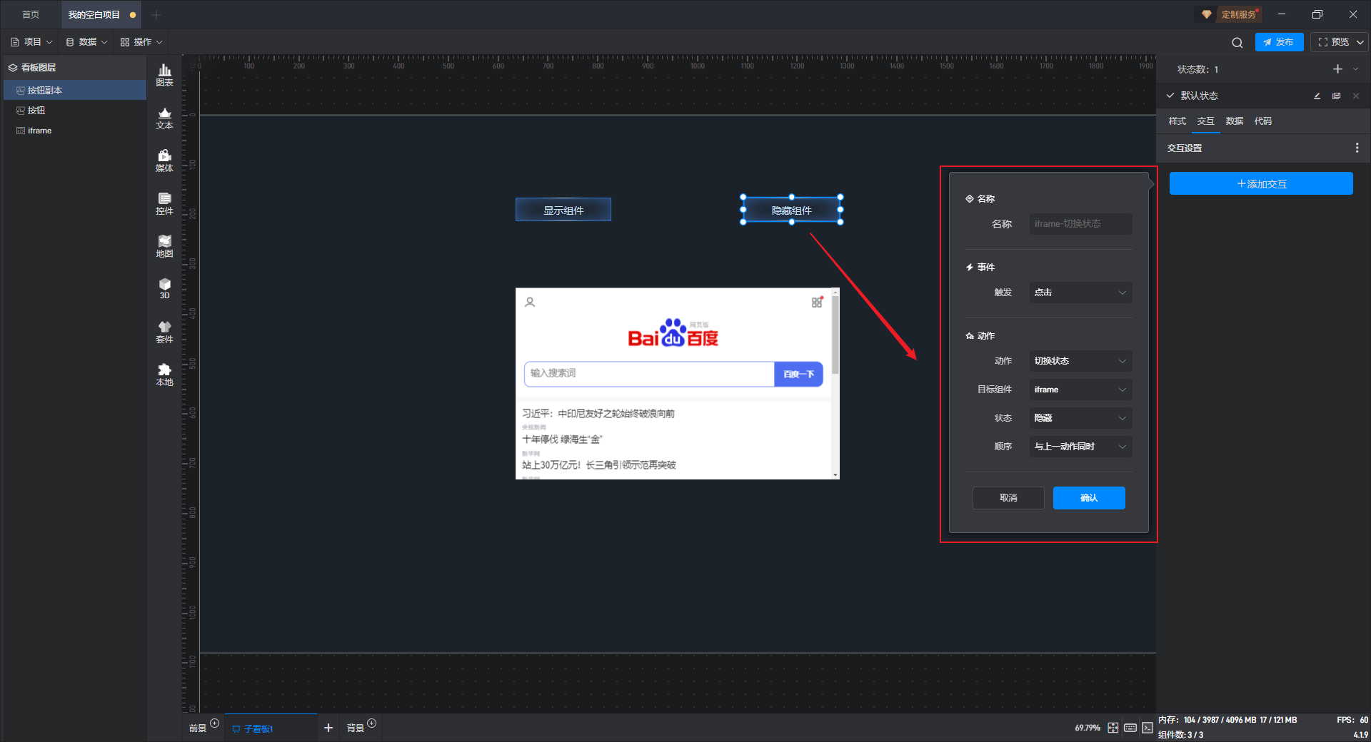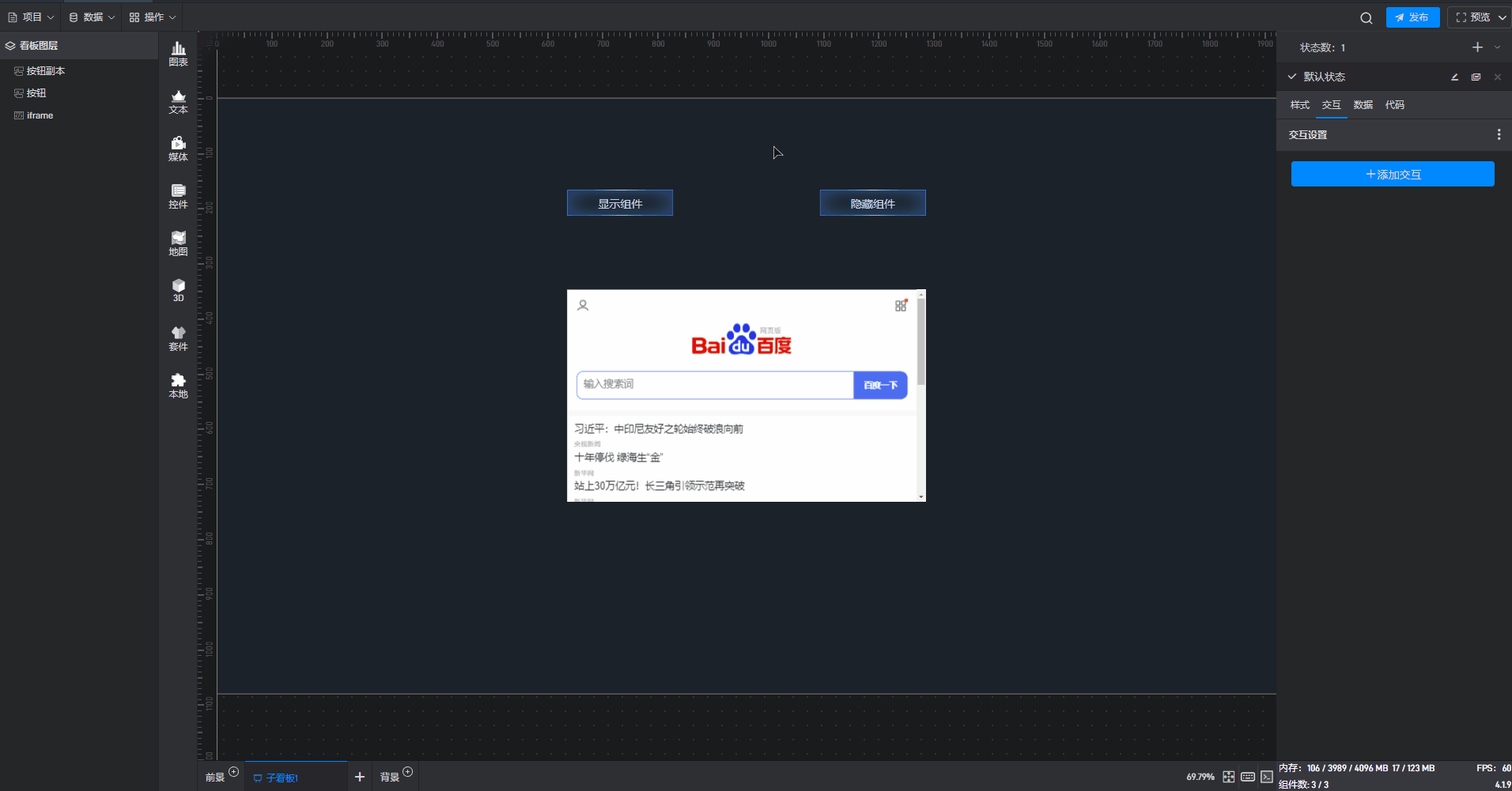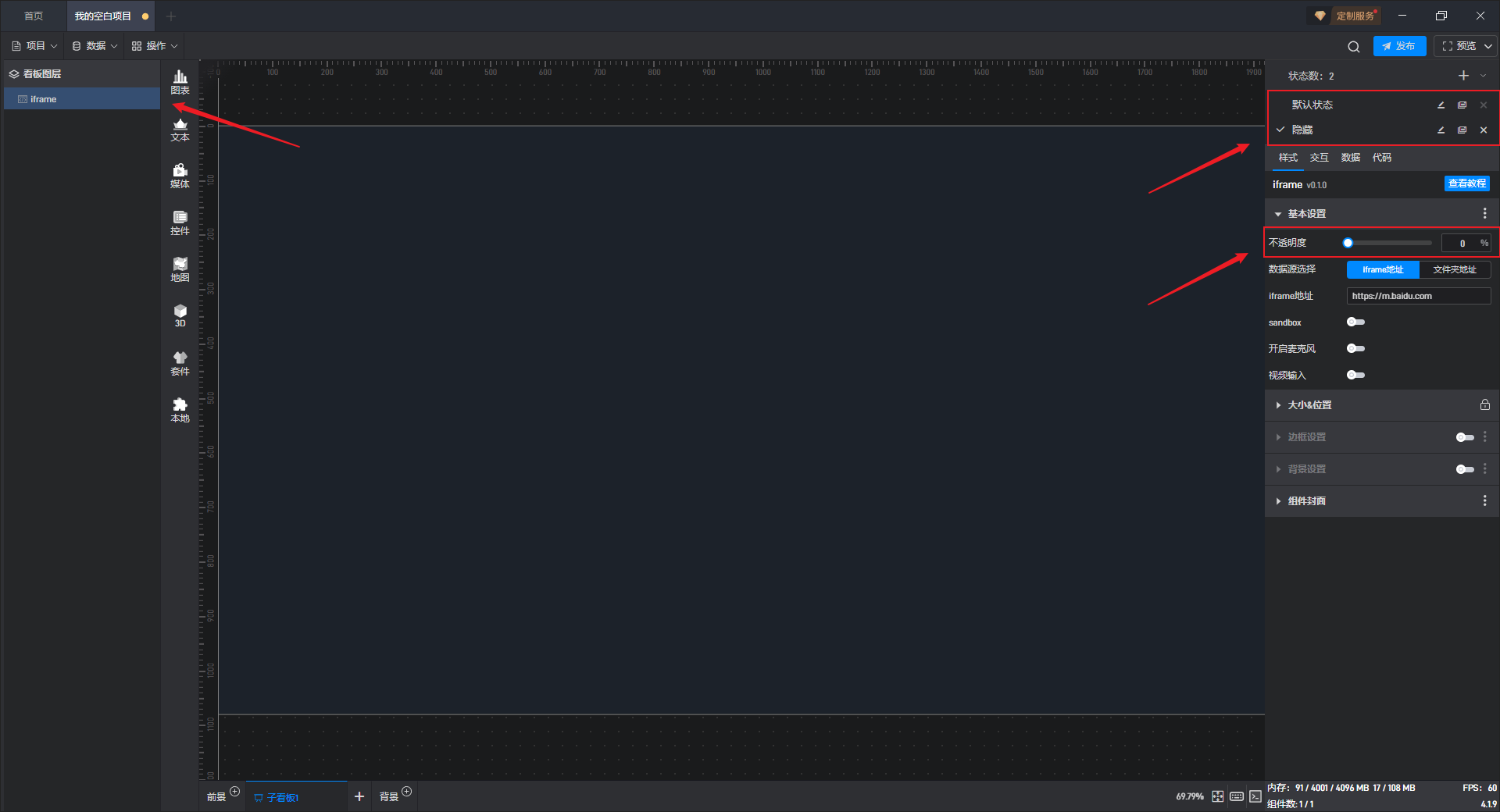 iframe 组件可直接添加 iframe 地址或上传文件夹,也可以通过数据字段设置。