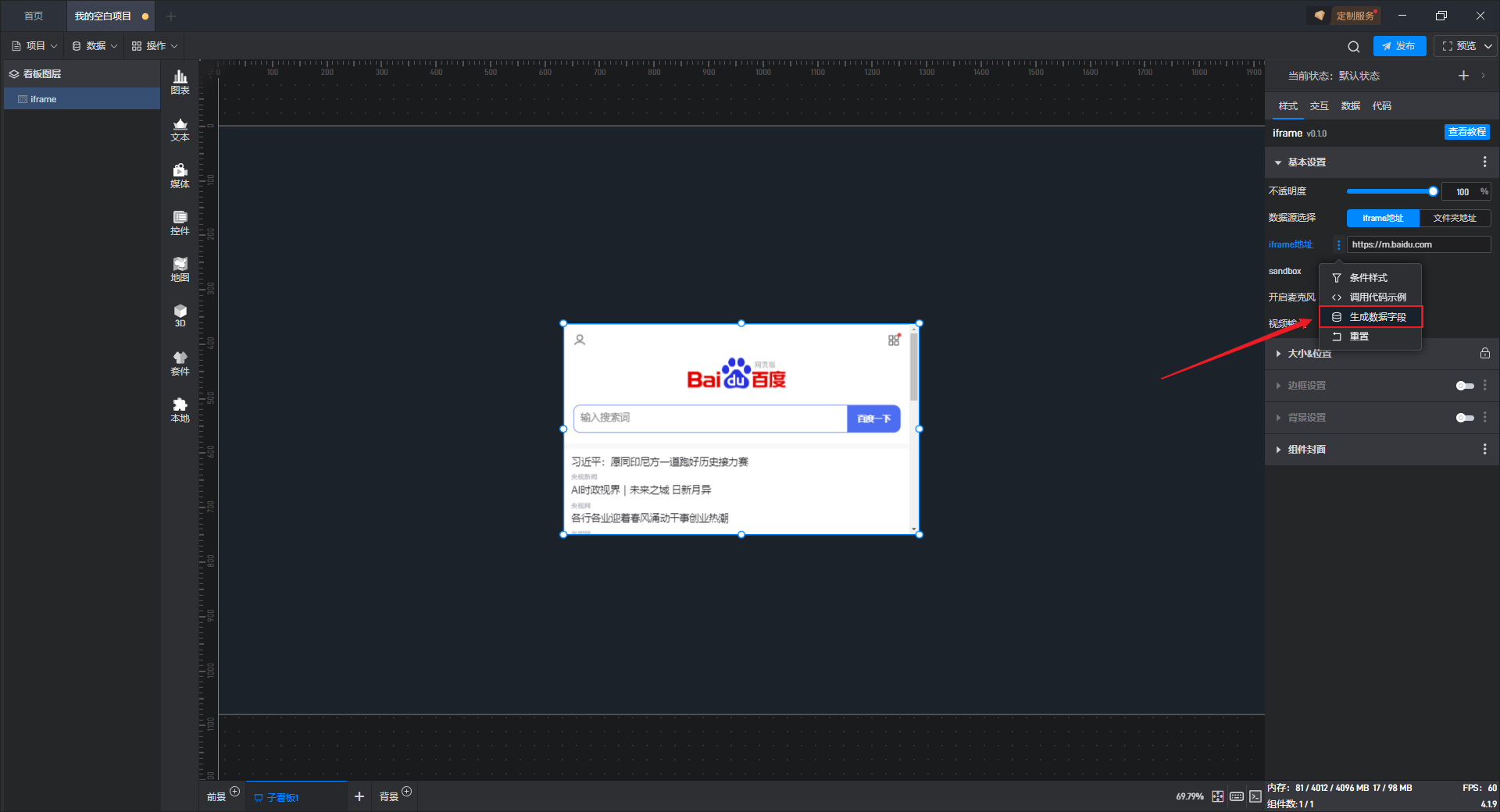 点击选中组件,打开 iframe 地址的扩展设置(也可以通过右击打开这个菜单),点击第三个选项“生成数据字段”。