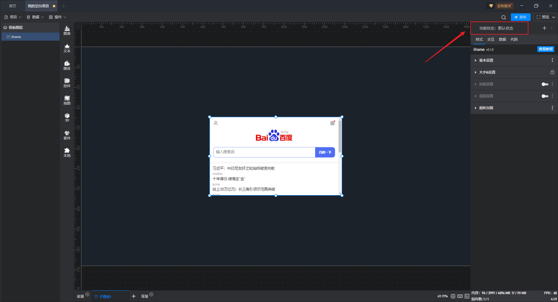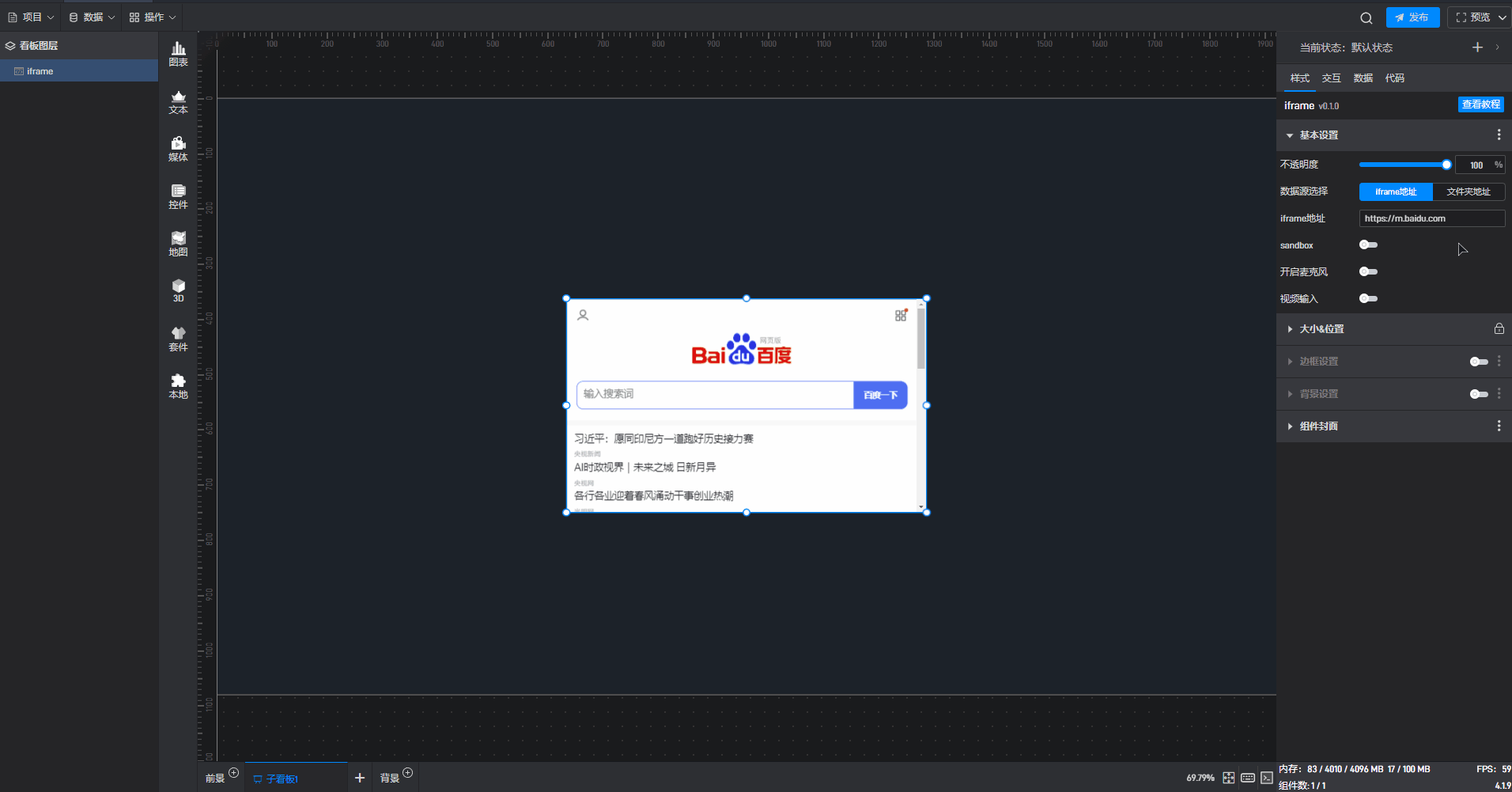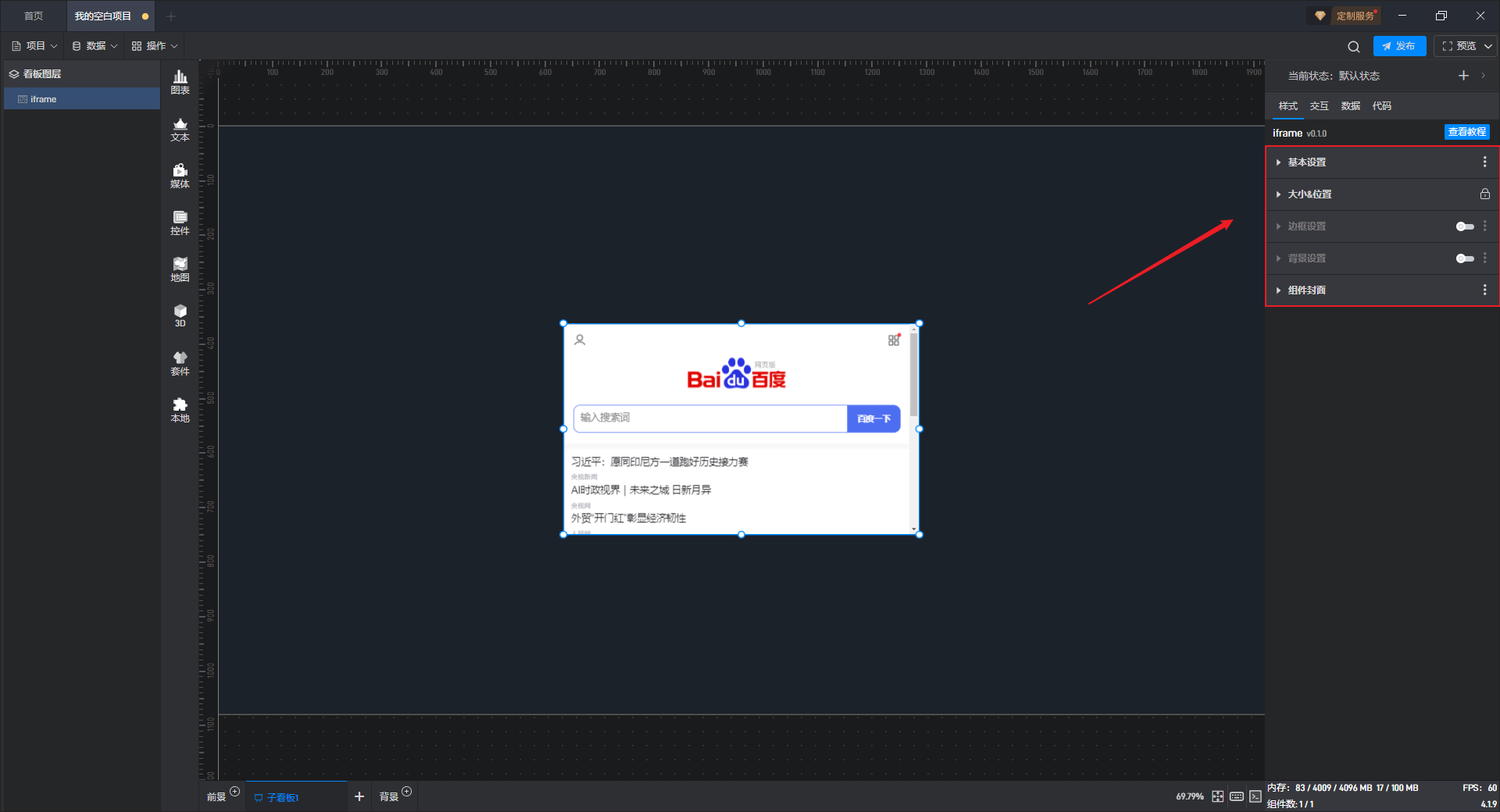 点击选中 iframe 组件,在“样式”界面下“基本设置”项中,可以对 iframe 地址进行设置,默认地址为百度网址链接。