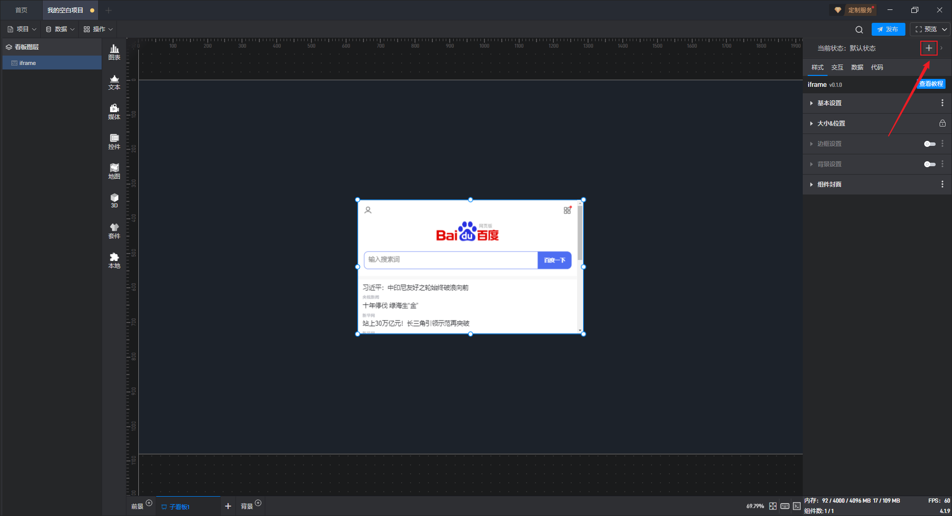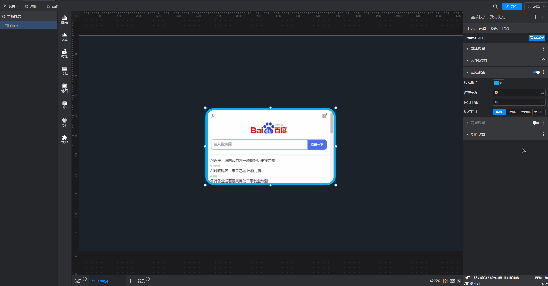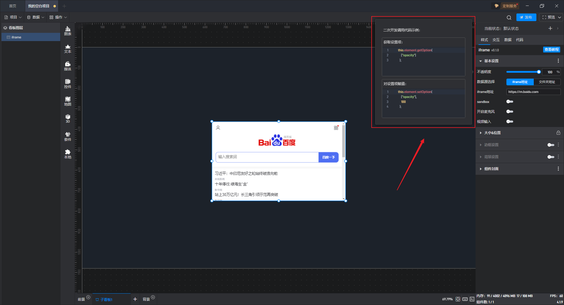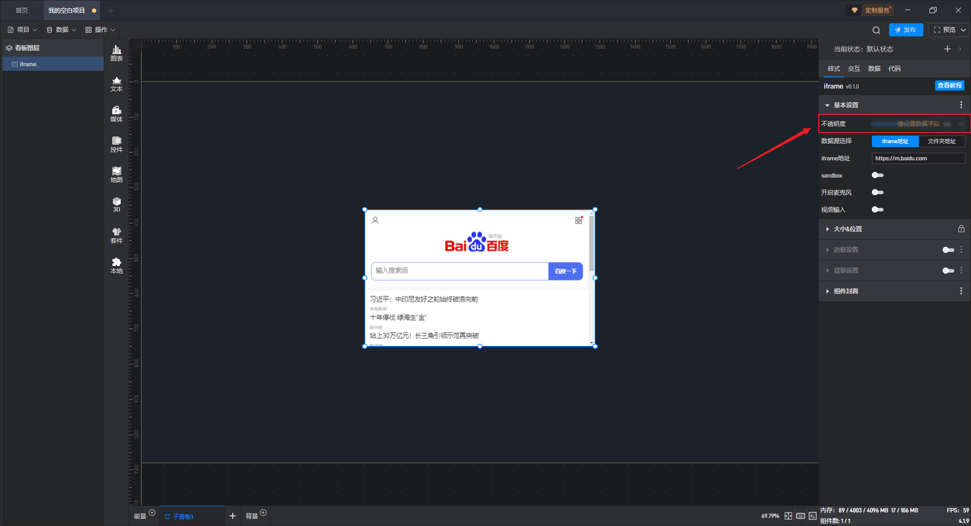 点击选中 iframe 组件,在“样式”界面下“基本设置”项中,可以对 iframe 地址进行设置,默认地址为百度网址链接。