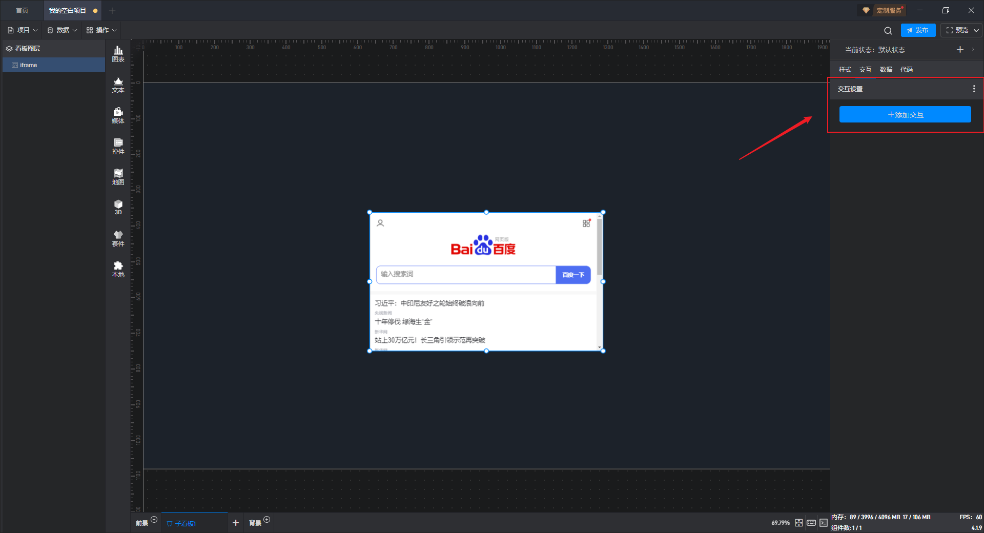 点击选中组件,在右侧设置窗口中切换到“交互”,可以对当前组件的交互进行添加和删除。