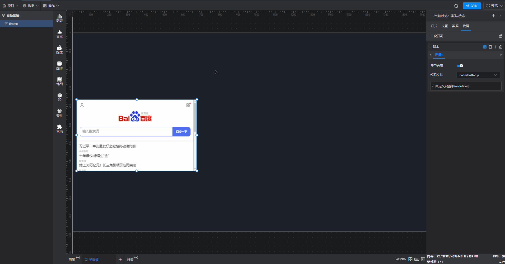 点击选中组件,在右侧设置窗口中切换到“代码”,可以对组件进行二次开发设置。