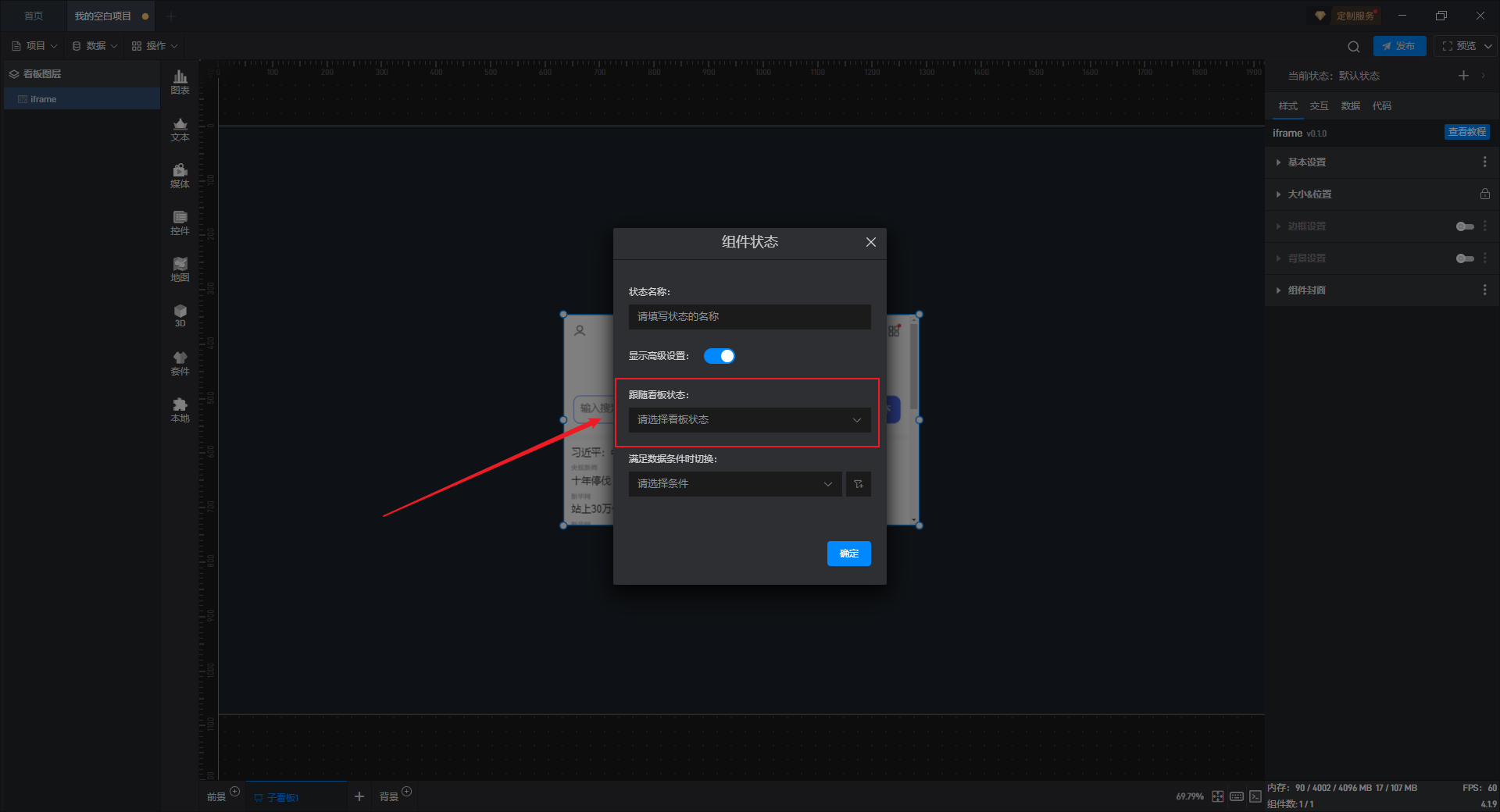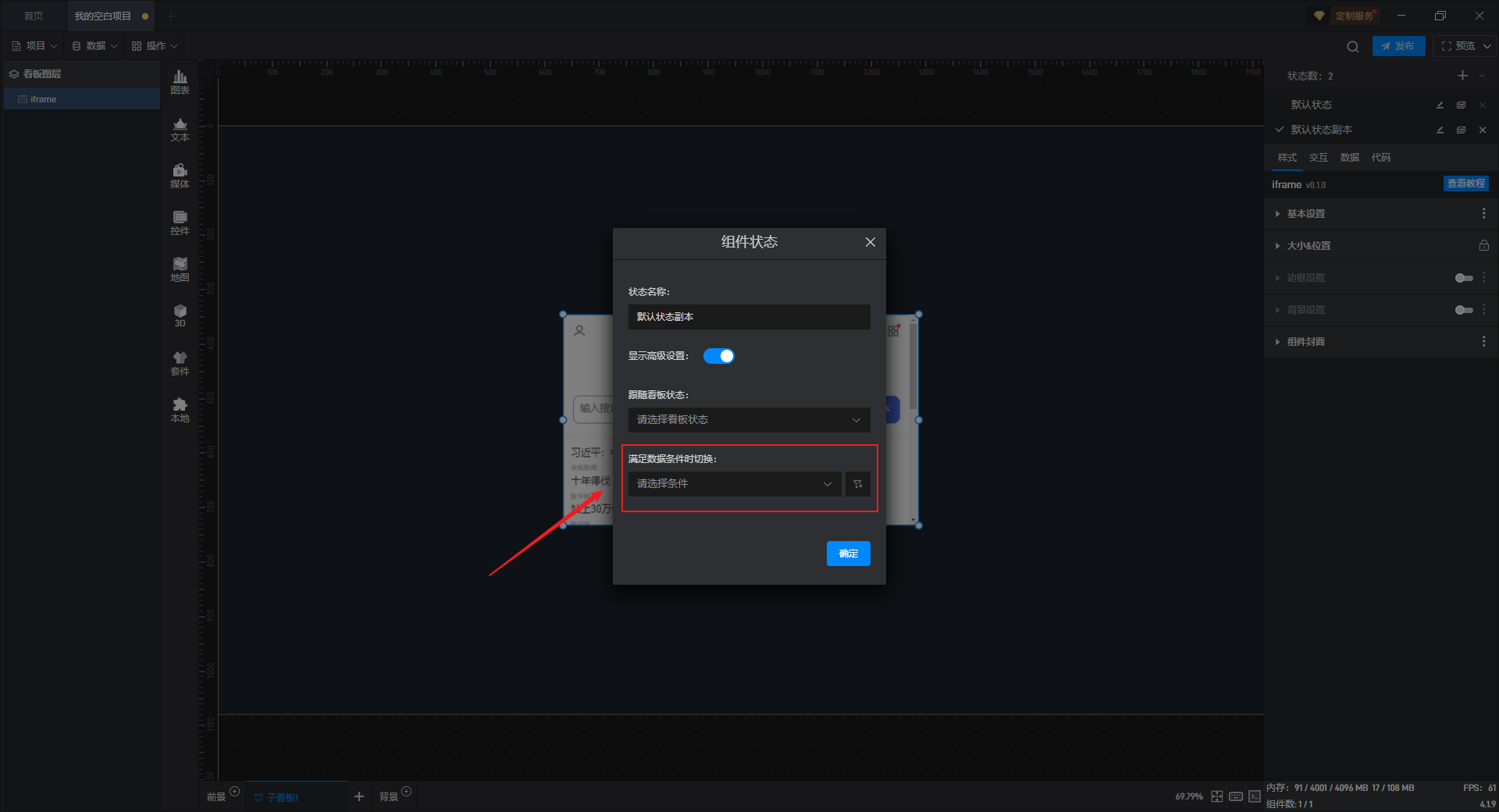 在这里我们可以选择已设置的数据条件,从而在数据条件满足时,组件的状态就会发生变化。