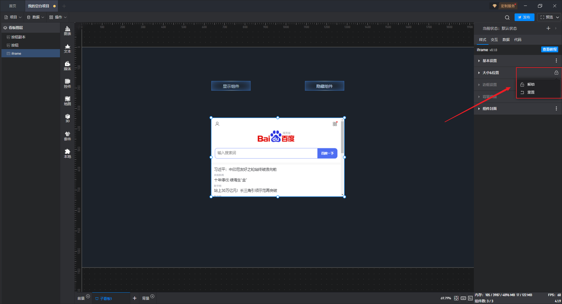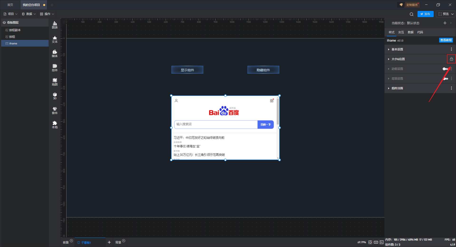 可以通过直接点击和拖动组件来调整大小和位置,也可以通过直接输入宽、高、X 坐标和Y 坐标来设置。