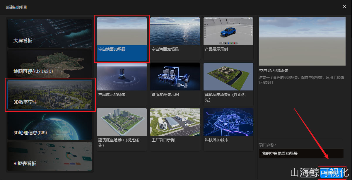 在山海鲸可视化软件中按“新建-3D 数字孪生-空白地面 3D 场景-创建项目”的顺序创建一个空白项目,然后双击该项目进入鲸孪生组件的编辑模式。