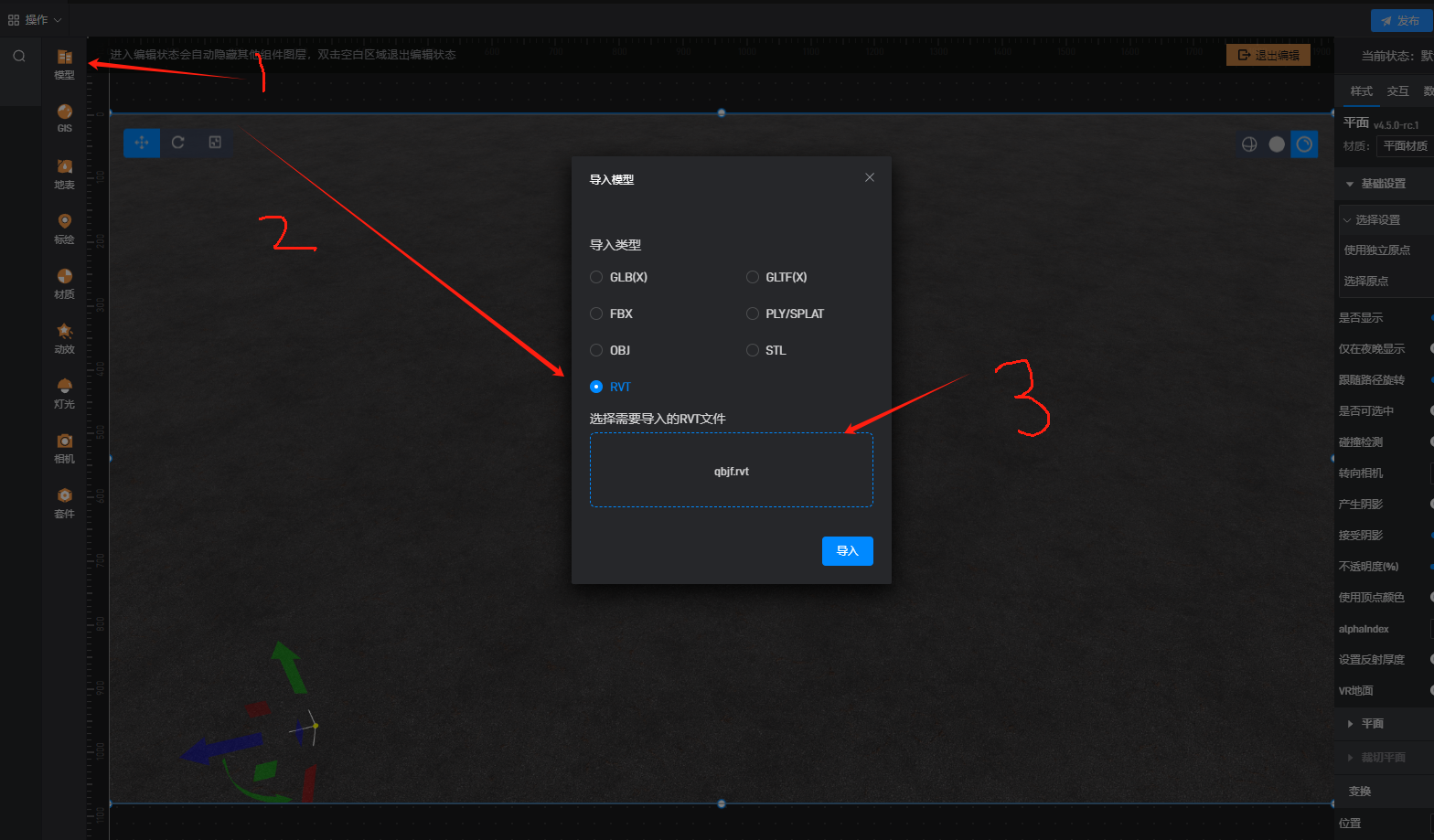 点击左侧功能菜单中的“模型”,选择GLB/GLTF 模型文件,并点击“导入”。