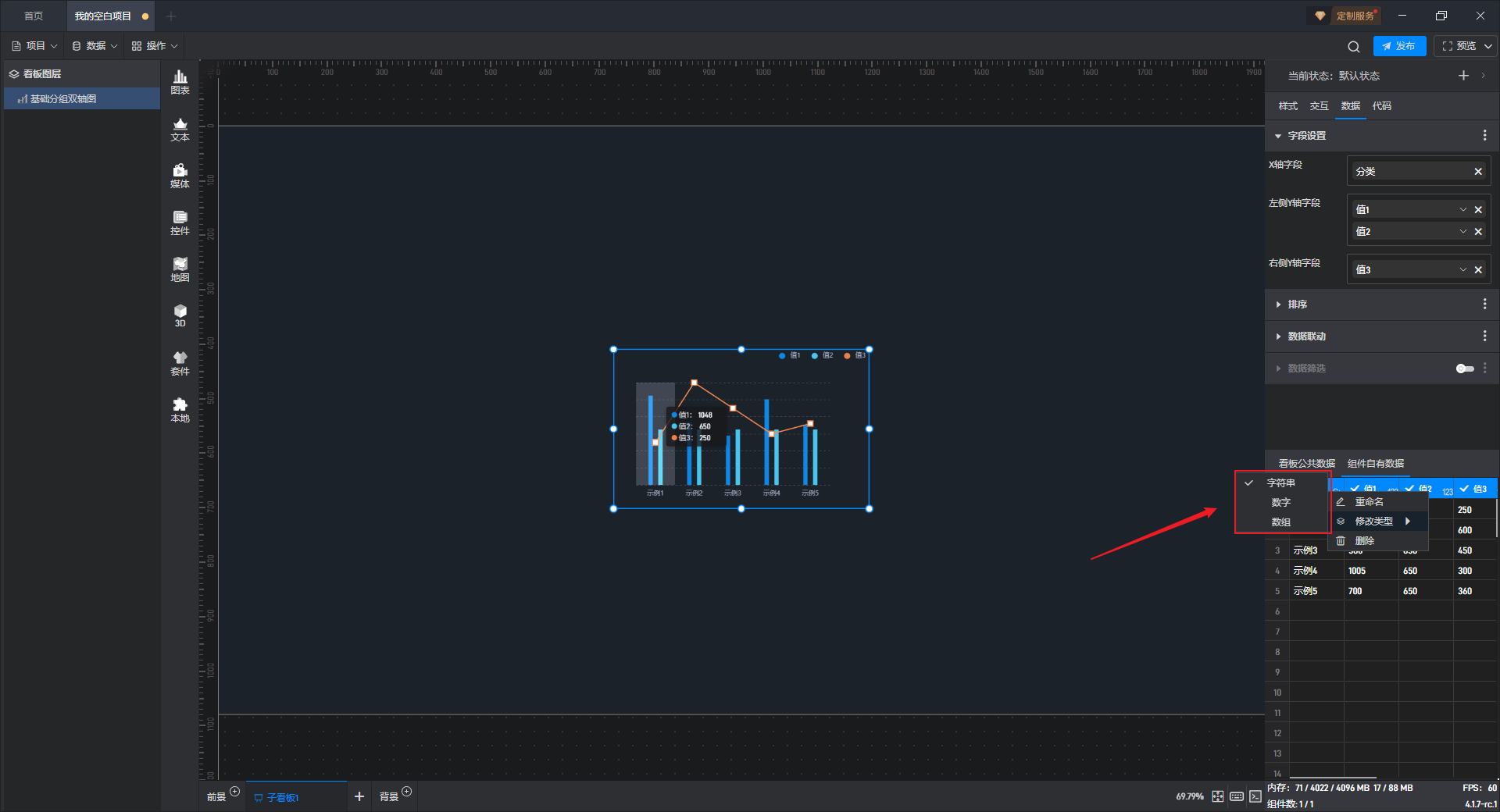字段类型包括:字符串、数字和数组(X 轴字段和系列字段都是字符串类型,Y 轴是数字类型,数组类型用于词云组件),只有在字段类型正确的情况下,组件内容才能正常显示。