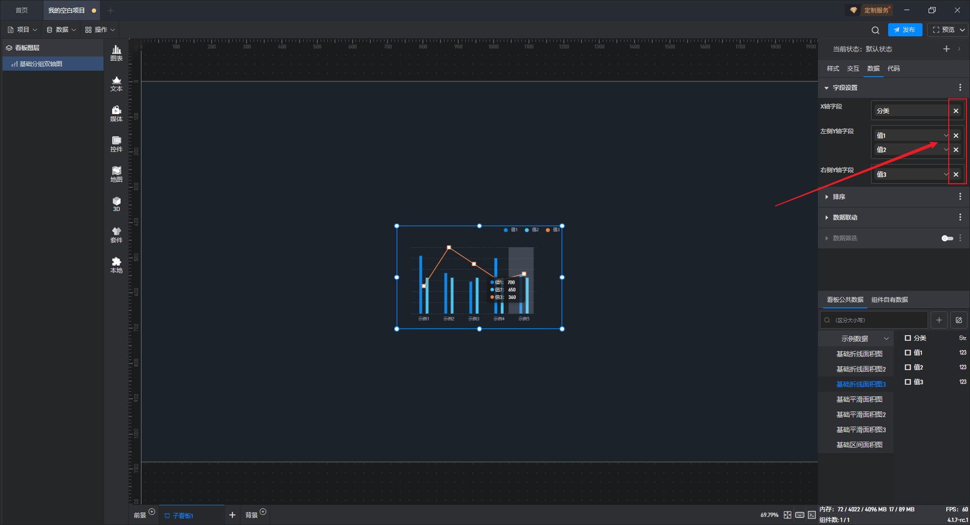 | X 轴字段(分类) | 左侧 Y 轴字段 1(值) | 左侧 Y 轴字段 2(值) | 右侧 Y 轴字段(值) |