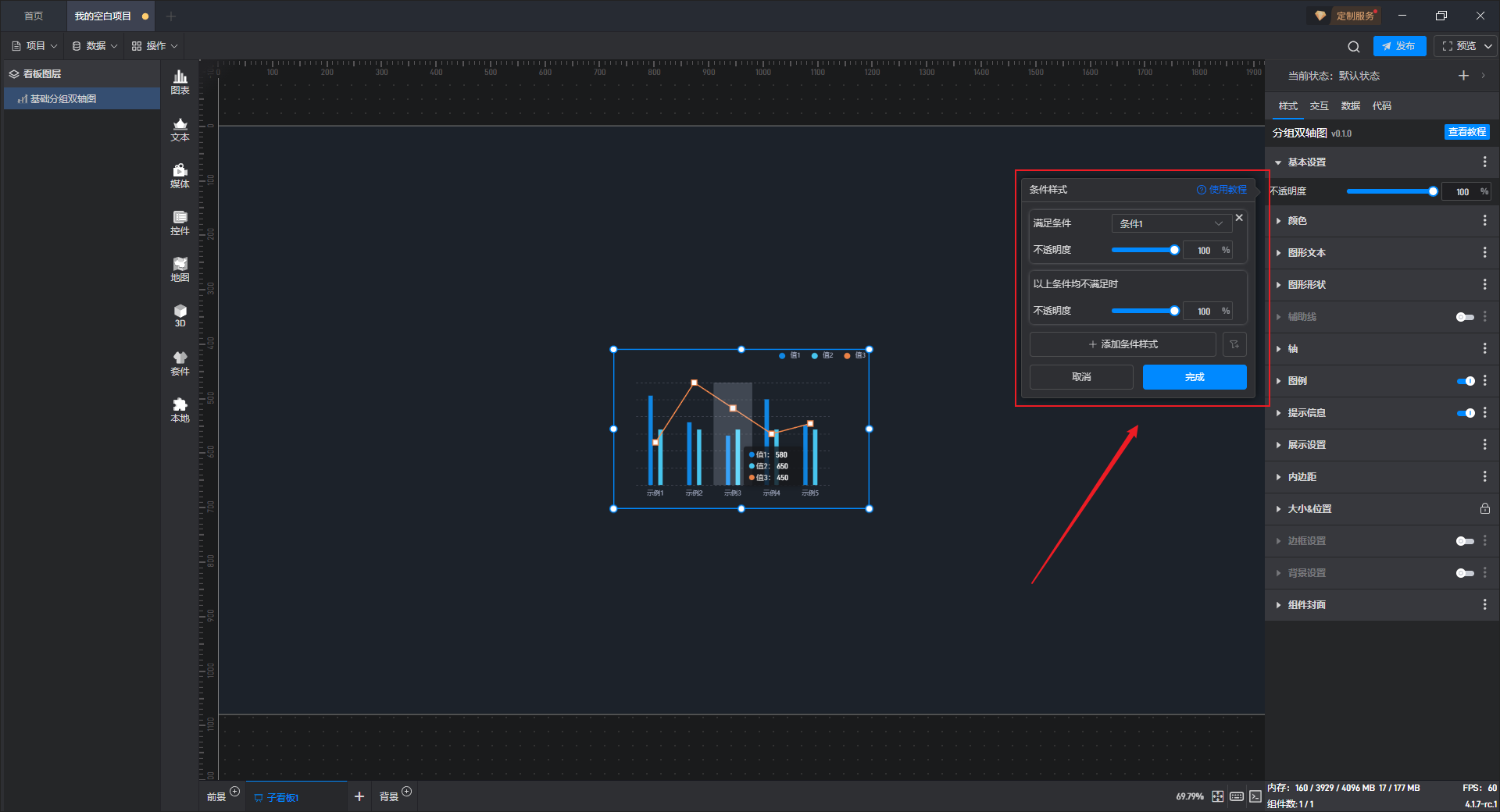 点击选中组件,开启“条件样式”按钮,就可以进行条件样式的设置。