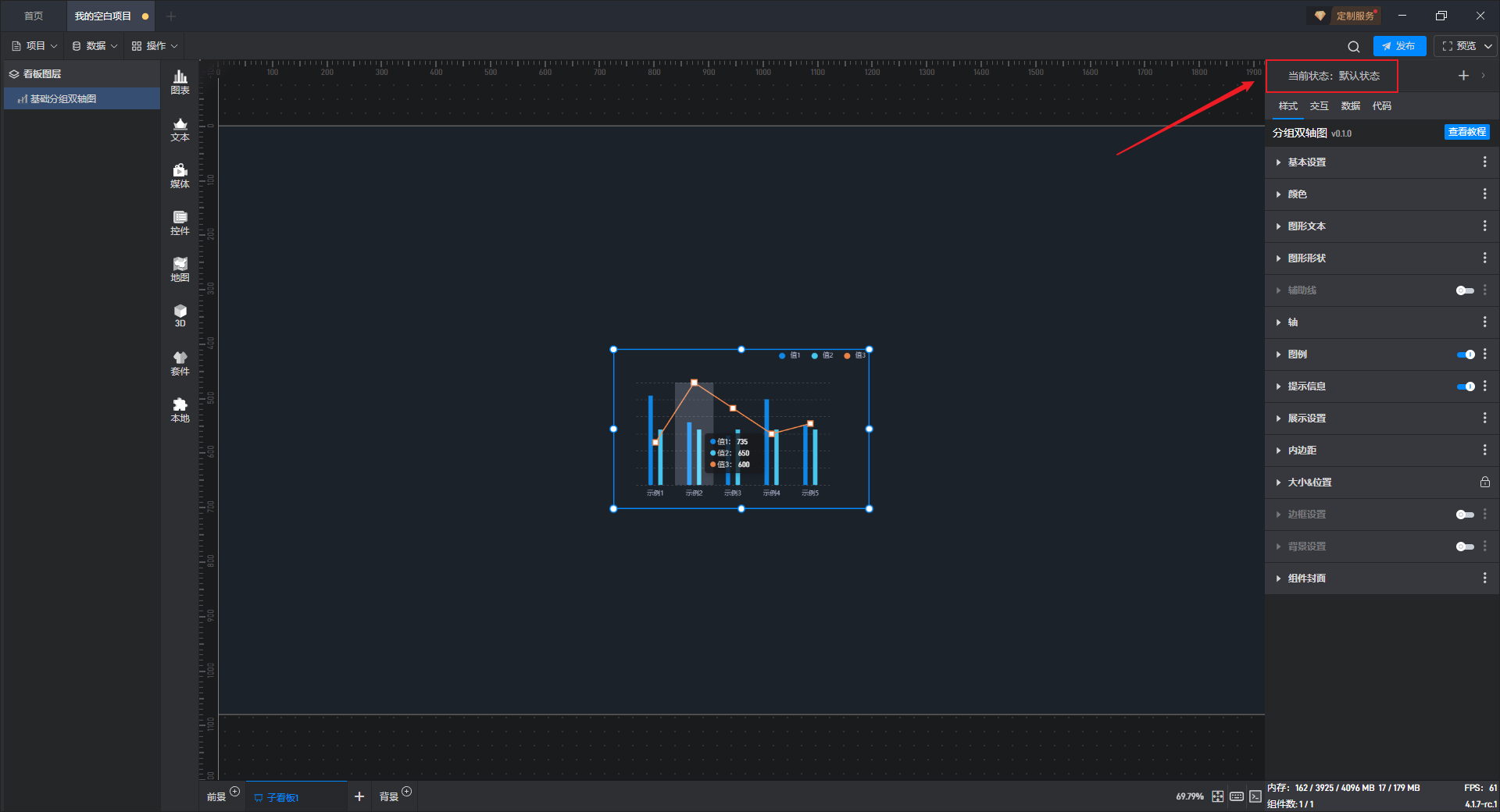 多状态主要用于通过数据条件或是点击交互(通常是点击其他组件来触发本组件的状态切换)来切换组件设置项的场景,这里的设置项包括组件的样式、交互、数据和代码。