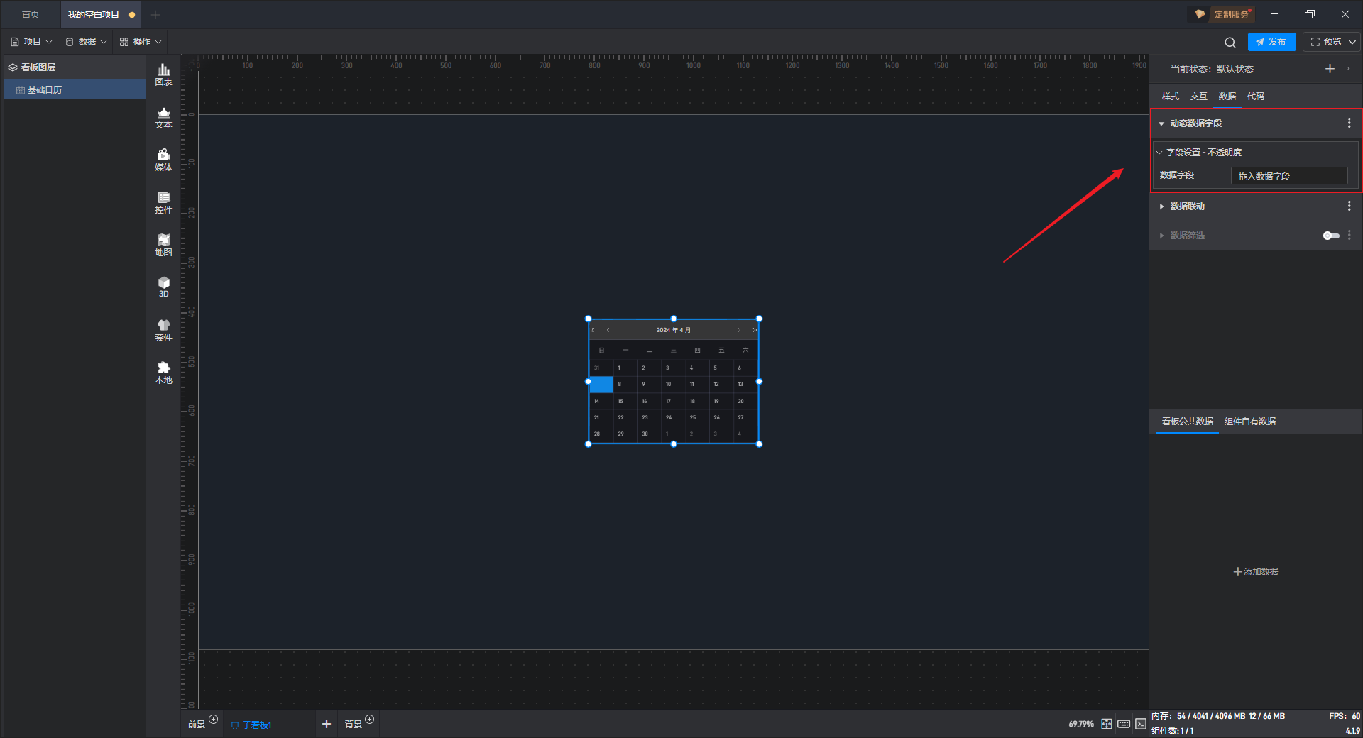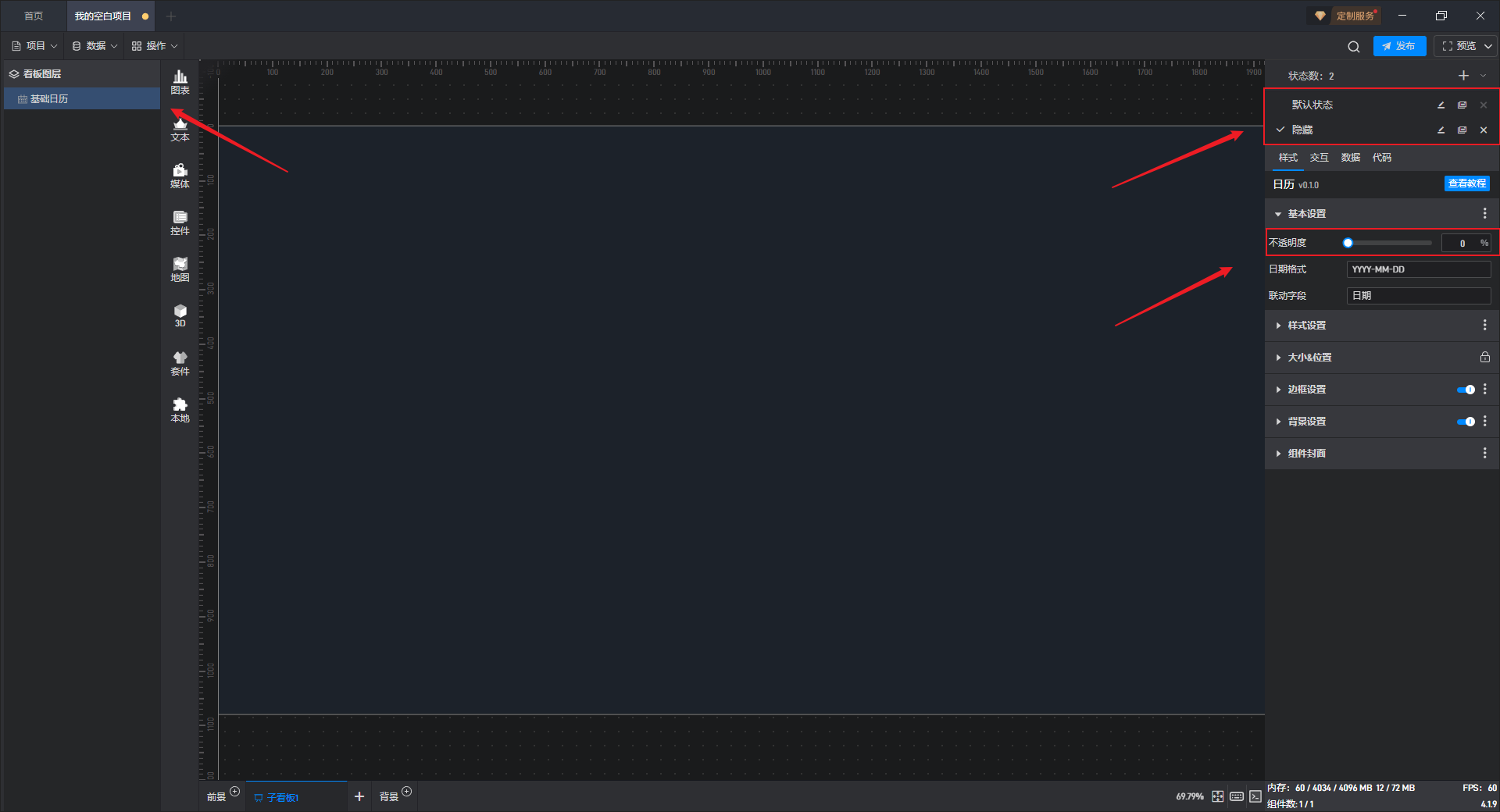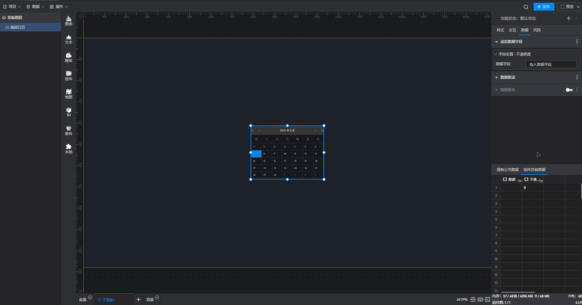 添加一个数值为“0”的数据到数据字段中,可以看到通过动态数据字段将不透明度的数值修改为“0”,从而使组件隐藏。