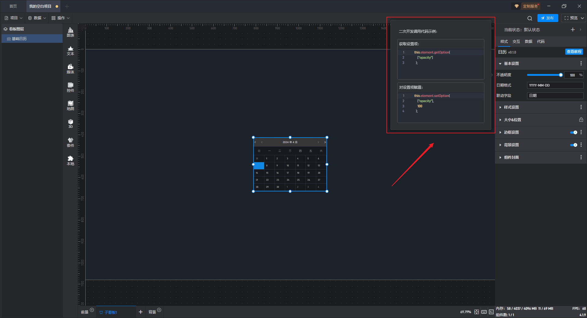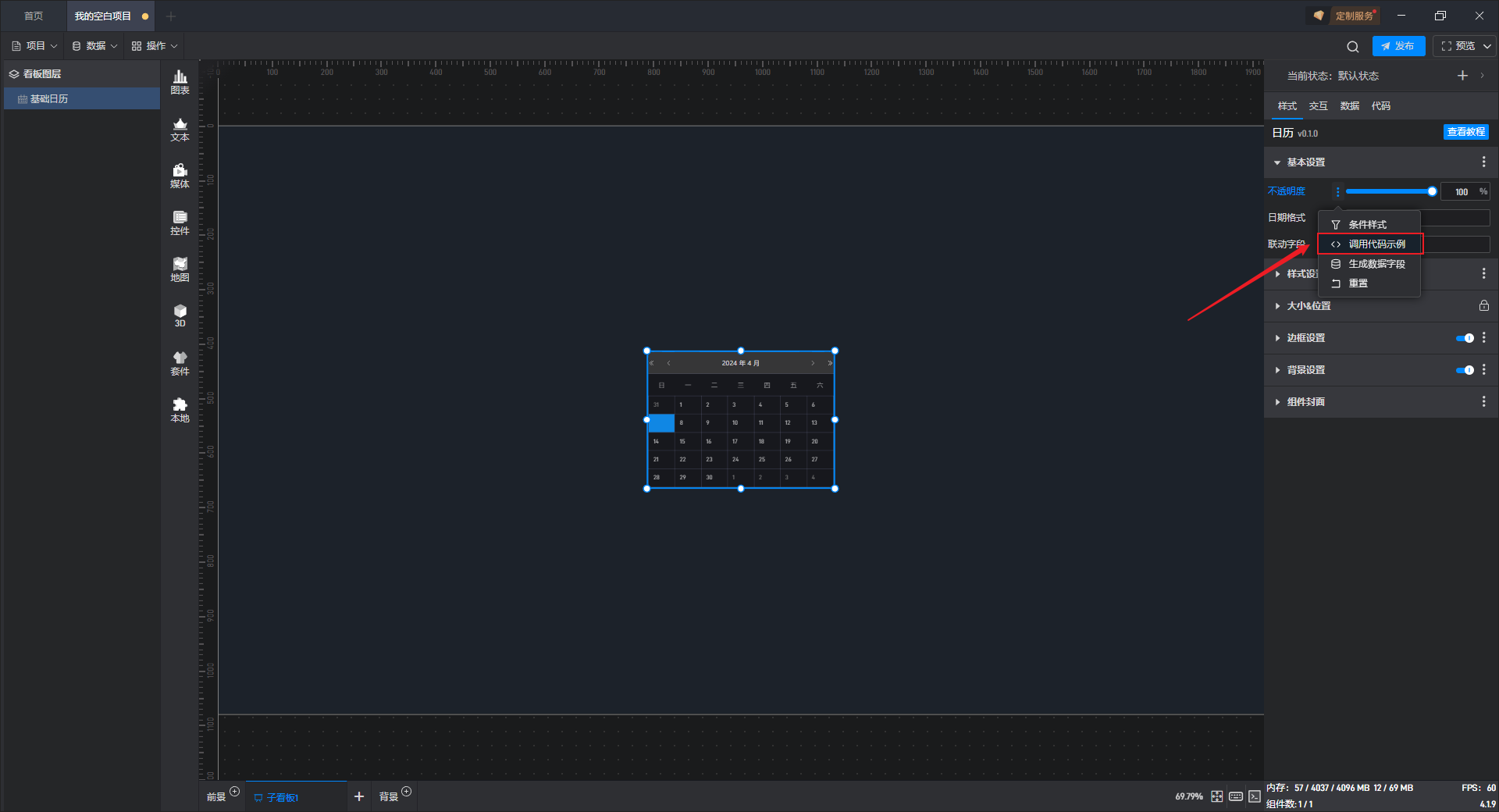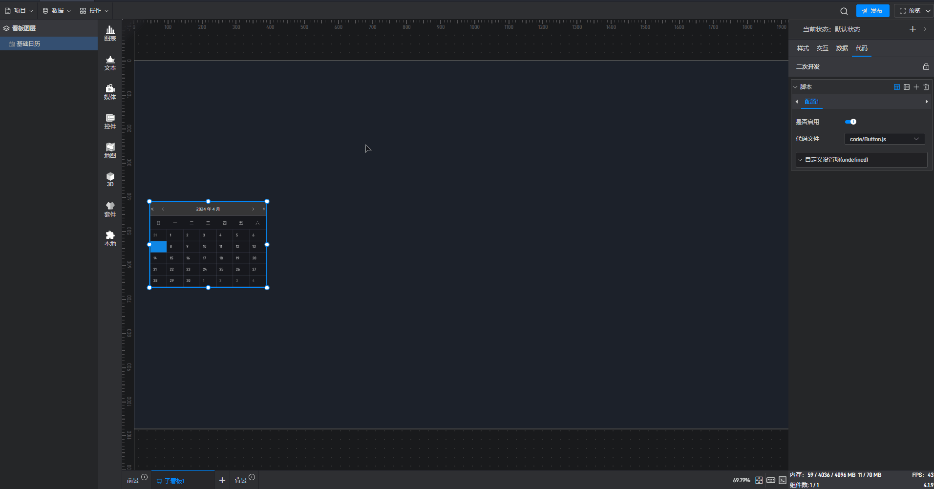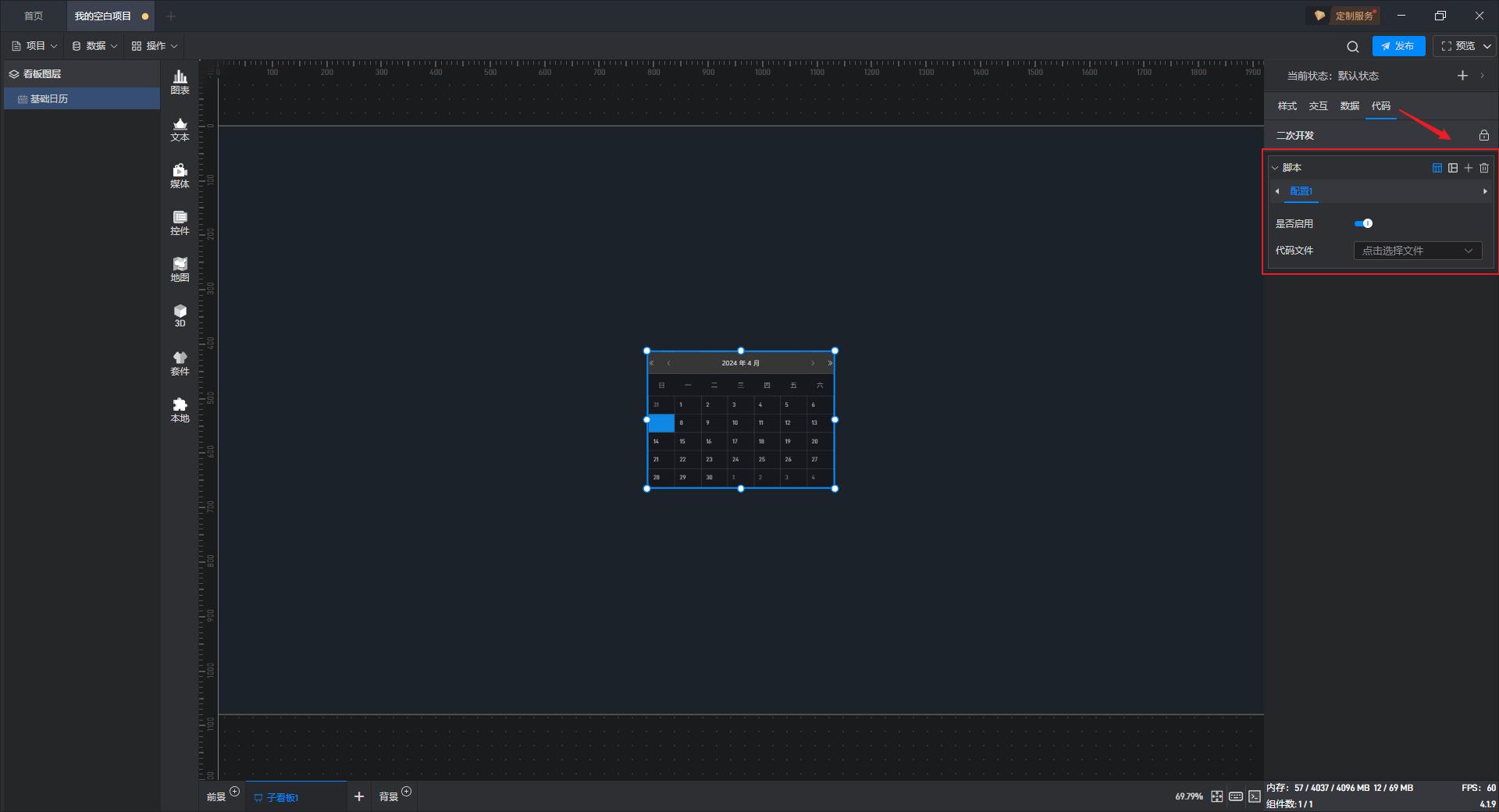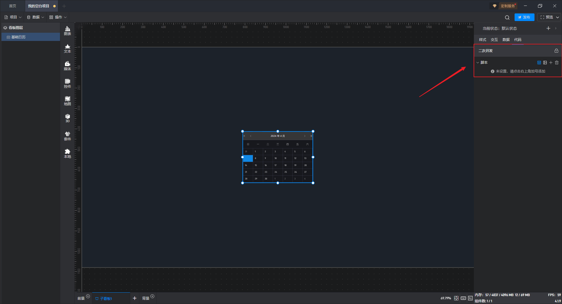 点击选中组件,在右侧设置窗口中切换到“代码”,可以对组件进行二次开发设置。