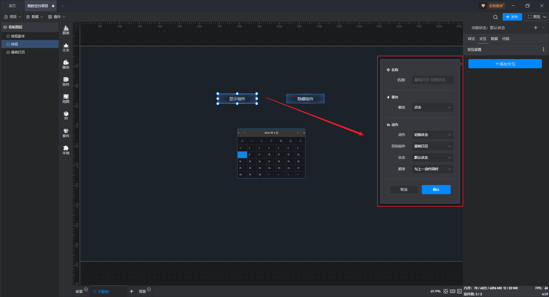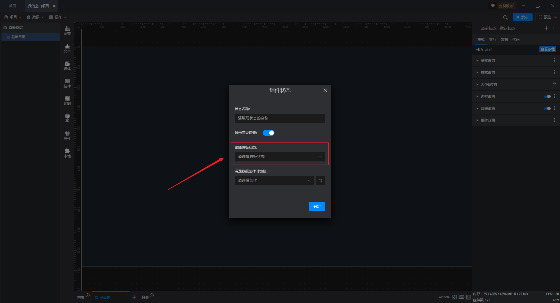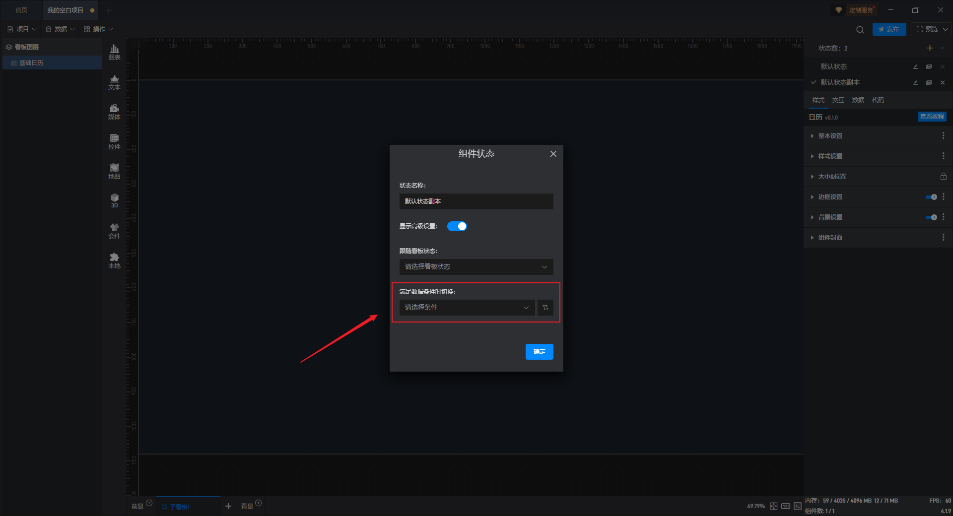 在这里我们可以选择已设置的数据条件,从而在数据条件满足时,组件的状态就会发生变化。