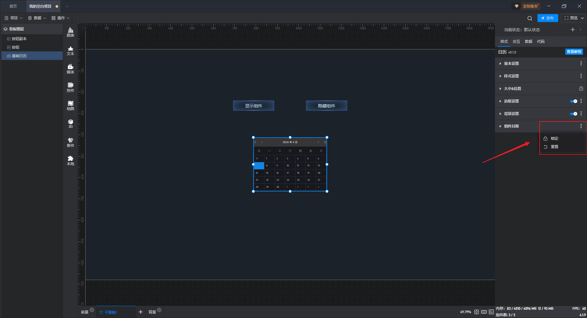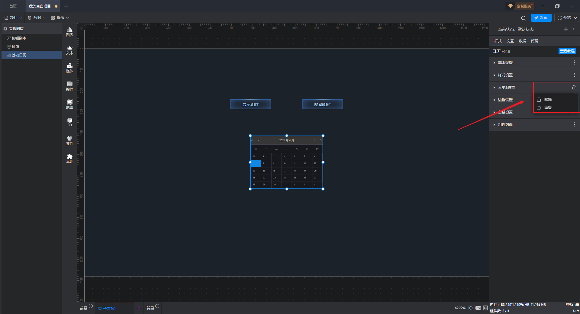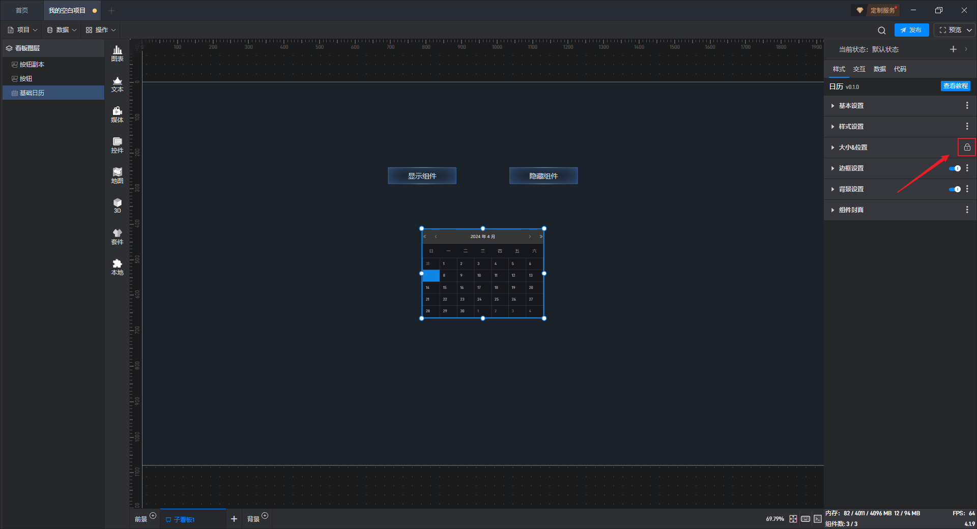 可以通过直接点击和拖动组件来调整大小和位置,也可以通过直接输入宽、高、X 坐标和Y 坐标来设置。