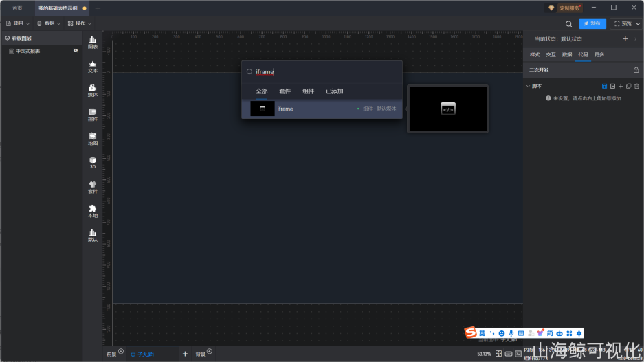 山海鲸虽然提供了二次开发的接口,可以通过代码很方便的对已有的组件进行功能上的扩展;也支持直接通过 eCharts 组件实现基于 eCharts 来从 0 构建的新组件。但是还是会有一些时候我们需要完全自由的开发环境,比如希望引入第三方的组件库,希望自己写 css 和 html 等,这种情况就可以使用 iFrame 嵌入的方式。