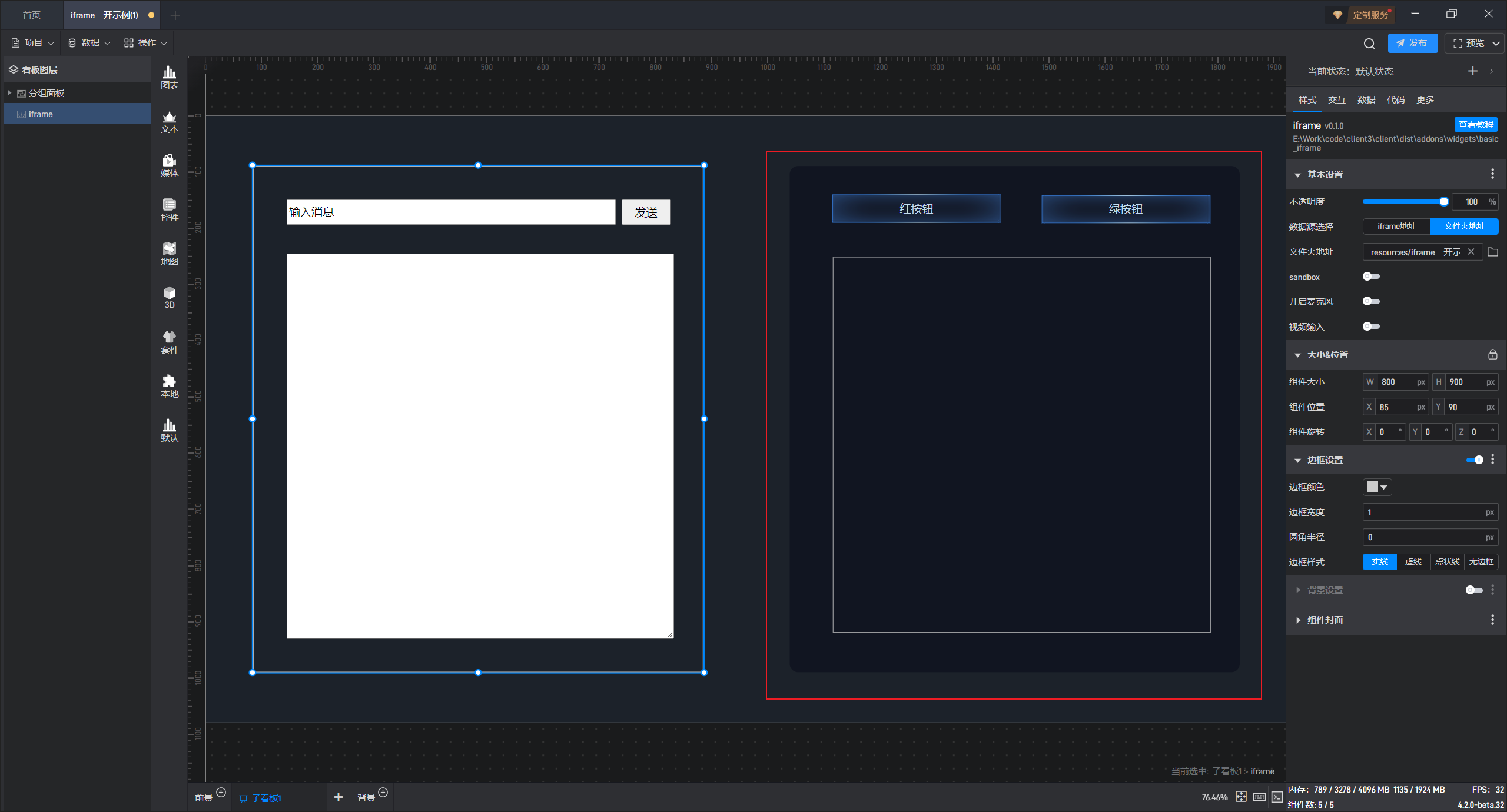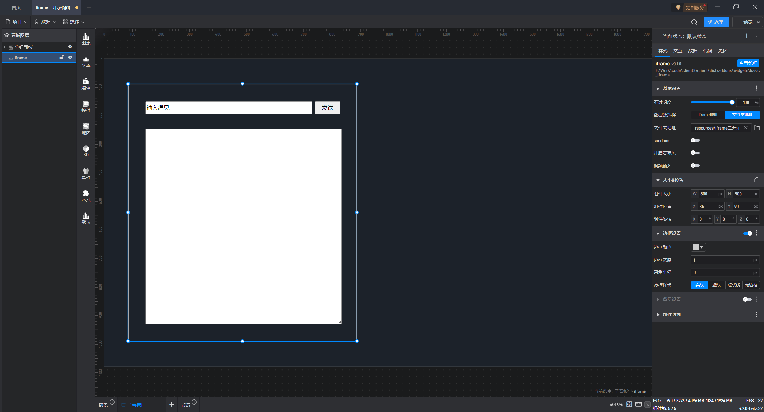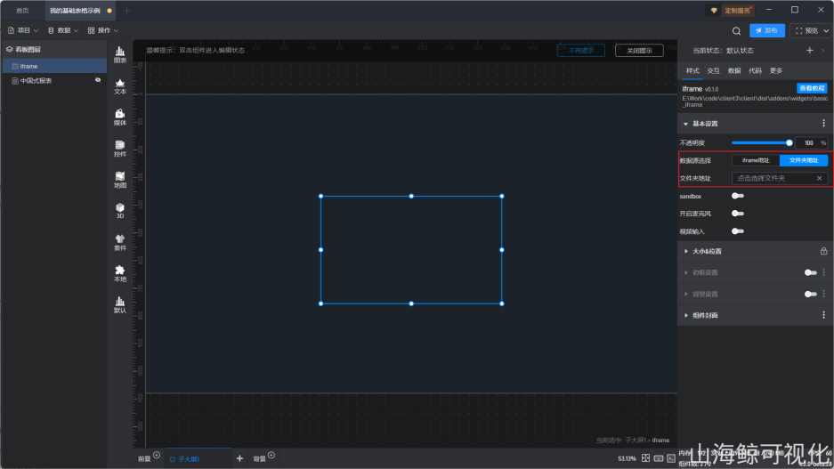 回到山海鲸软件中,选中 iFrame 组件,在前面提到的属性面板中的文件夹地址选择刚刚创建的文件夹,点击确定,可以看到,网页中的元素已经正常显示了,我们简单的调整一下 iFrame 组件的位置: