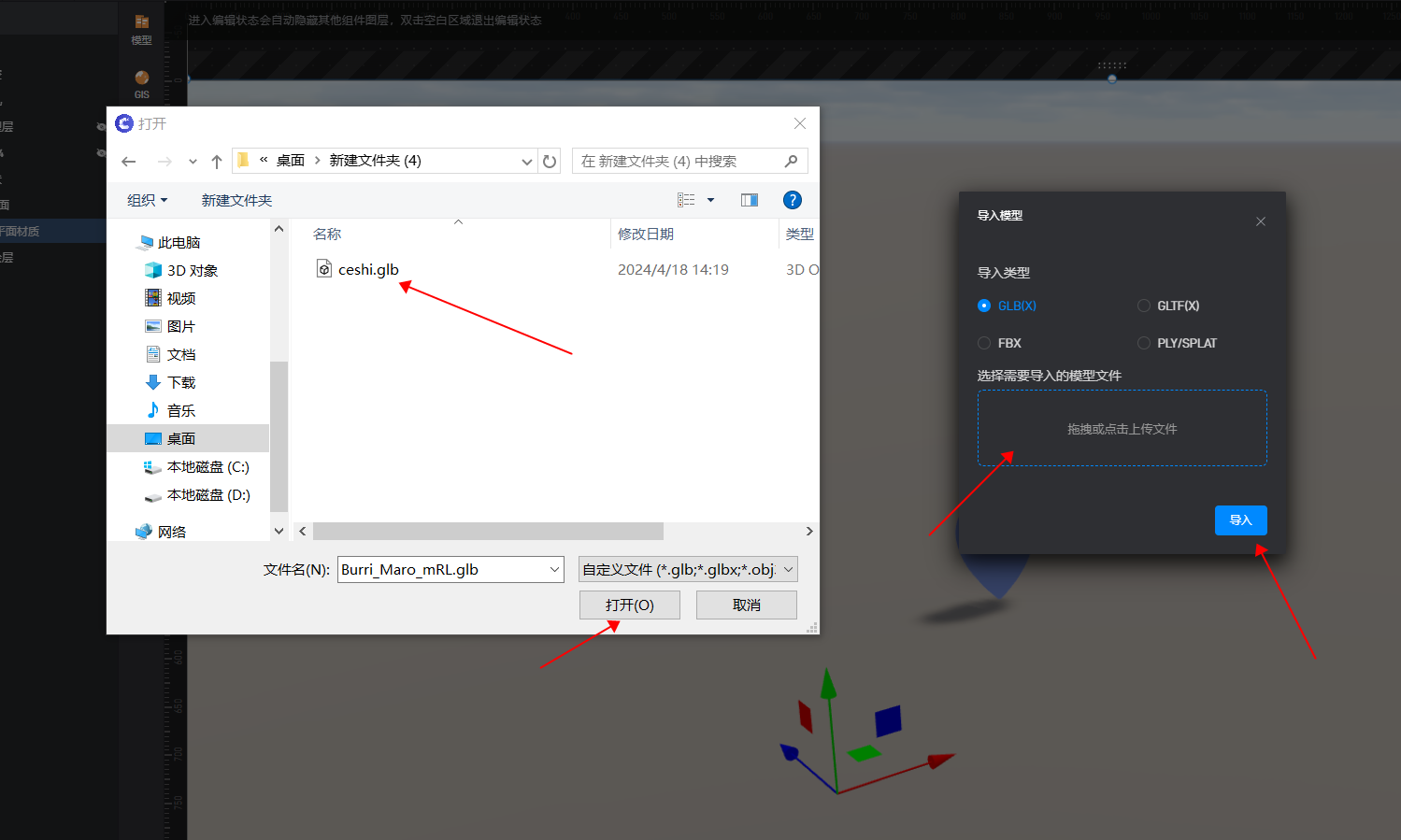 “双击”进入鲸孪生编辑界面,点击左侧功能菜单中的“模型”,选择“sketchup”导出的 glb 模型,并点击“导入”。