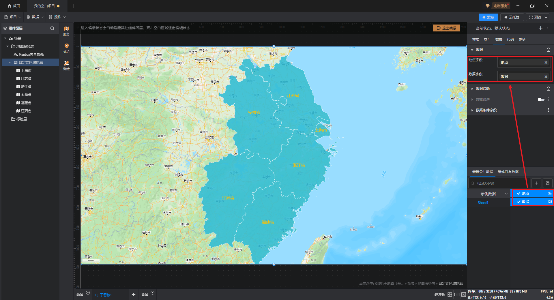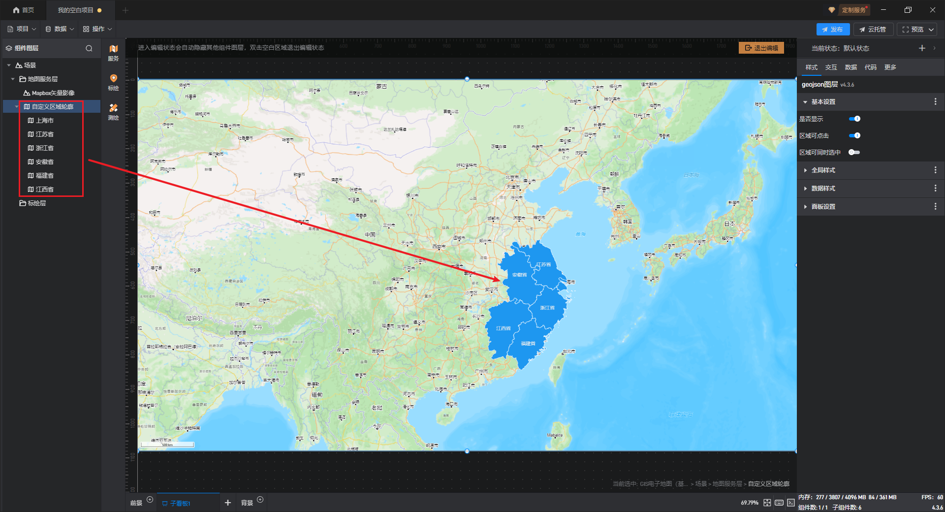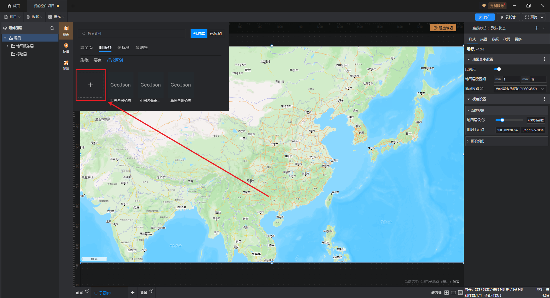 双击进入鲸地图的“编辑模式”后,我们可以删除鲸地图预设的行政区划,然后点击“服务-行政区划”的“+”按钮来快速添加一个自定义区域。