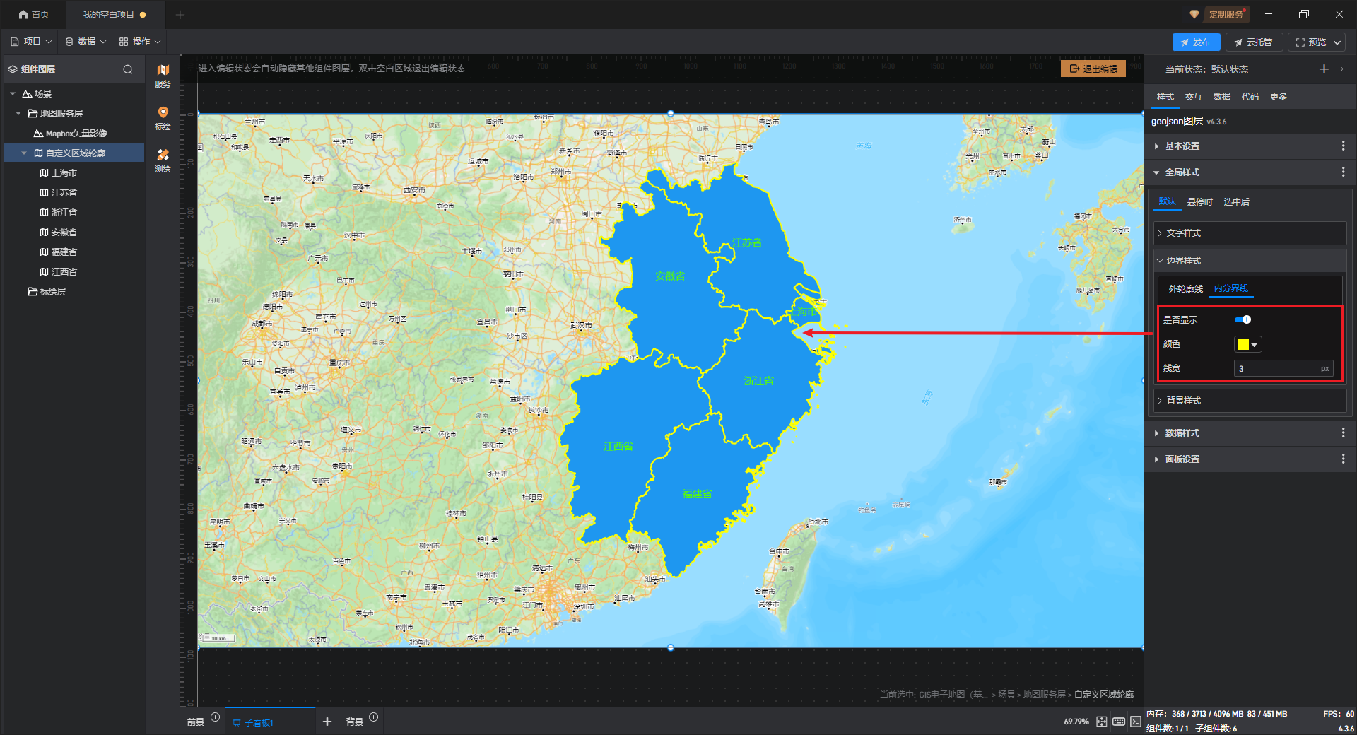 这里选择江西省、江苏省、浙江省、安徽省、福建省和上海市这六个省份作为自定义区域,导入该自定义区域轮廓进行演示,效果如下图所示: