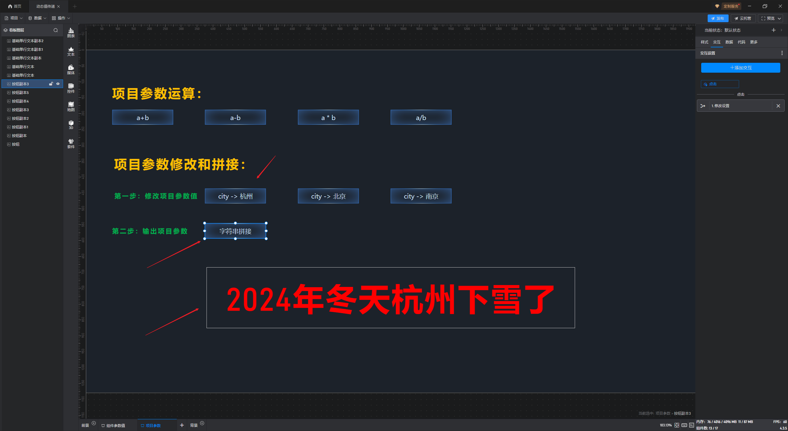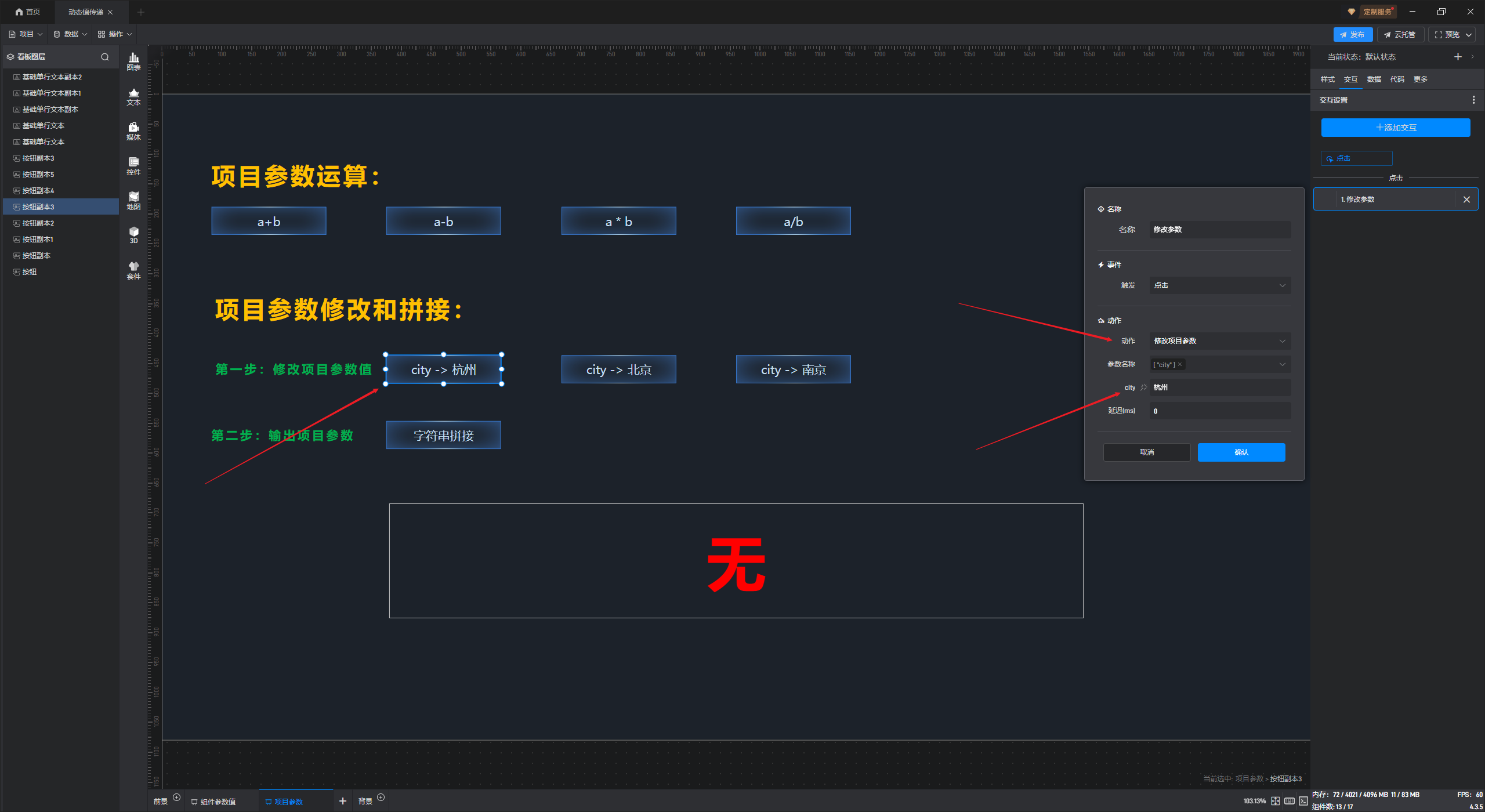 如下图,这里我们先添加了一个交互来修改项目参数,选择对应的项目参数后,给这个参数传递了一个静态值“杭州”。