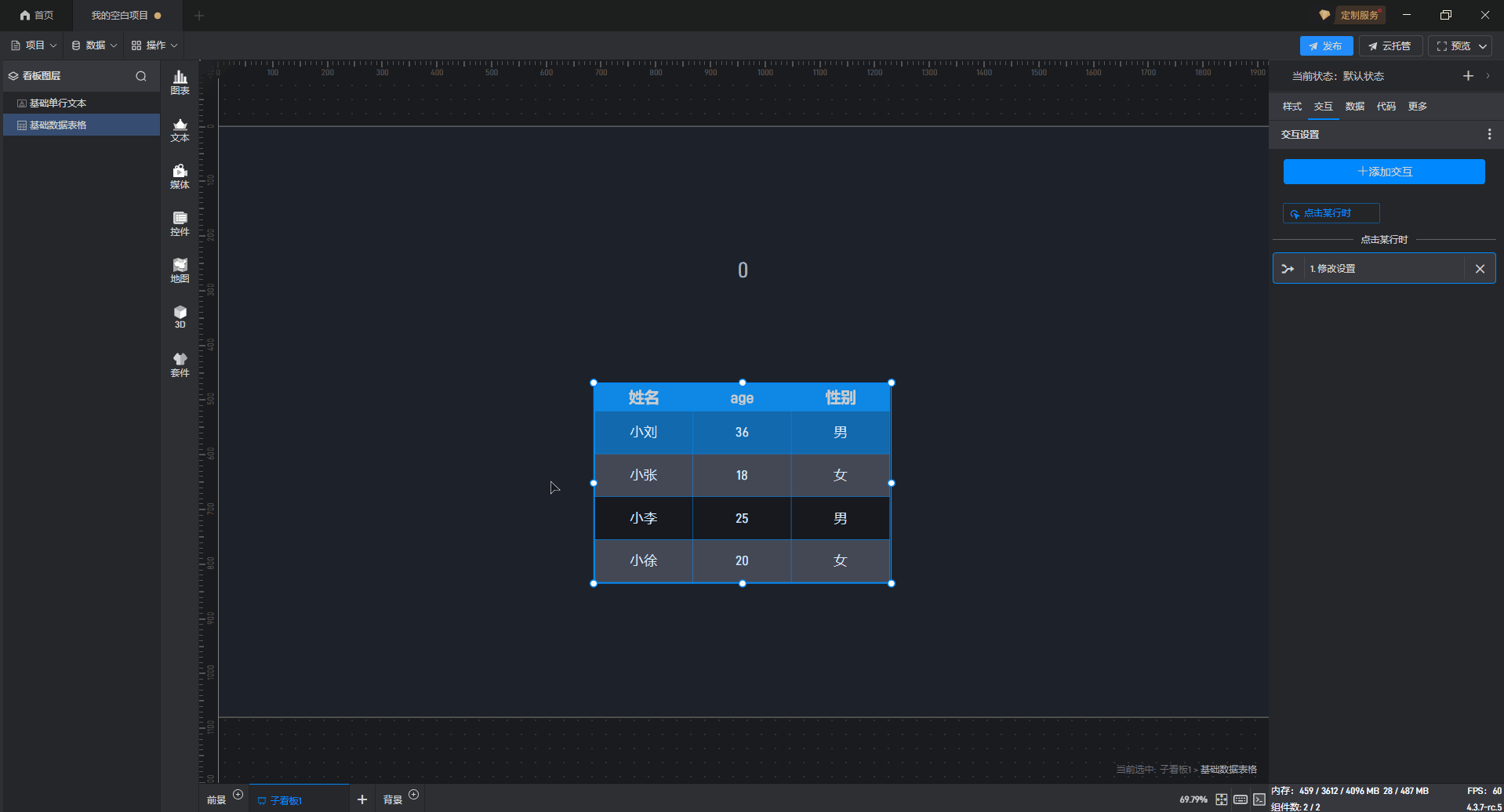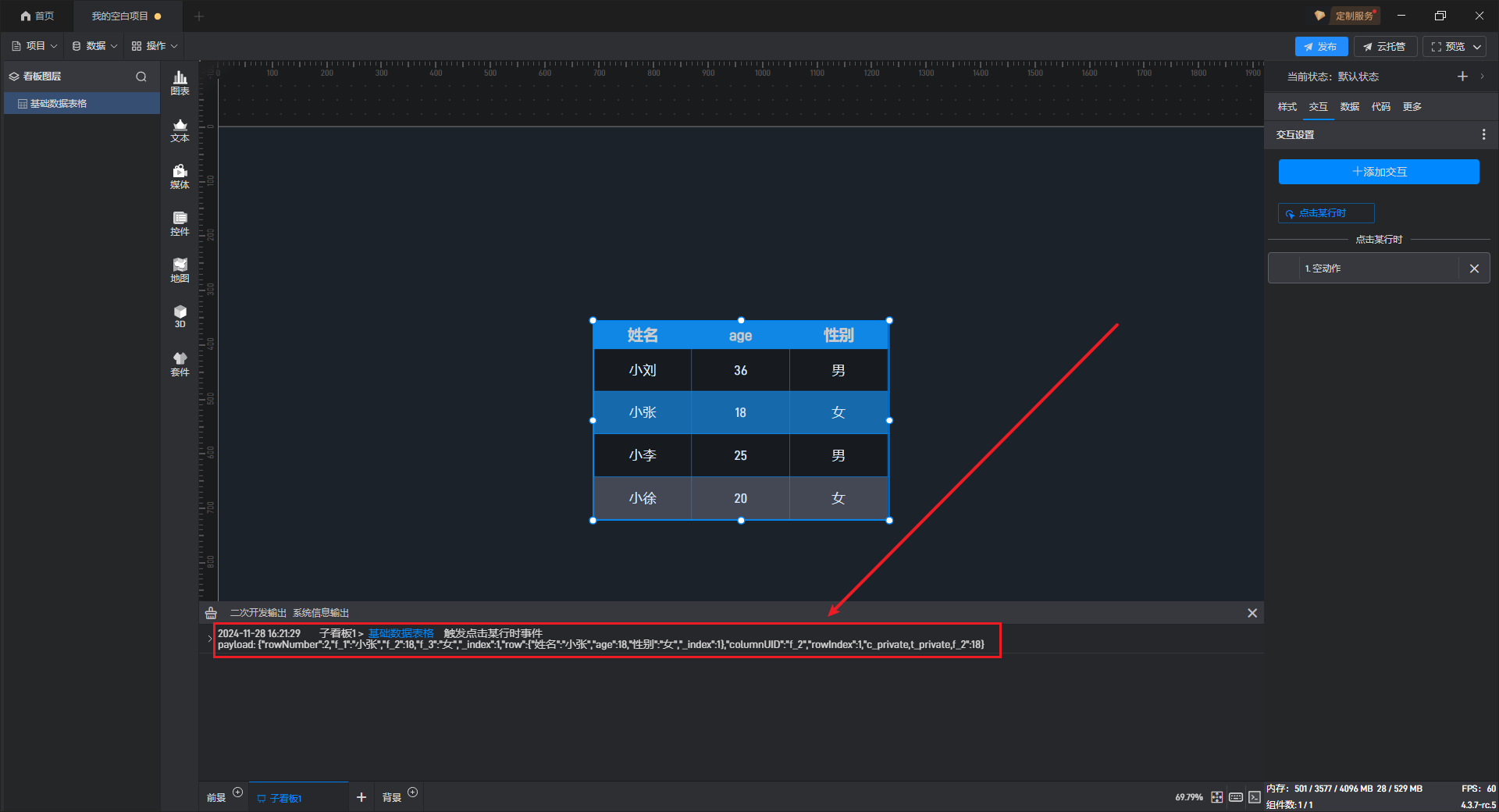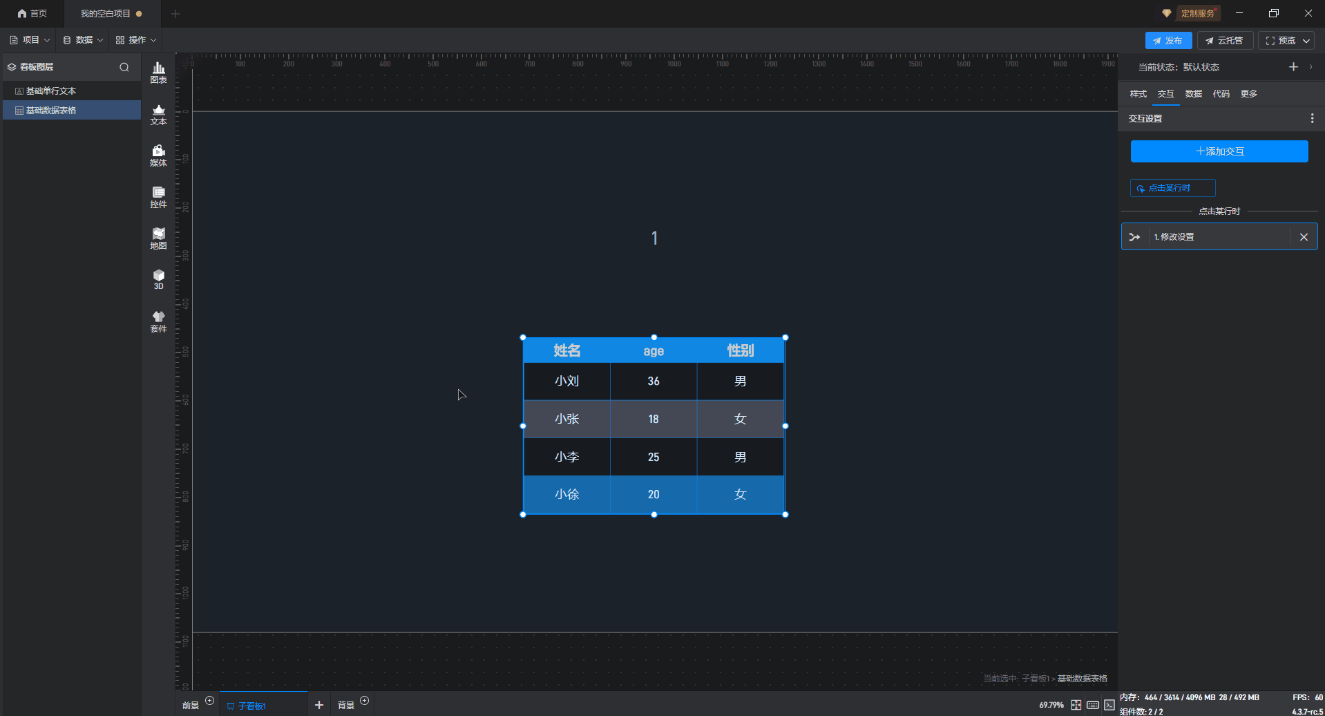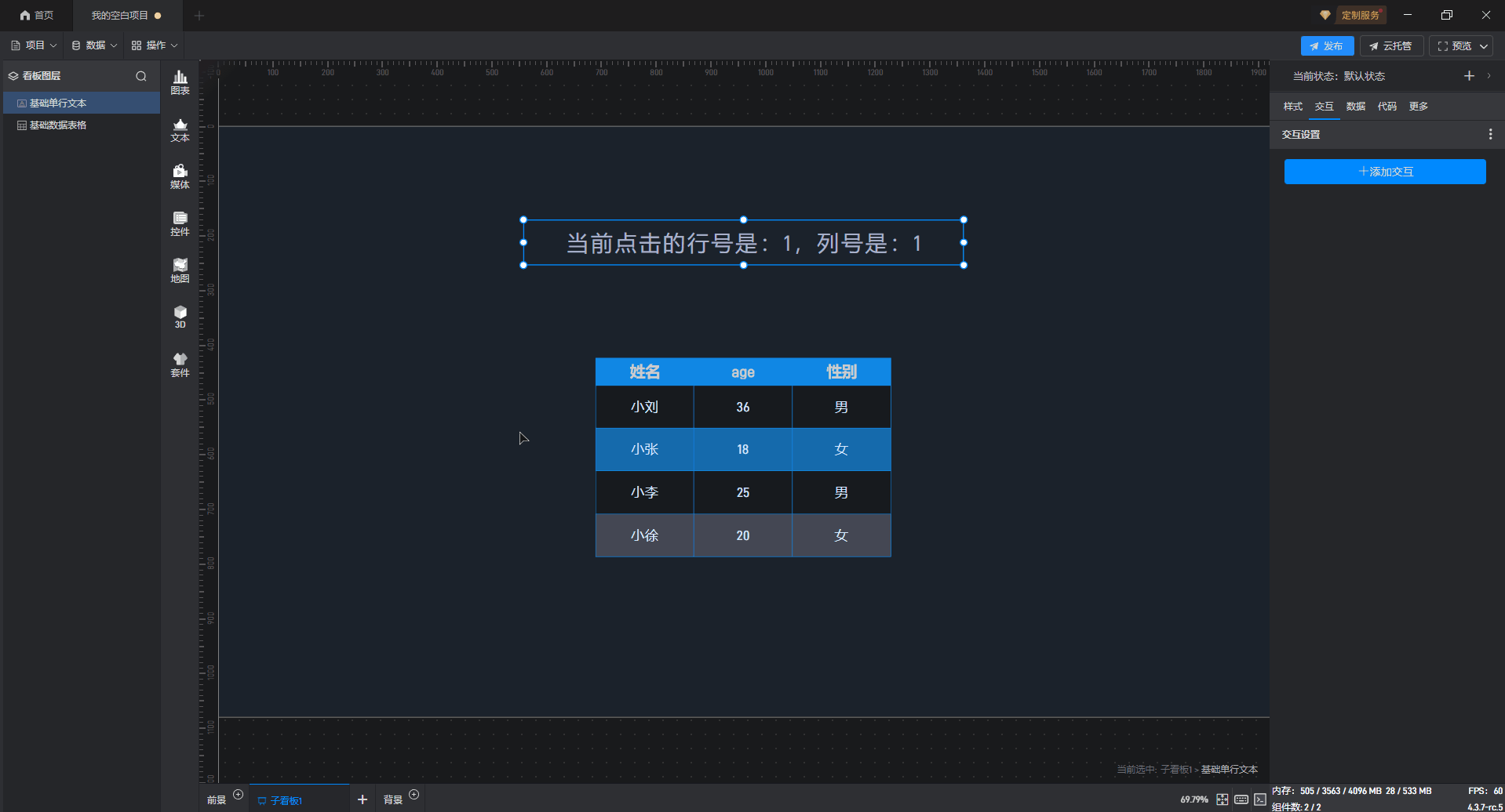 下面使用“基础单行文本”组件和“数据表格”组件进行演示,实现点击数据表格,基础单行文本显示对应的行号、列号和数据的效果。