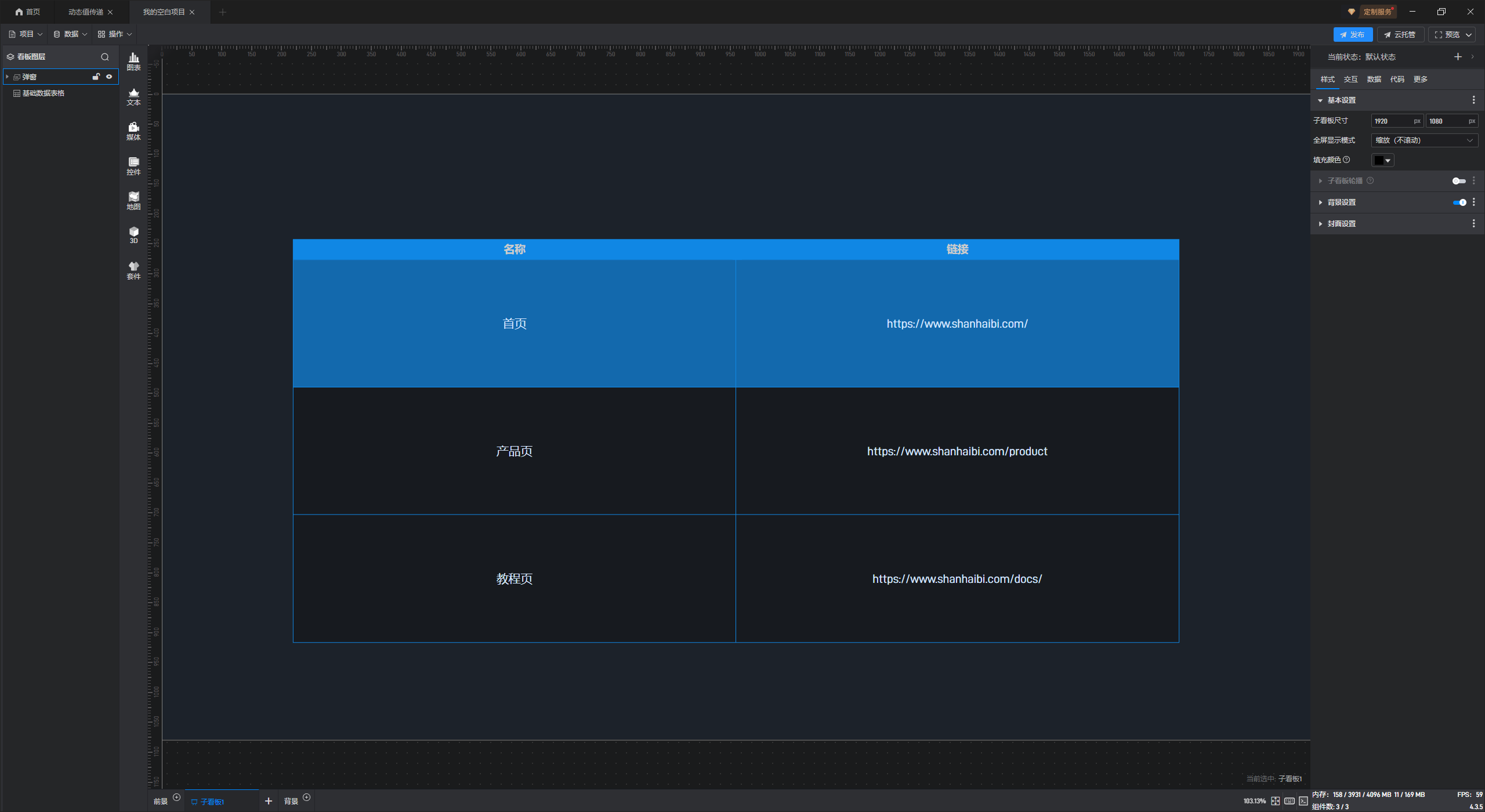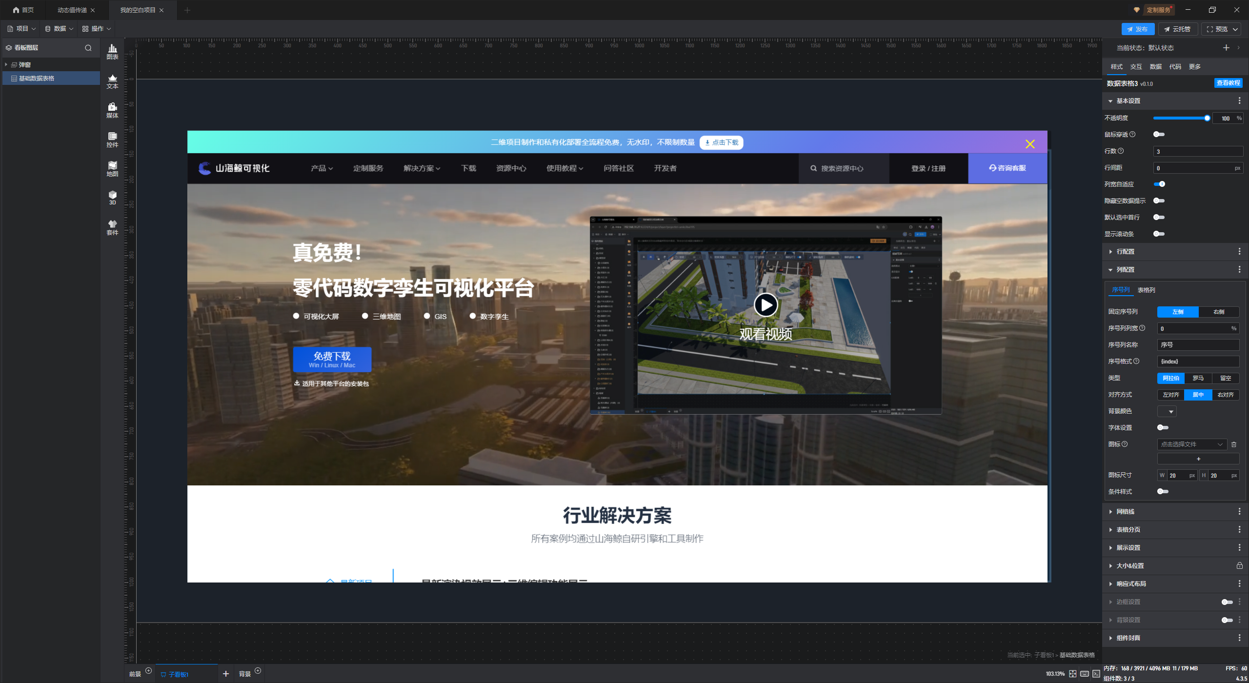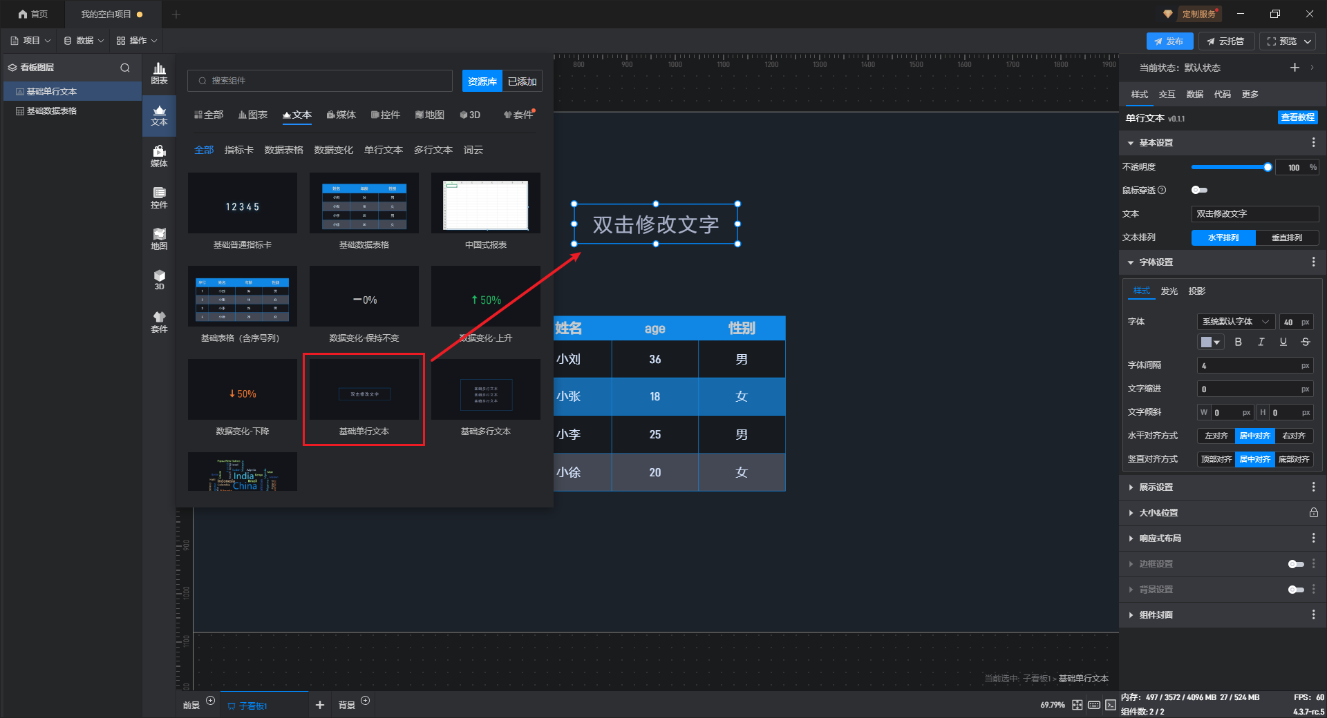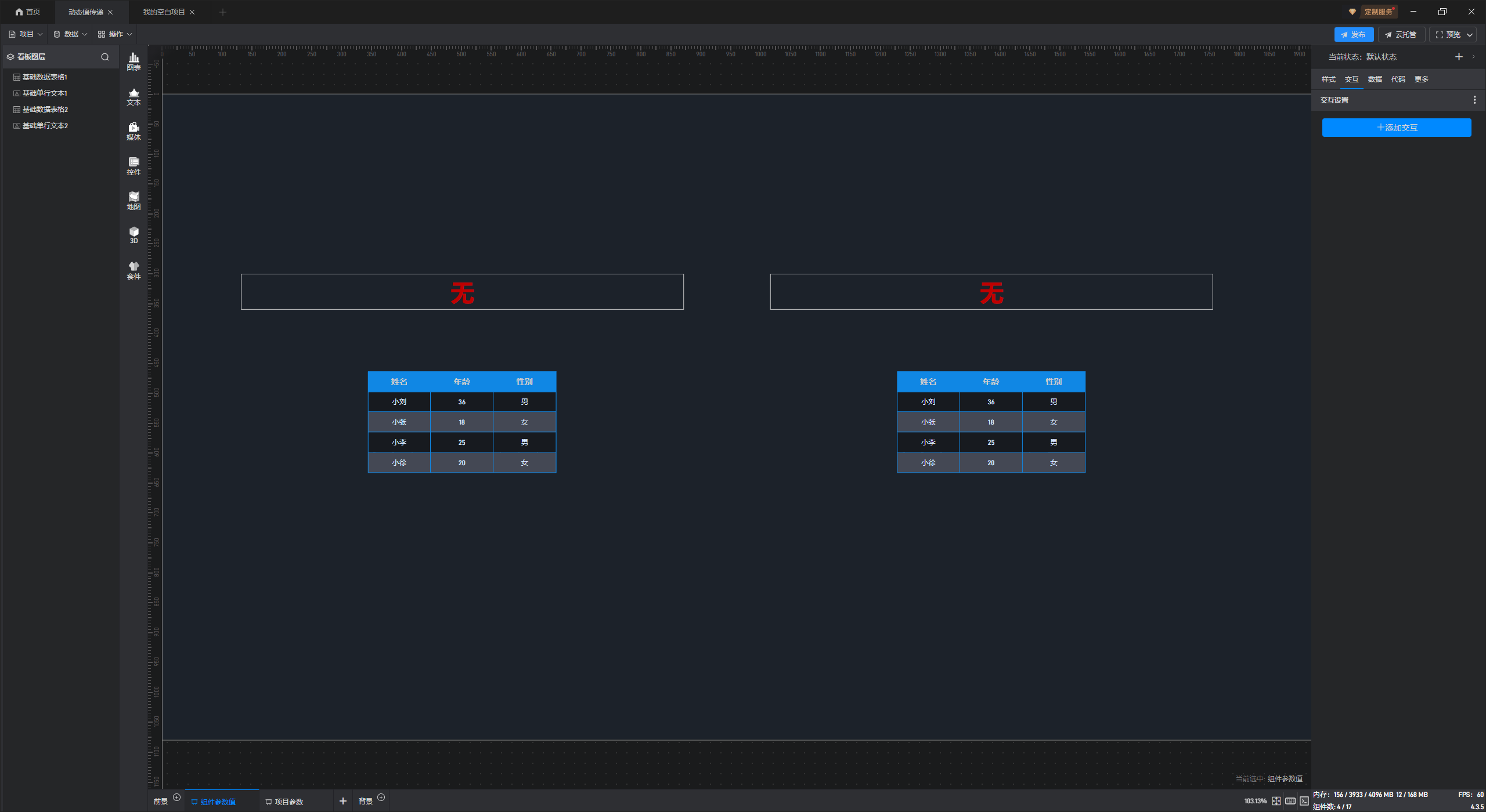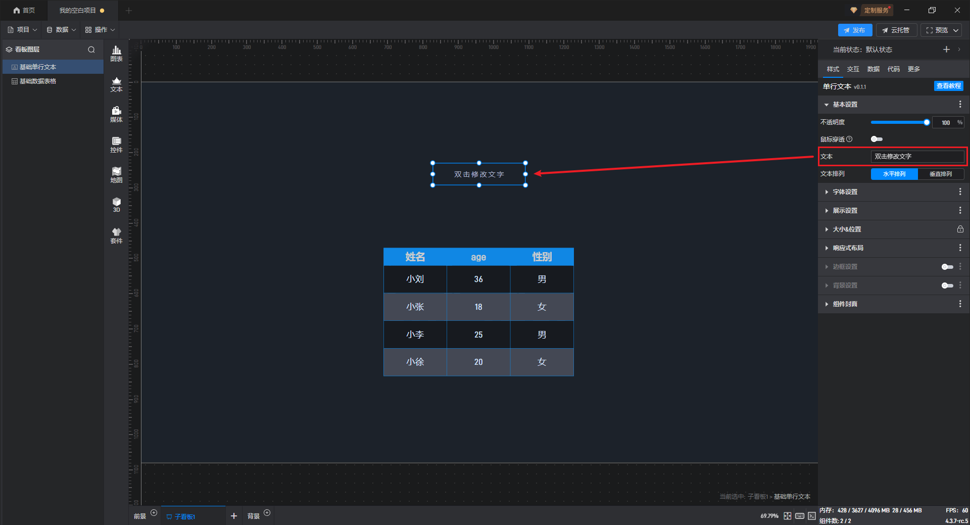 下面使用“基础单行文本”组件和“数据表格”组件进行演示,实现点击数据表格,基础单行文本显示对应的行号、列号和数据的效果。